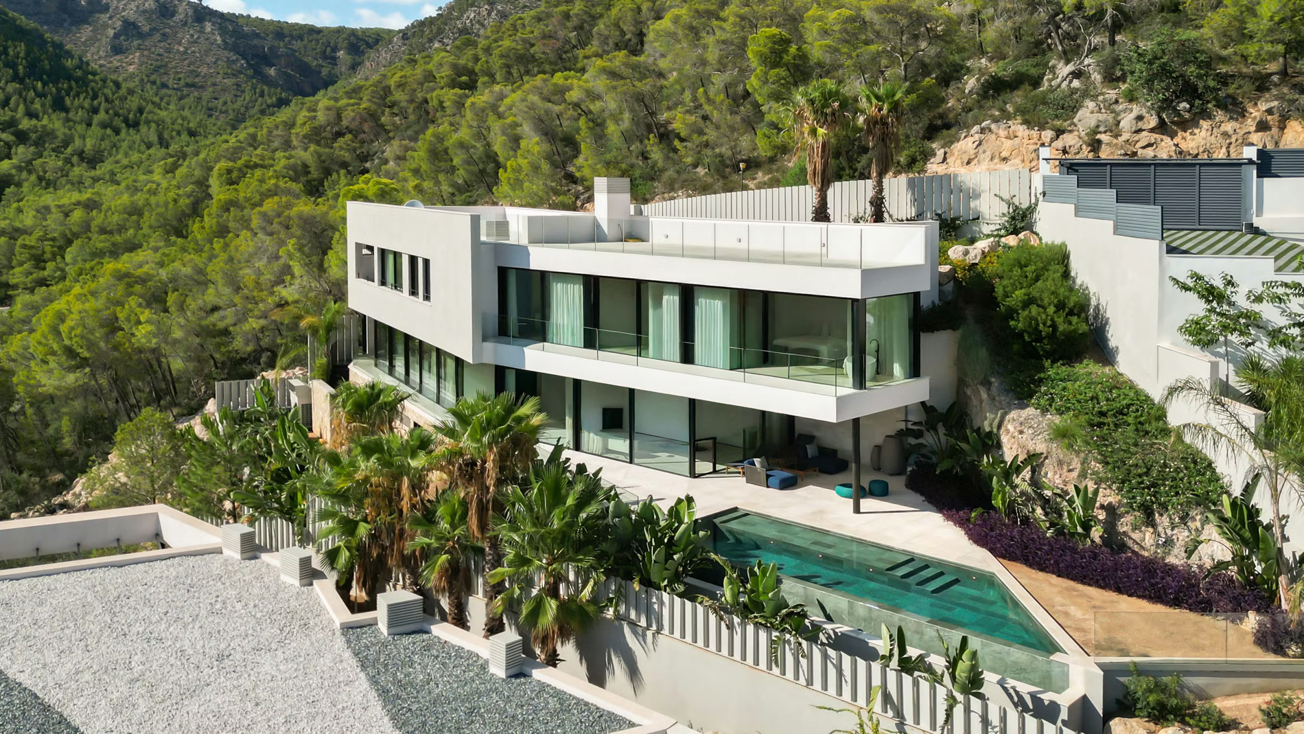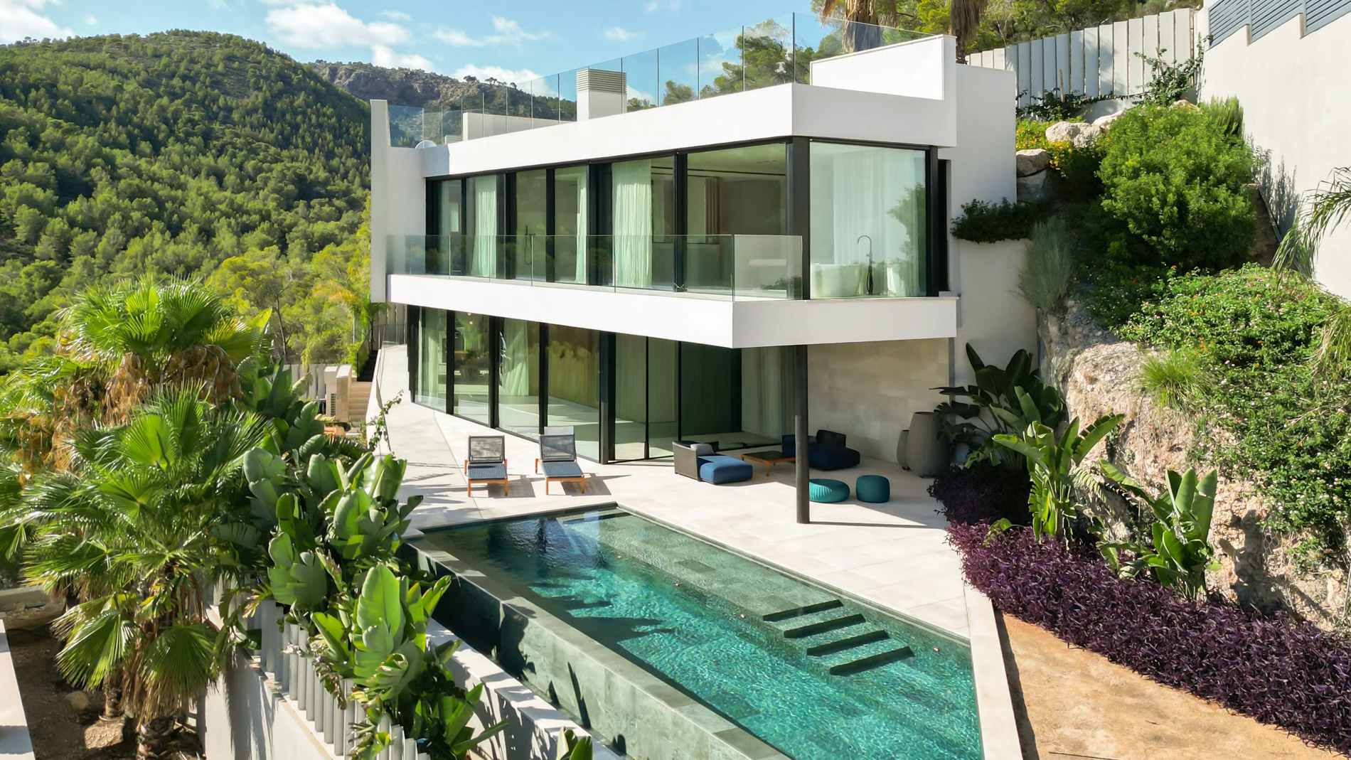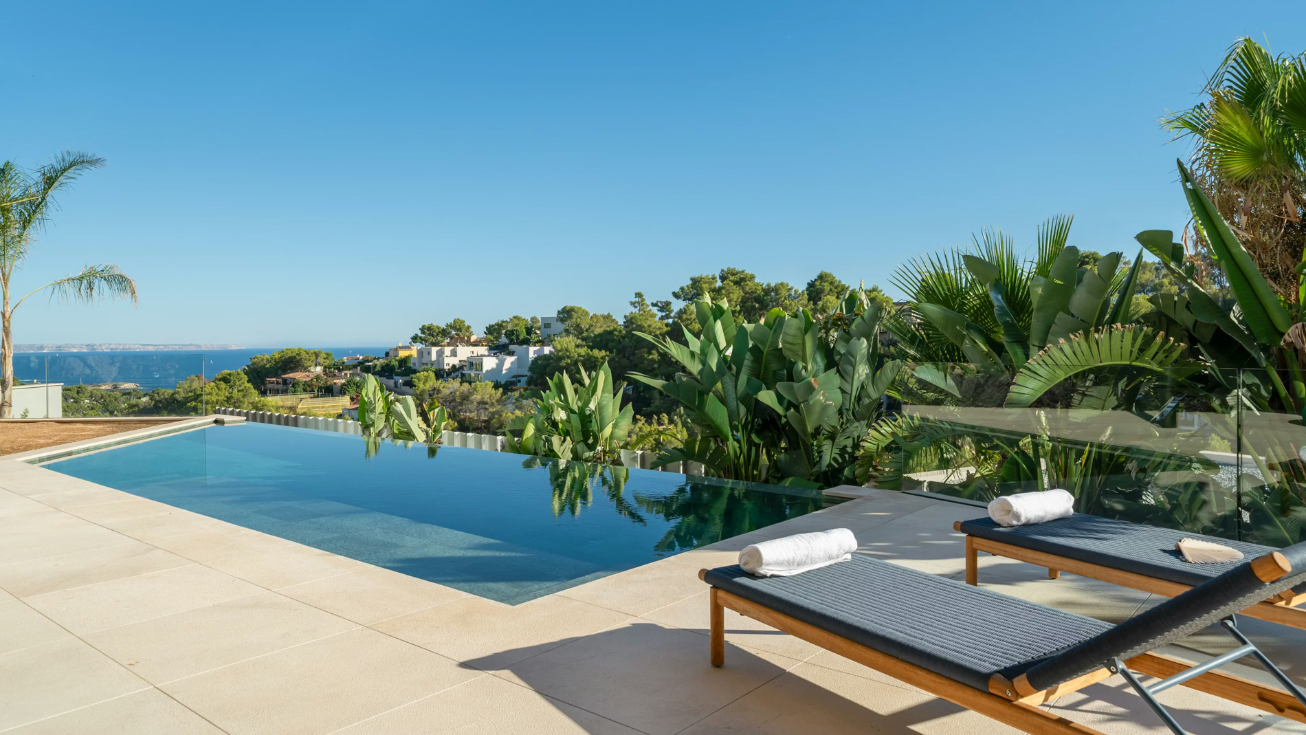 Die Villa befindet sich in Costa d’en Blanes, einer der exklusivsten Gegenden im Südwesten Mallorcas, nur wenige Minuten von Puerto Portals entfernt, bekannt für seine lebhafte Atmosphäre, luxuriöse Geschäfte, erstklassige Restaurants und den eleganten Yachthafen. Die Nähe zu wunderschönen Stränden und Golfplätzen sowie zu Palma und dem internationalen Flughafen macht diese Immobilie zu einer idealen Residenz sowohl für den dauerhaften Wohnsitz als auch für ein Ferienhaus.Die Villa ist auf mehrere Ebenen verteilt, die durch einen Aufzug und Treppen miteinander verbunden sind, wodurch Funktionalität maximiert wird, ohne auf Design zu verzichten.Beim Betreten der Villa gibt es zwei Parkplätze mit einer Drehplattform, die den Zugang zu den Fahrzeugen erleichtern. Die obere Etage beherbergt die Master-Suite mit eigenem Bad, Ankleidezimmer und Panoramablick auf das Meer. Auf dieser Etage befinden sich auch zwei zusätzliche Schlafzimmer, jedes mit eigenem Bad und geräumigen Einbauschränken. Darüber hinaus verbindet der Aufzug alle Ebenen der Villa, was jederzeit Komfort und Privatsphäre garantiert.Beim Hinuntergehen der Treppe befindet sich ein Gästebad sowie eine moderne offene Küche mit einer kleinen Dirty Kitchen und einer privaten Terrasse auf der rechten Seite. Das Wohnzimmer und der Essbereich befinden sich auf der linken Seite, wobei großzügige und helle Räume durch die bodentiefen Fenster entstehen. Von hier aus gelangt man auf eine Hauptterrasse, die mit einem spektakulären 57 m² großen Pool verbunden ist, an dem man sich entspannen und die Aussicht genießen kann. Außerdem befindet sich auf dieser Ebene ein zusätzliches Schlafzimmer mit unabhängigem Zugang zur Terrasse.Im Untergeschoss gibt es neben einem großen Mehrzweckraum, der als Fitnessraum, Spielzimmer oder privates Kino genutzt werden kann, auch eine Waschküche und einen Technikraum, der die Heizungs- und Klimaanlagensysteme der Villa beherbergt. Diese Etage bietet auch Zugang zu einer großen grünen Fläche mit zwei zusätzlichen Grundstücken, was eine großartige Möglichkeit bietet, die Privatsphäre zu genießen oder die Immobilie weiter auszubauen.Abschließend erreicht man über eine Treppe vom überdachten Parkplatz aus eine beeindruckende Solarium-Terrasse, die sich perfekt zum Sonnenbaden und Genießen der Panoramablick eignet.Die Villa ist mit Fußbodenheizung und Heizung\/Klima ausgestattet, die während des ganzen Jahres maximalen Komfort bieten. Zudem verfügt sie über eine geschlossene Garage für zwei Fahrzeuge und einen zusätzlichen Außenparkplatz. Es gibt auch die Möglichkeit, designmöbel zu erwerben, die perfekt den modernen und eleganten Stil der Villa ergänzen.