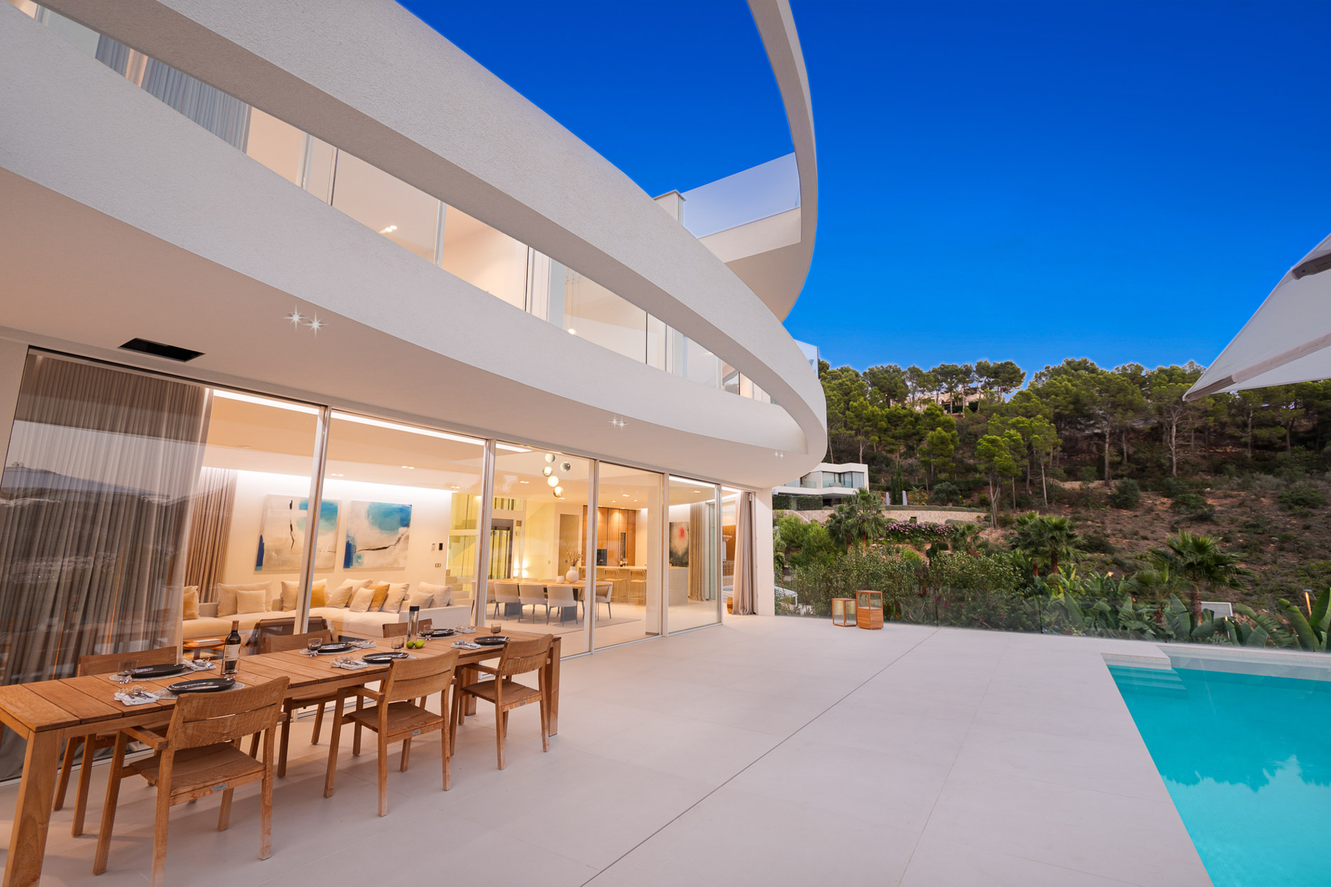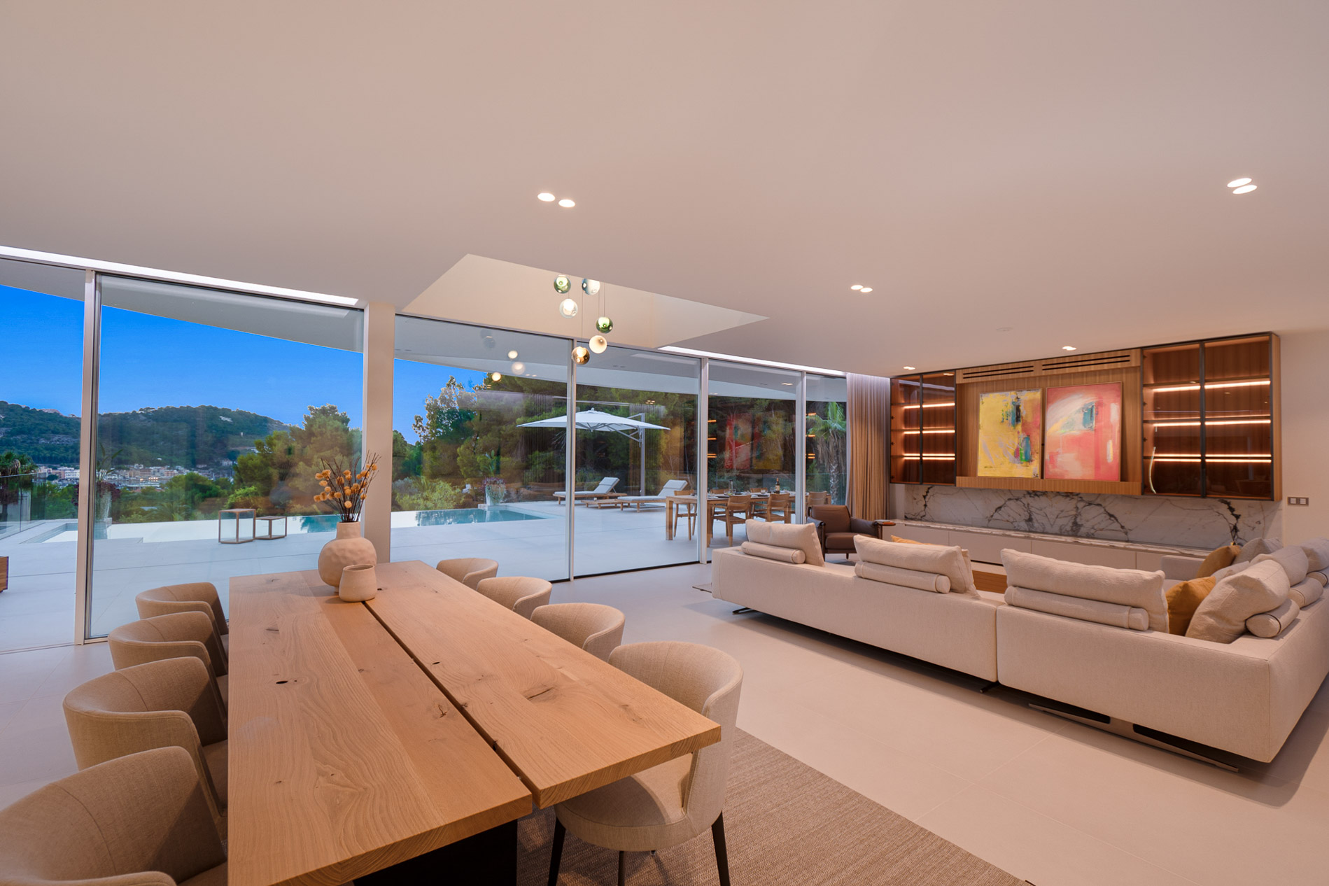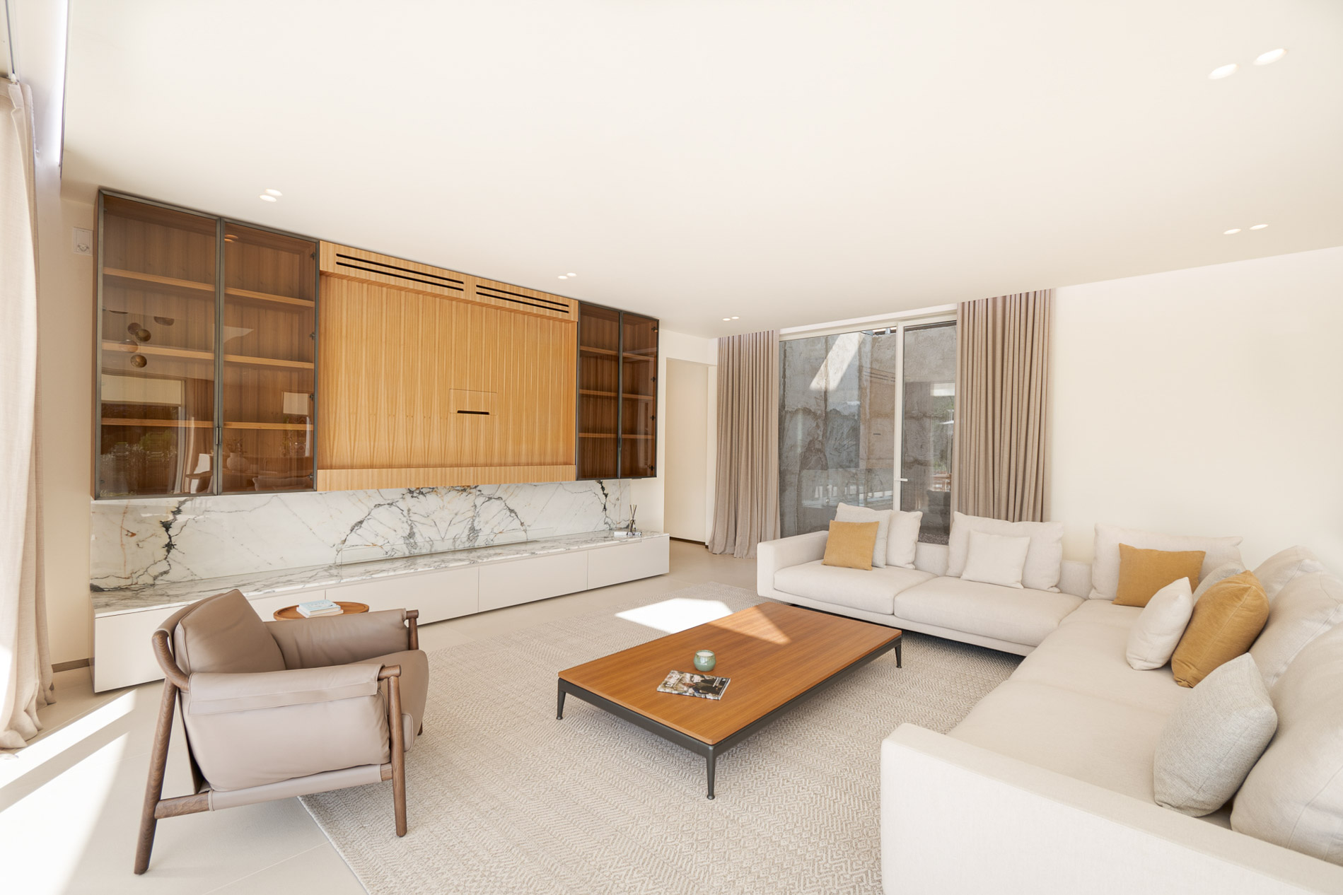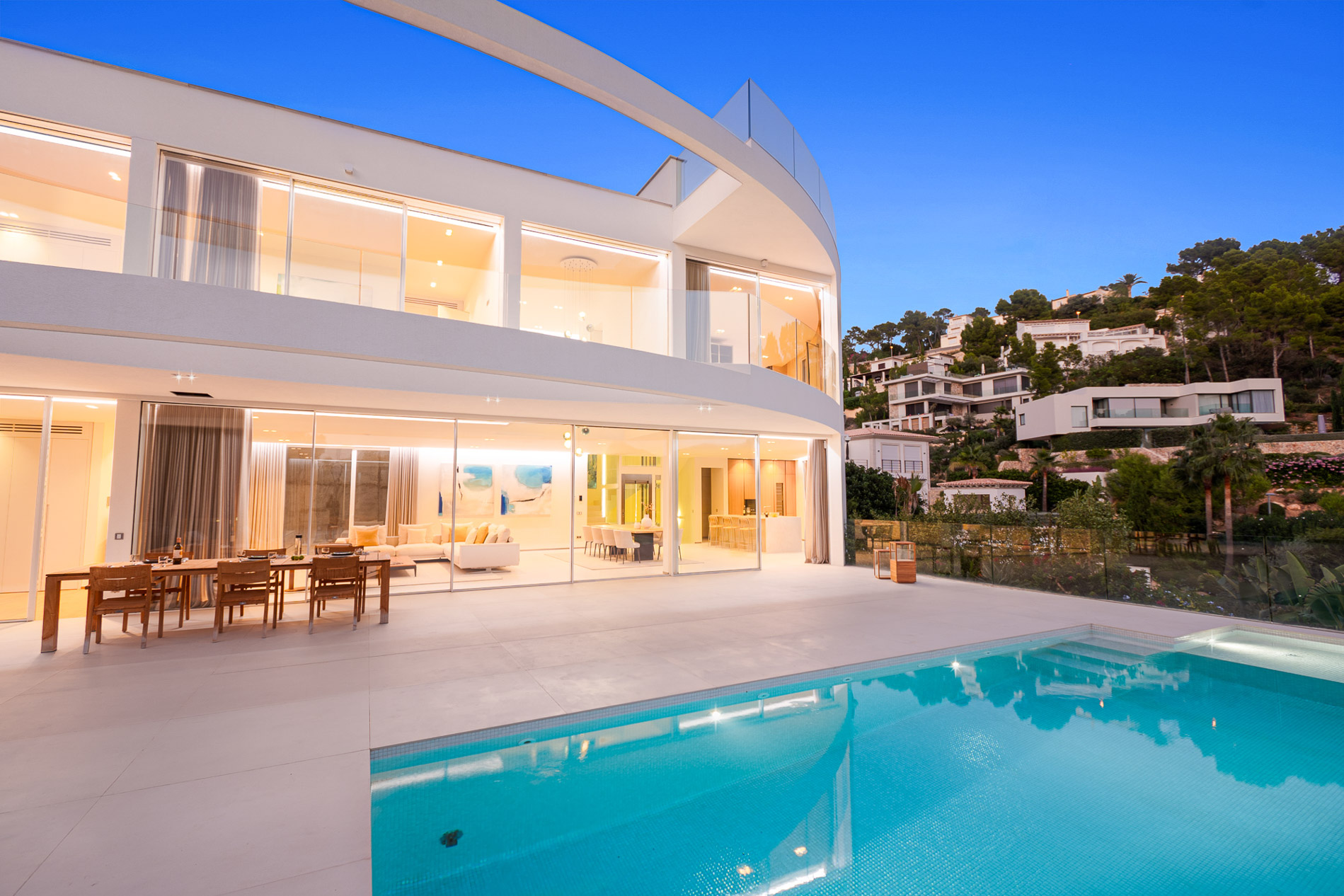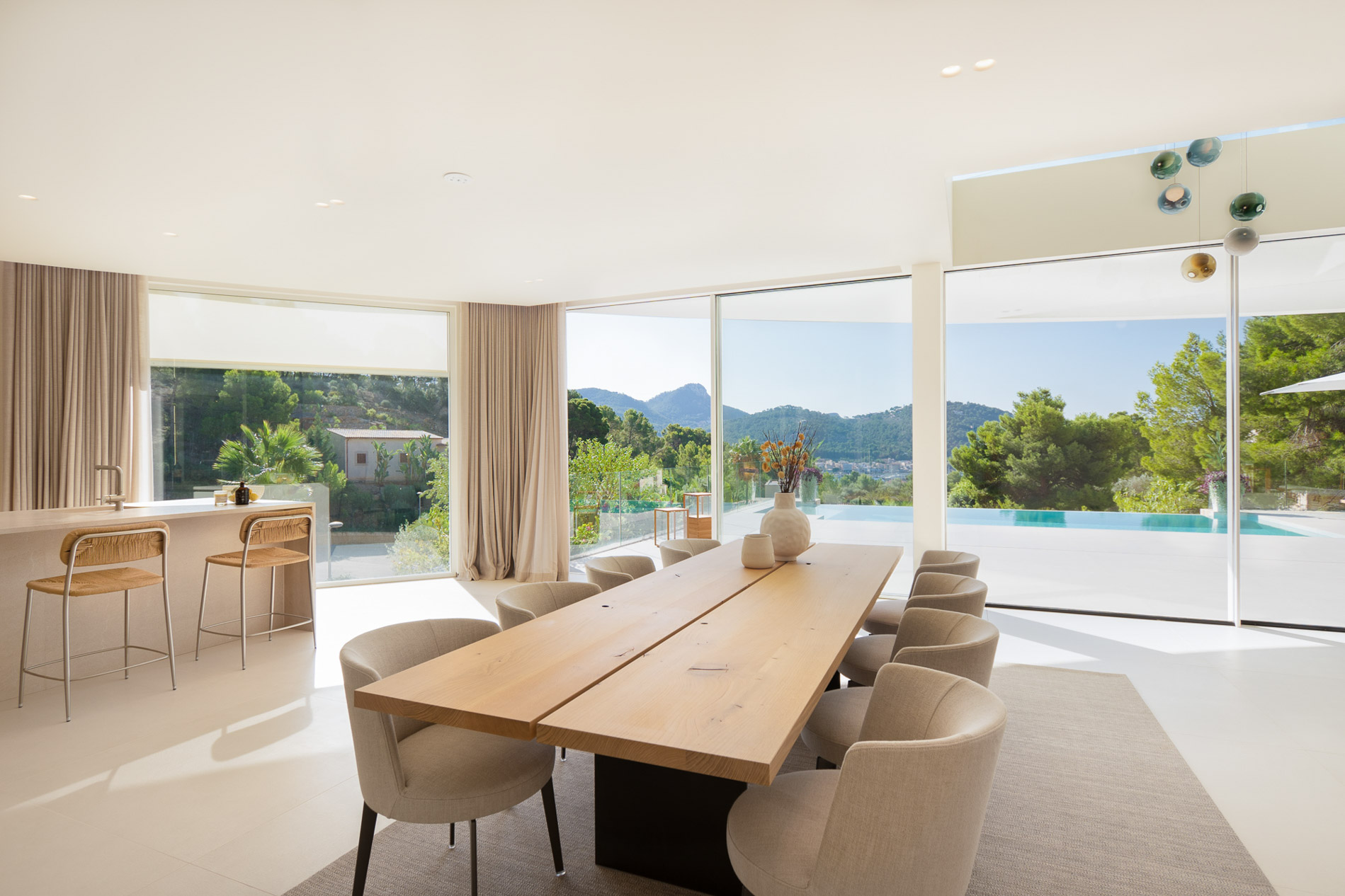 Im Herzen von Puerto de Andratx, Mallorca, steht eine Villa, die über herkömmliche Maßstäbe an Opulenz hinausgeht. Mit einer beeindruckenden Fläche von 791 m² ist diese Residenz ein Beweis für die Zusammenarbeit zwischen einem der renommiertesten Luxus-Innenarchitekturstudios Mallorcas und einer architektonischen Vision. Jede Ecke dieser Villa spiegelt eine tadellose Verschmelzung von zeitgenössischem Design und dem natürlichen Charme des mediterranen Archipels wider.Beim Betreten werden die Besucher von einem großzügigen Wohn- und Essbereich begrüßt, der nahtlos in eine voll ausgestattete „Poliform\/Gaggenau“-Designerküche integriert ist. Dieser sorgfältig gestaltete Raum strahlt eine Atmosphäre moderner Eleganz aus, die durch den kontinuierlichen Fluss natürlichen Lichts noch verstärkt wird. Die Villa verfügt über vier Schlafzimmer, jedes mit eigenem Bad, mit der Option, ein fünftes Schlafzimmer hinzuzufügen.Dieses Anwesen beherbergt eine Reihe außergewöhnlicher Elemente, die ihm ein unvergleichliches Maß an Luxus verleihen. Wenn Sie die weitläufige 141 m² große Terrasse betreten, die Sie durch motorisierte französische Türen vom Wohnzimmer aus erreichen, werden Sie von einem einladenden Salzwasser-Infinity-Pool begrüßt. Die Terrasse dient als Zufluchtsort zum Sonnenbaden, zur Bewirtung von Gästen oder einfach zum Genießen der bezaubernden Aussicht auf die mediterrane Landschaft. Für diejenigen, die einen noch höheren Aussichtspunkt suchen, führt ein gläserner Aufzug auf die Dachterrasse, wo sich ein eleganter Ruhebereich befindet. Unter dem weiten Himmel Mallorcas können sich die Bewohner an einer ungehinderten Aussicht erfreuen, die bis zum Horizont reicht.Fotos LovaDesignStudio