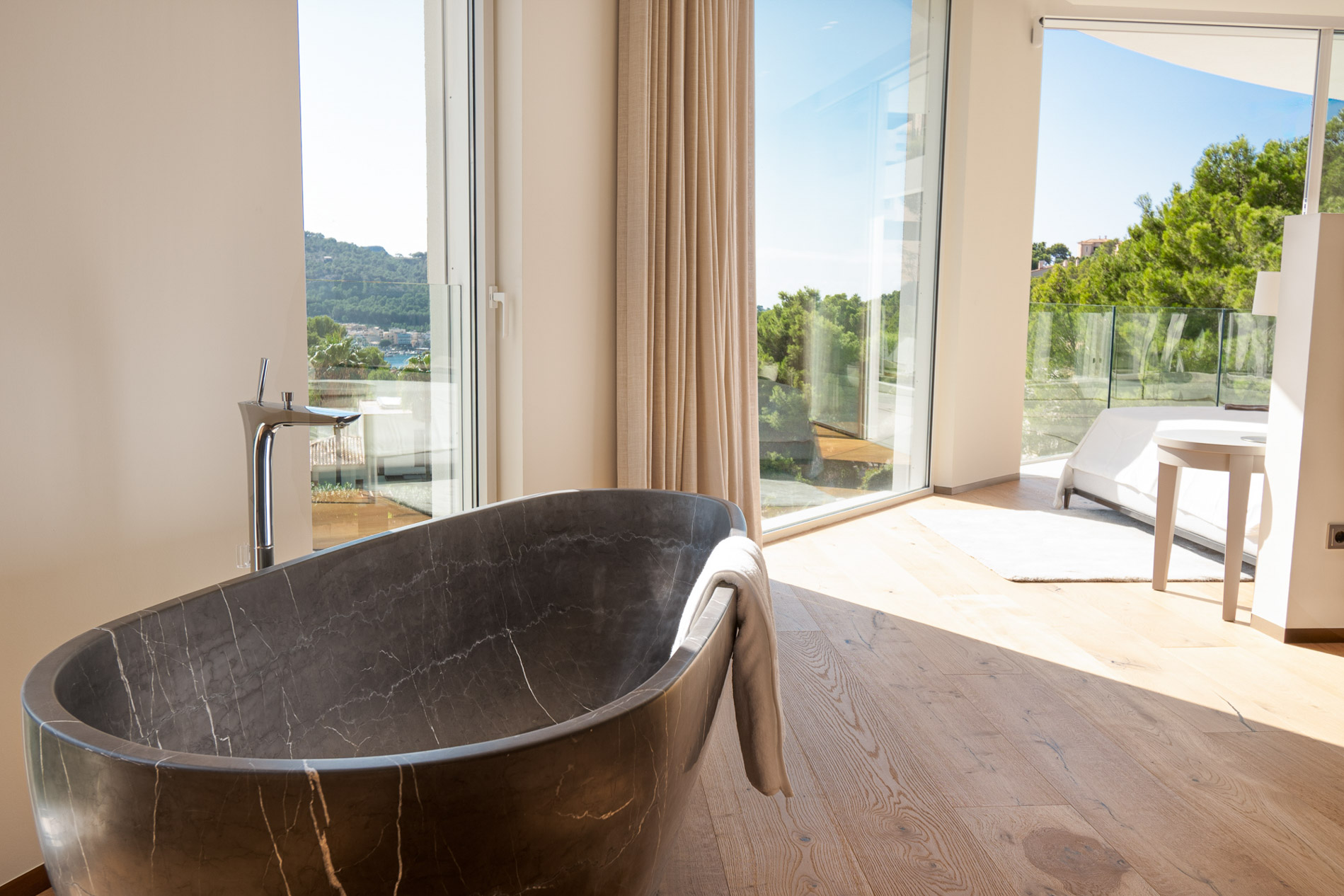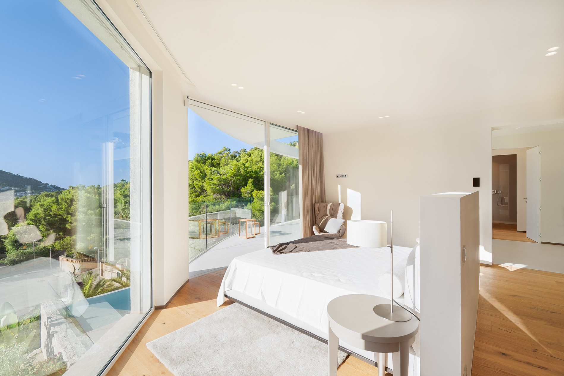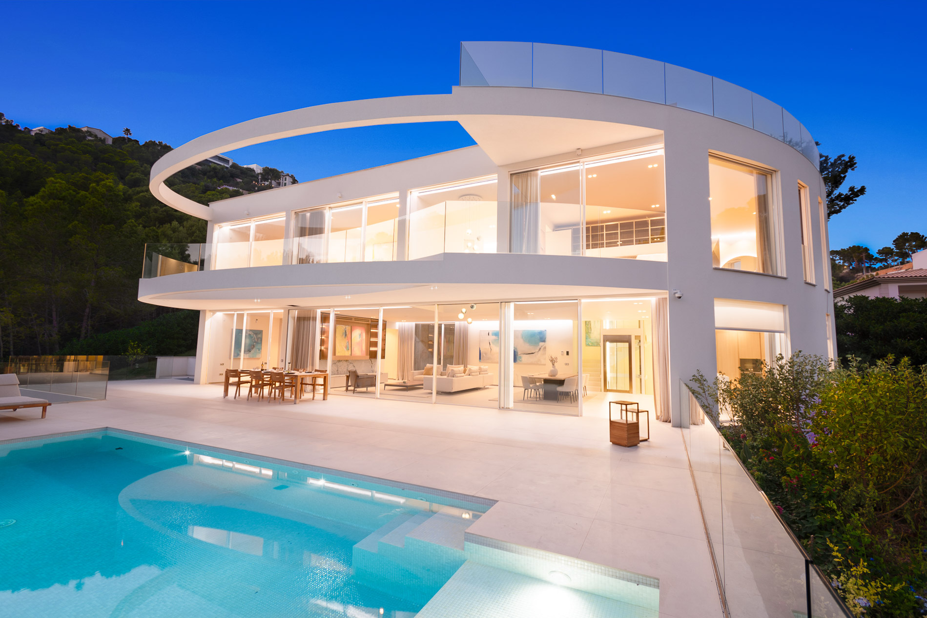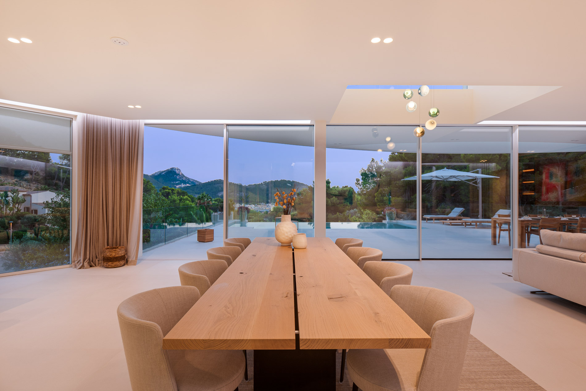 Im Herzen von Puerto de Andratx, Mallorca, steht eine Villa, die über herkömmliche Maßstäbe an Opulenz hinausgeht. Mit einer beeindruckenden Fläche von 791 m² ist diese Residenz ein Beweis für die Zusammenarbeit zwischen einem der renommiertesten Luxus-Innenarchitekturstudios Mallorcas und einer architektonischen Vision. Jede Ecke dieser Villa spiegelt eine tadellose Verschmelzung von zeitgenössischem Design und dem natürlichen Charme des mediterranen Archipels wider.Beim Betreten werden die Besucher von einem großzügigen Wohn- und Essbereich begrüßt, der nahtlos in eine voll ausgestattete „Poliform\/Gaggenau“-Designerküche integriert ist. Dieser sorgfältig gestaltete Raum strahlt eine Atmosphäre moderner Eleganz aus, die durch den kontinuierlichen Fluss natürlichen Lichts noch verstärkt wird. Die Villa verfügt über vier Schlafzimmer, jedes mit eigenem Bad, mit der Option, ein fünftes Schlafzimmer hinzuzufügen.Dieses Anwesen beherbergt eine Reihe außergewöhnlicher Elemente, die ihm ein unvergleichliches Maß an Luxus verleihen. Wenn Sie die weitläufige 141 m² große Terrasse betreten, die Sie durch motorisierte französische Türen vom Wohnzimmer aus erreichen, werden Sie von einem einladenden Salzwasser-Infinity-Pool begrüßt. Die Terrasse dient als Zufluchtsort zum Sonnenbaden, zur Bewirtung von Gästen oder einfach zum Genießen der bezaubernden Aussicht auf die mediterrane Landschaft. Für diejenigen, die einen noch höheren Aussichtspunkt suchen, führt ein gläserner Aufzug auf die Dachterrasse, wo sich ein eleganter Ruhebereich befindet. Unter dem weiten Himmel Mallorcas können sich die Bewohner an einer ungehinderten Aussicht erfreuen, die bis zum Horizont reicht.Fotos LovaDesignStudio