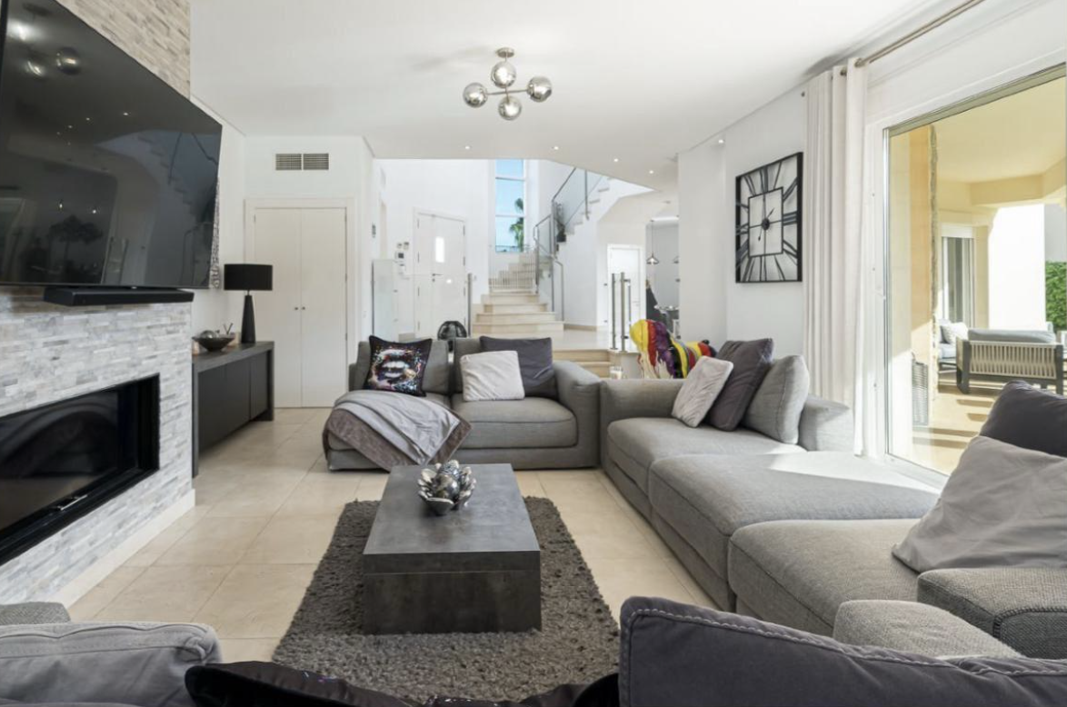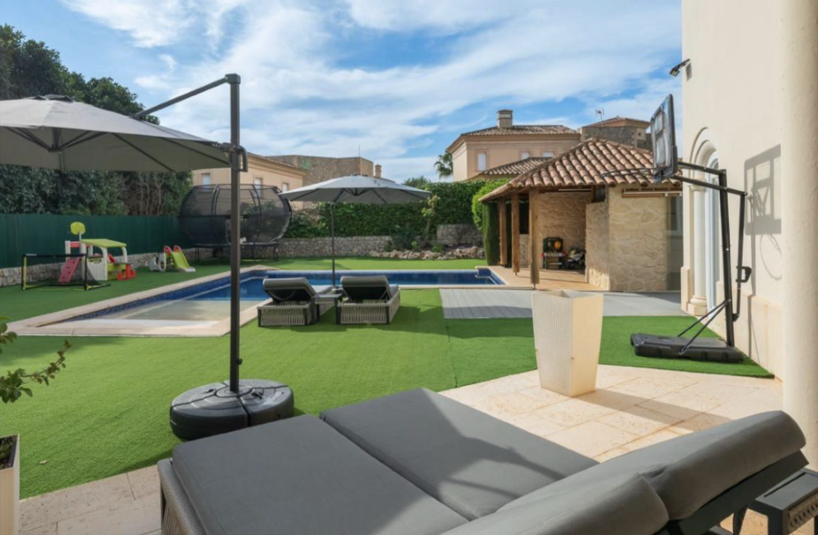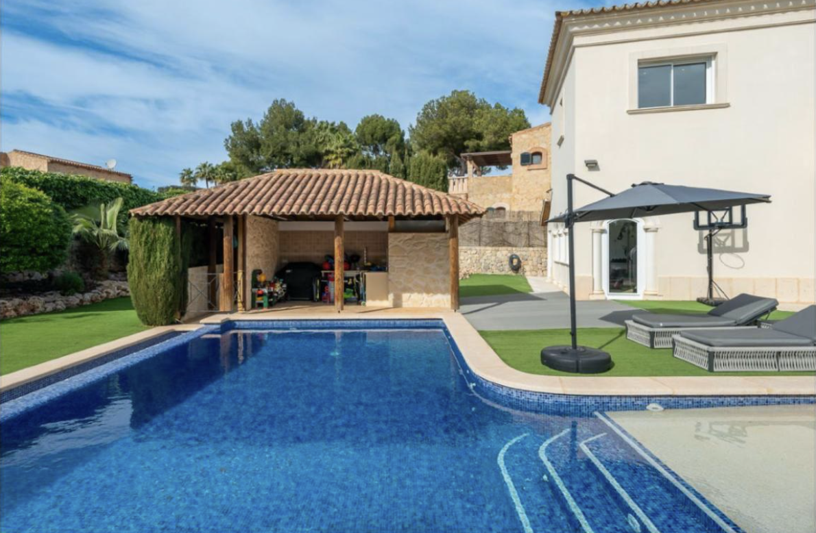 Diese Villa im angesehenen Viertel Nova Santa Ponsa vereint auf harmonische Weise mediterranen Charme mit modernem Komfort. Die Architektur schafft eine ausgewogene Verbindung von Tradition und zeitgemäßem Design – eingebettet in eine ruhige, private Umgebung im Südwesten Mallorcas.Beim Betreten des Hauses führt eine elegante Treppe in das Obergeschoss, wo sich vier Schlafzimmer befinden. Das Hauptschlafzimmer verfügt über ein eigenes Bad und eine großzügige private Terrasse. Ein weiteres Schlafzimmer hat ebenfalls ein Bad en suite, während die beiden anderen sich ein voll ausgestattetes Badezimmer teilen. Alle drei Etagen sind bequem mit einem Aufzug verbunden.Im Erdgeschoss führen zwei Stufen hinunter in ein gemütliches Wohnzimmer mit Kamin – perfekt für Winterabende – und direktem Zugang zur geschützten Terrasse. Ein praktischer Einbauschrank bietet Platz für Jacken und Taschen. Neben dem Wohnzimmer befindet sich ein helles Arbeitszimmer mit großem Fenster, gefolgt von einem privaten Fitnessraum mit Dusche – ideal für Sport und Entspannung zu Hause.Das geräumige Esszimmer ist dank großer Fenster lichtdurchflutet und bietet Blick auf den Pool mit elektrischen Rollläden. Direkt daneben liegt die moderne Küche mit zentraler Kochinsel und reichlich Stauraum – perfekt für den Alltag und für Gäste.Im Außenbereich lädt ein gepflegter Garten mit Obstbäumen – darunter ein Weinstock, ein Orangenbaum, zwei Zitronenbäume und frische Minze – zum Entspannen ein. Die Grillzone mit Dusche und Abstellraum ist das Herzstück des Sommers. Im Untergeschoss befinden sich ein zusätzliches Doppelschlafzimmer mit Bad, natürlicher Belüftung, ein weiterer Abstellraum sowie eine große Garage für zwei Fahrzeuge.Die Villa ist mit zentraler Klimaanlage ausgestattet und bietet das ganze Jahr über hohen Wohnkomfort – nur wenige Minuten entfernt vom eleganten Yachthafen Port Adriano mit seinen erstklassigen Restaurants und maritimem Flair.