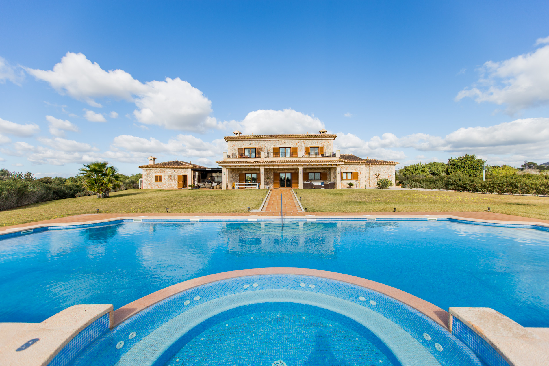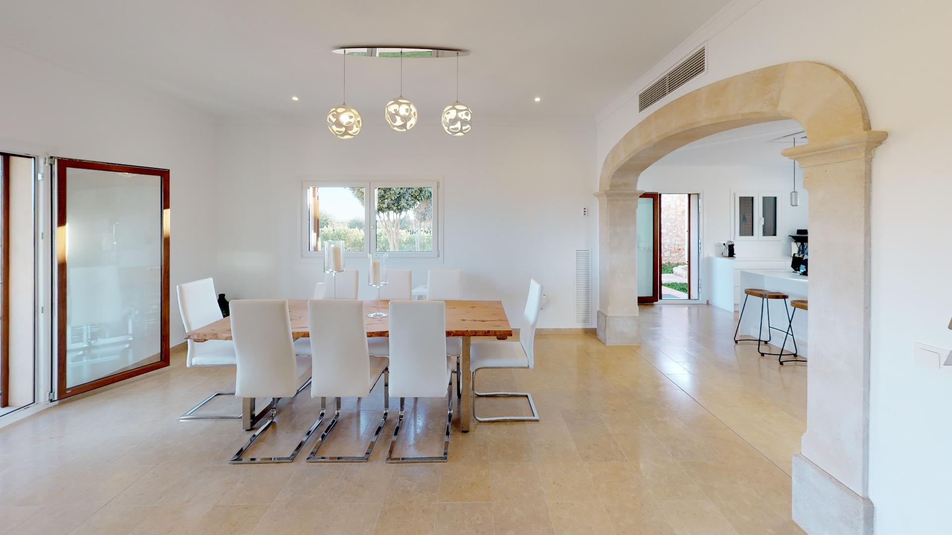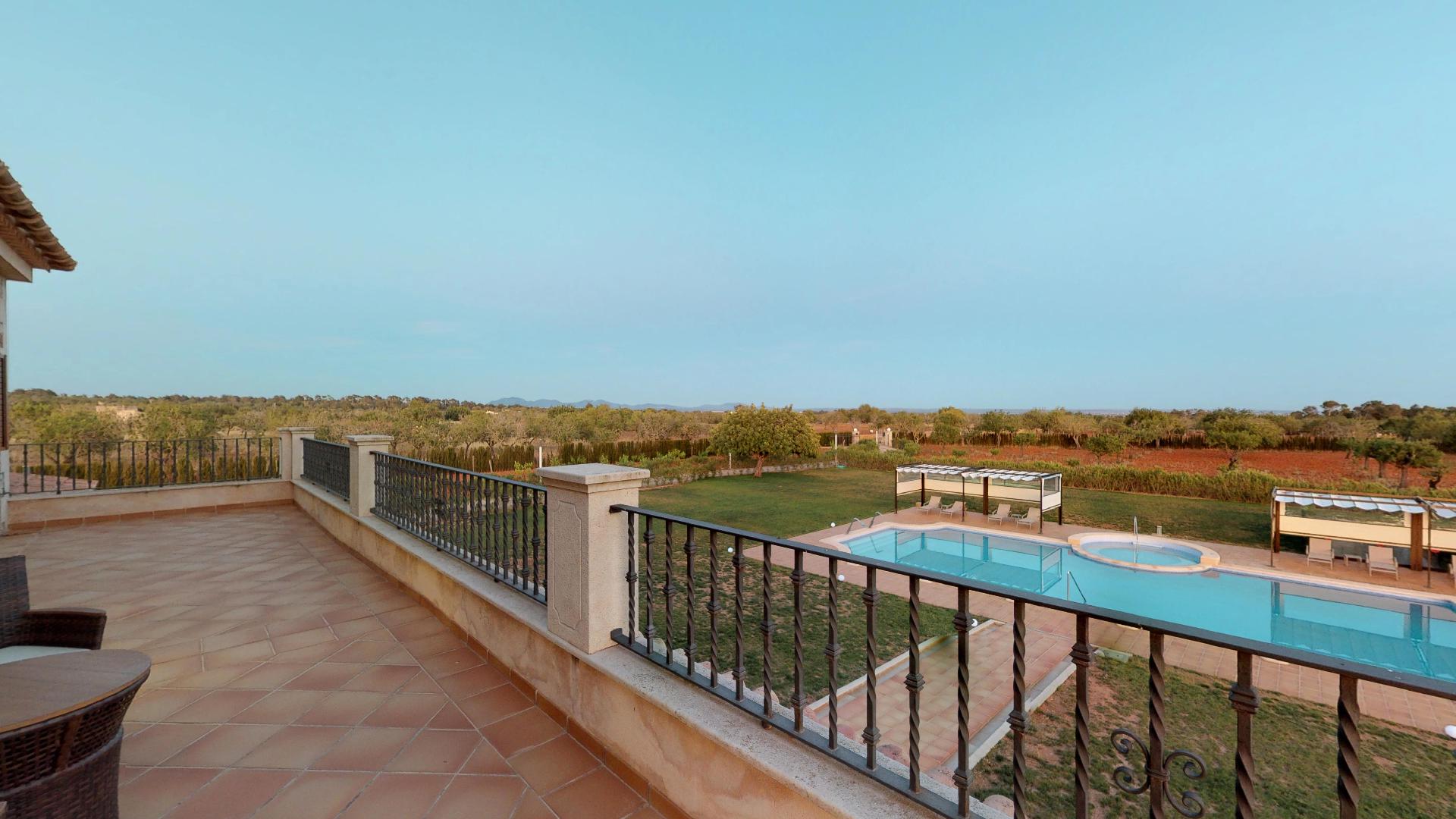 This country house, built with high quality materials, is situated between Llucmajor and Campos. The extensive plot of 21,000 m² contains an olive grove, fruit trees and vines, which provide the privacy and tranquillity to enjoy the impressive 20x10 m swimming pool with Jacuzzi and water jets.The beautiful stone-walled courtyard entrance, situated on the ground floor, leads into a spacious entrance hall with a winding staircase to the upper floor. In front of the hall is a spacious living room with panoramic views of the covered porch, garden and pool area. This room also has direct access to a large dining room.To the right of the hall is an ample kitchen area, which communicates to the dining room through a stoned archway. The kitchen also has access, via a partly covered patio, to a utility room, a boiler room and a double garage.Three double bedrooms are also situated on the ground floor, in a quiet, secluded area to the left of the hall, each with its own on suite bathroom and fitted wardrobes.Located on the first floor, is a large master suite consisting of a spacious bedroom\/sitting room, dressing room and en suite bathroom with a Jacuzzi and separate shower room. From the large open terrace, the master suite has picturesque views of the countryside, the Mediterranean Sea and Cabrera.MallorcaSite, your real estate agency in Mallorca, recommends this property for its location, quality of construction, its privacy and its amazing swimming pool.