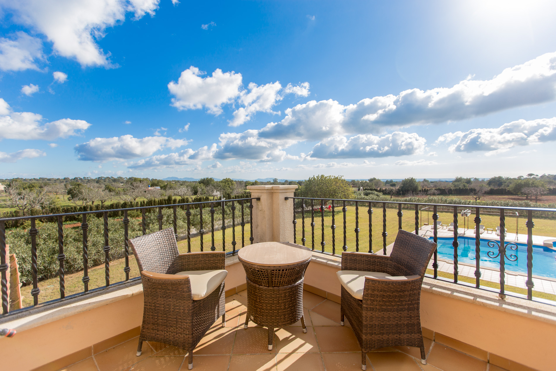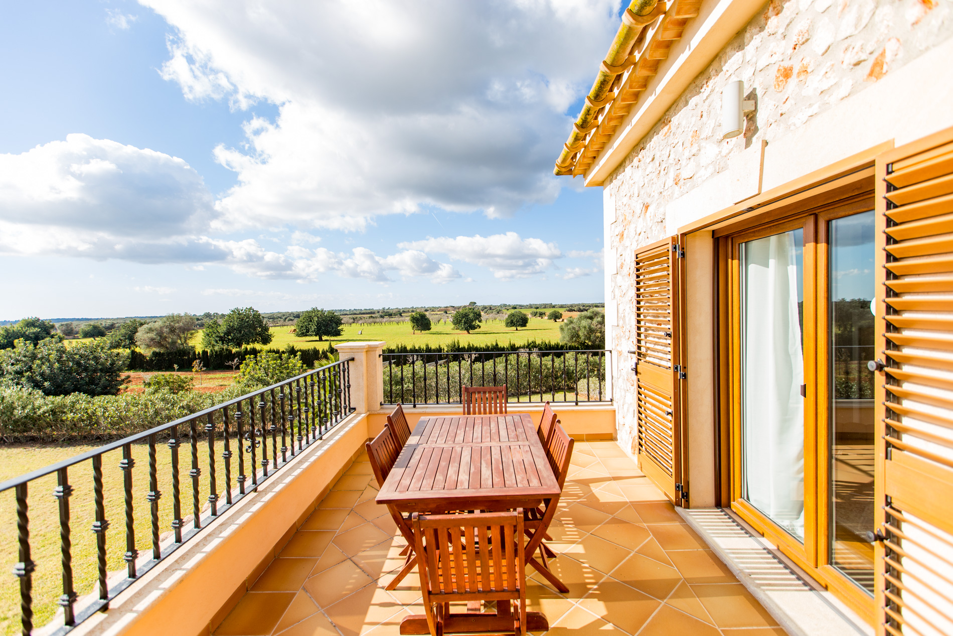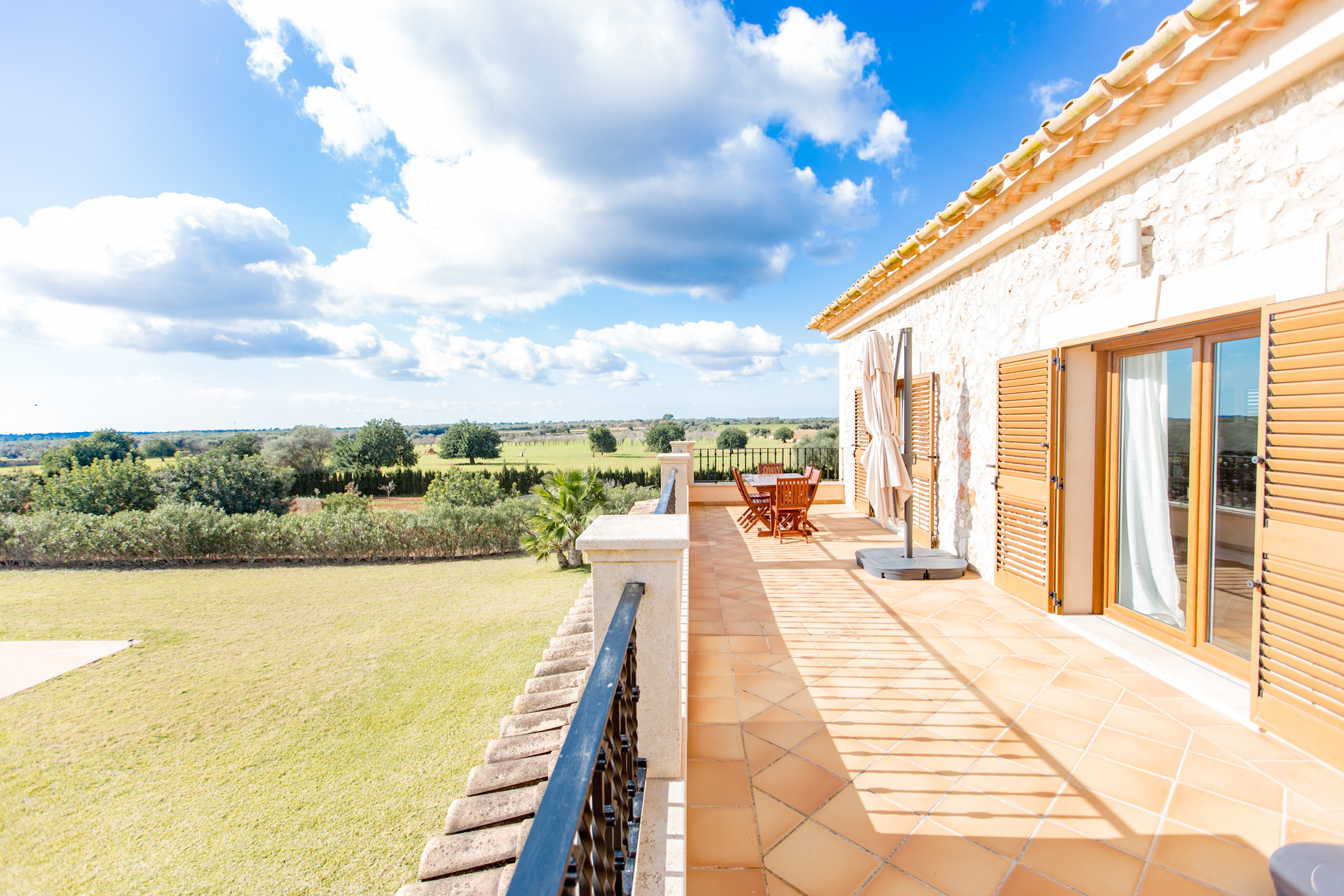 This country house, built with high quality materials, is situated between Llucmajor and Campos. The extensive plot of 21,000 m² contains an olive grove, fruit trees and vines, which provide the privacy and tranquillity to enjoy the impressive 20x10 m swimming pool with Jacuzzi and water jets.The beautiful stone-walled courtyard entrance, situated on the ground floor, leads into a spacious entrance hall with a winding staircase to the upper floor. In front of the hall is a spacious living room with panoramic views of the covered porch, garden and pool area. This room also has direct access to a large dining room.To the right of the hall is an ample kitchen area, which communicates to the dining room through a stoned archway. The kitchen also has access, via a partly covered patio, to a utility room, a boiler room and a double garage.Three double bedrooms are also situated on the ground floor, in a quiet, secluded area to the left of the hall, each with its own on suite bathroom and fitted wardrobes.Located on the first floor, is a large master suite consisting of a spacious bedroom\/sitting room, dressing room and en suite bathroom with a Jacuzzi and separate shower room. From the large open terrace, the master suite has picturesque views of the countryside, the Mediterranean Sea and Cabrera.MallorcaSite, your real estate agency in Mallorca, recommends this property for its location, quality of construction, its privacy and its amazing swimming pool.