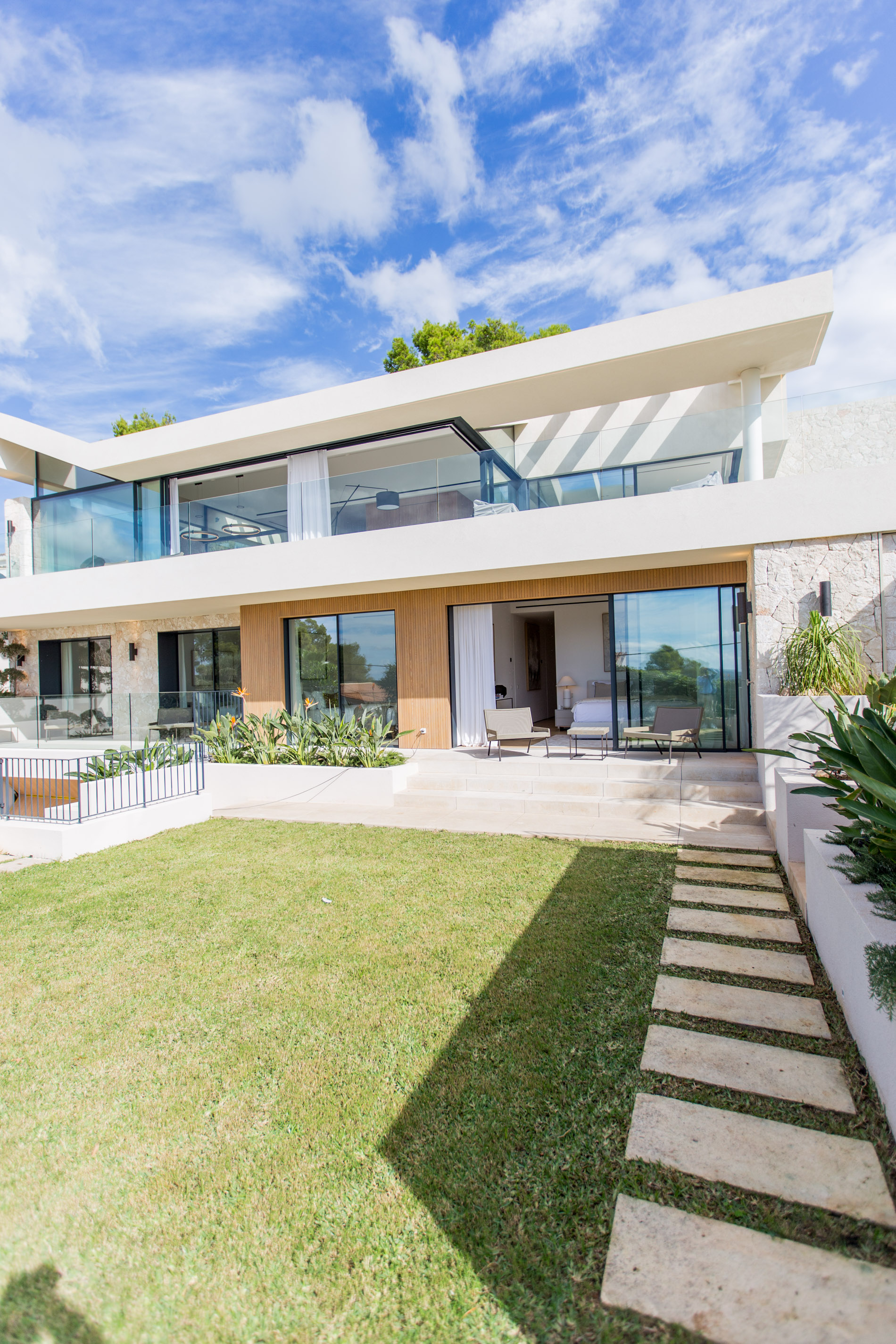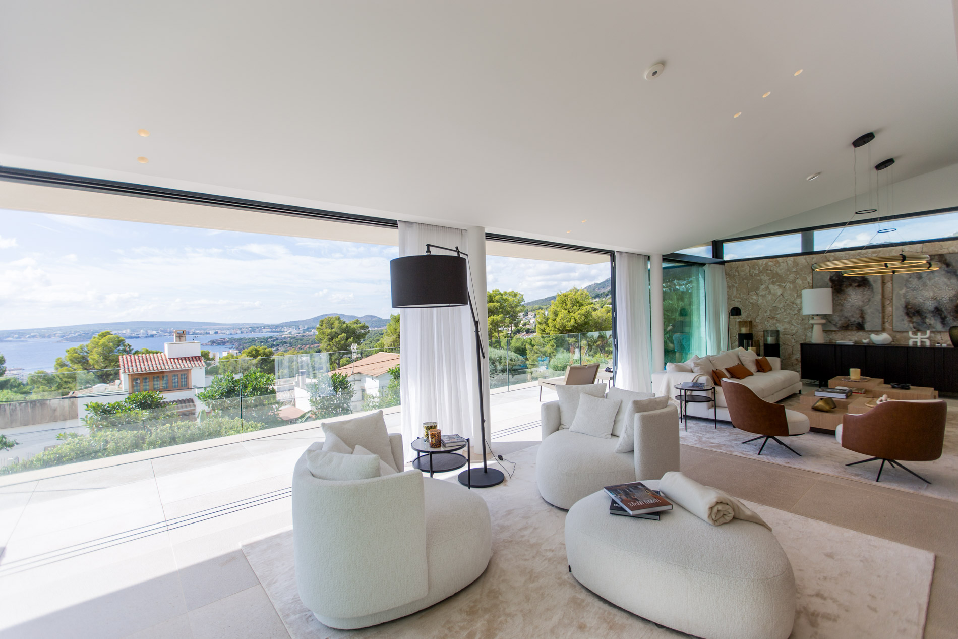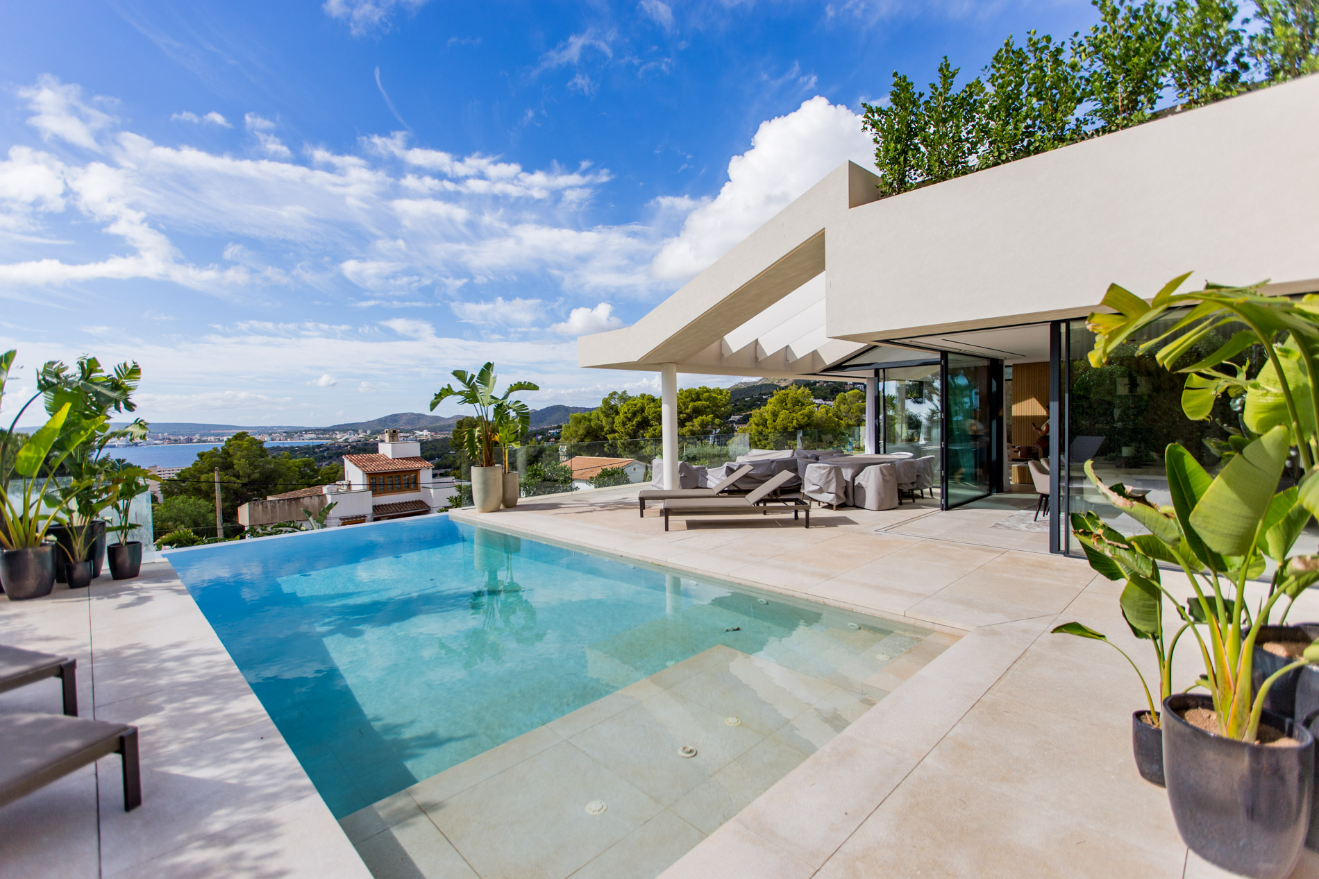 Located in the southwest of Mallorca, in the sought-after area of Puerto Portals, this villa is just steps away from the beach, restaurants, supermarkets, and prestigious international schools. Additionally, it is only 5 minutes from an exclusive golf course and the iconic Puerto Portals marina, where the sophistication of luxury yachts and exclusive boutiques contrasts with the natural serenity of the surroundings.Designed by a renowned architect, the villa stands out for its prime location in one of the island's most exclusive areas. For those seeking peace and relaxation, the nearby coves, such as Cala Bendinat, surrounded by lush Mediterranean pine forests, offer the perfect retreat.The villa perfectly combines traditional Mallorcan architecture with cutting-edge technology, creating a unique style that sets it apart from other luxury properties. The four bedrooms, all on the ground floor, feature en-suite bathrooms and carefully crafted details. Smart home technology and a sophisticated energy system, including solar panels and aerothermal technology, ensure maximum comfort to enjoy every moment in this extraordinary place.The upper floor reveals a beautiful central patio that connects all levels of the home, surrounded by a spacious kitchen with an island, a large dining area, and an elegant living room. Each of these areas opens onto a large terrace with a pool, offering the ideal space for relaxation and outdoor entertainment.The property also boasts a generous basement with a garage, a laundry area, and a spacious solarium terrace with an outdoor kitchen, perfect for enjoying dinners under the stars.The interior design reflects the majesty of the marine surroundings, with floor-to-ceiling panoramic windows, clean lines, and natural elements of wood and stone, creating a warm and sophisticated atmosphere.The meticulously designed Mediterranean garden integrates a selection of plants that accentuate the villa’s unique lifestyle. The entire setting invites relaxation and enjoyment of outdoor living in an idyllic environment.MallorcaSite, your trusted real estate agency, recommends this property for its high-quality finishes, unmatched views, and luxurious amenities that make it a true gem in the heart of the Mediterranean.