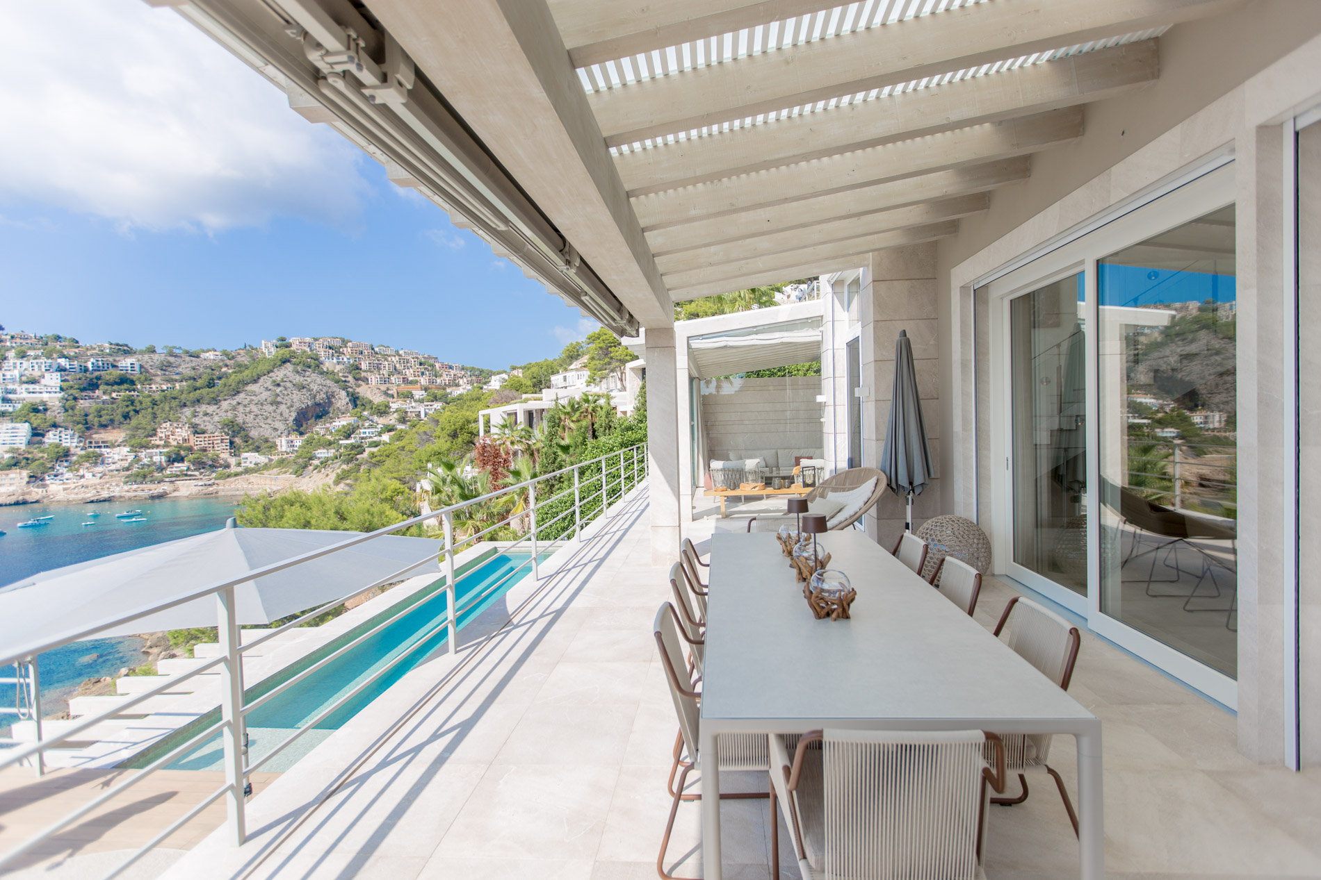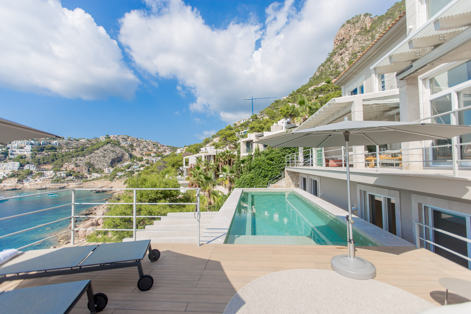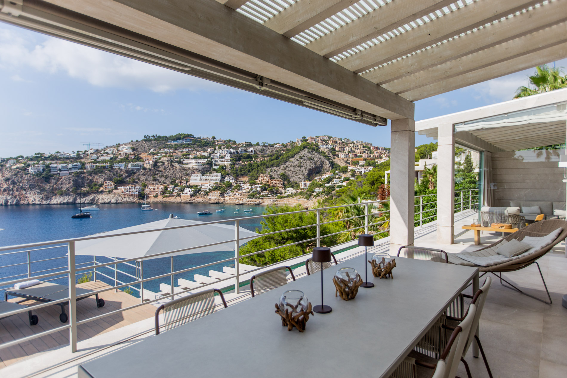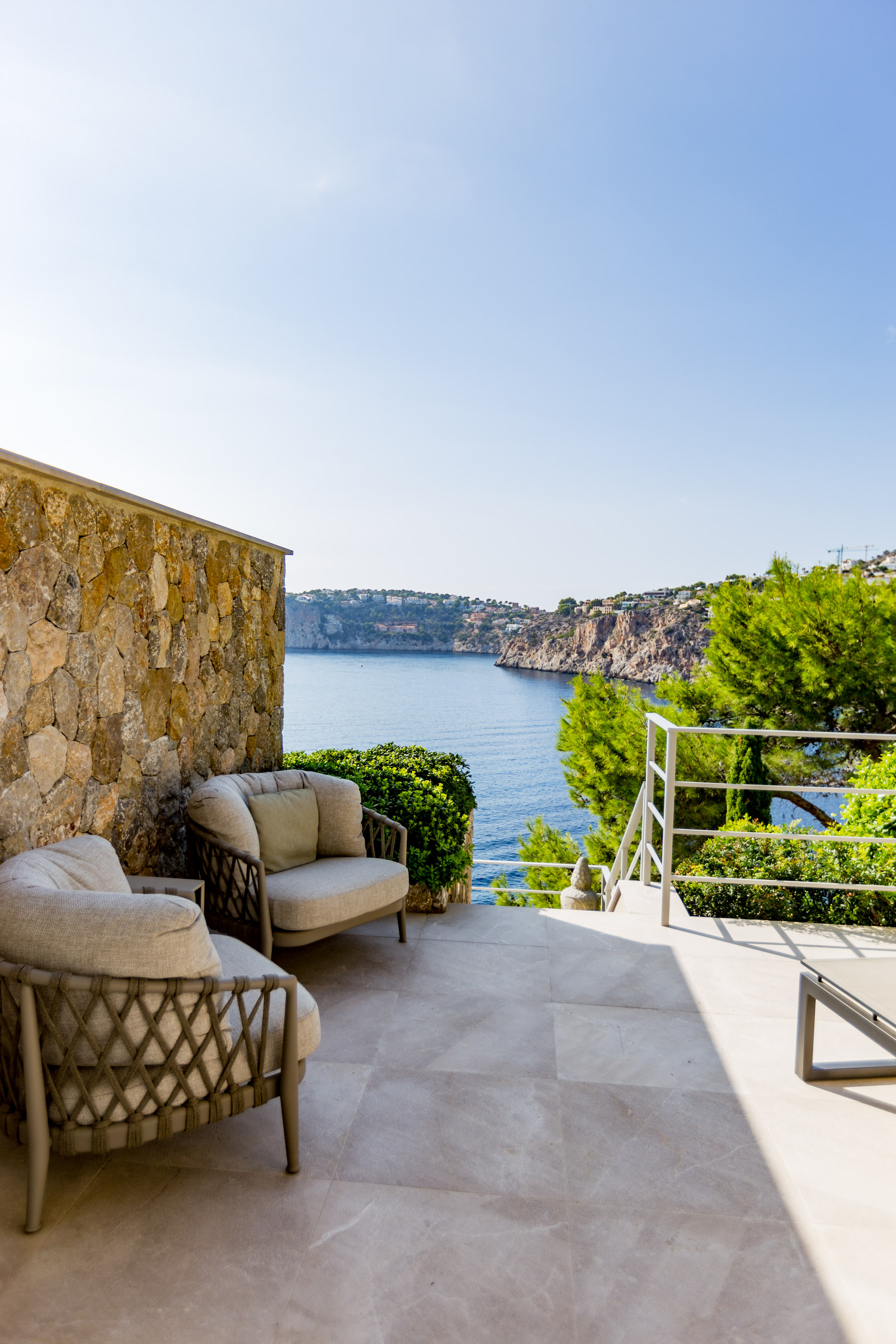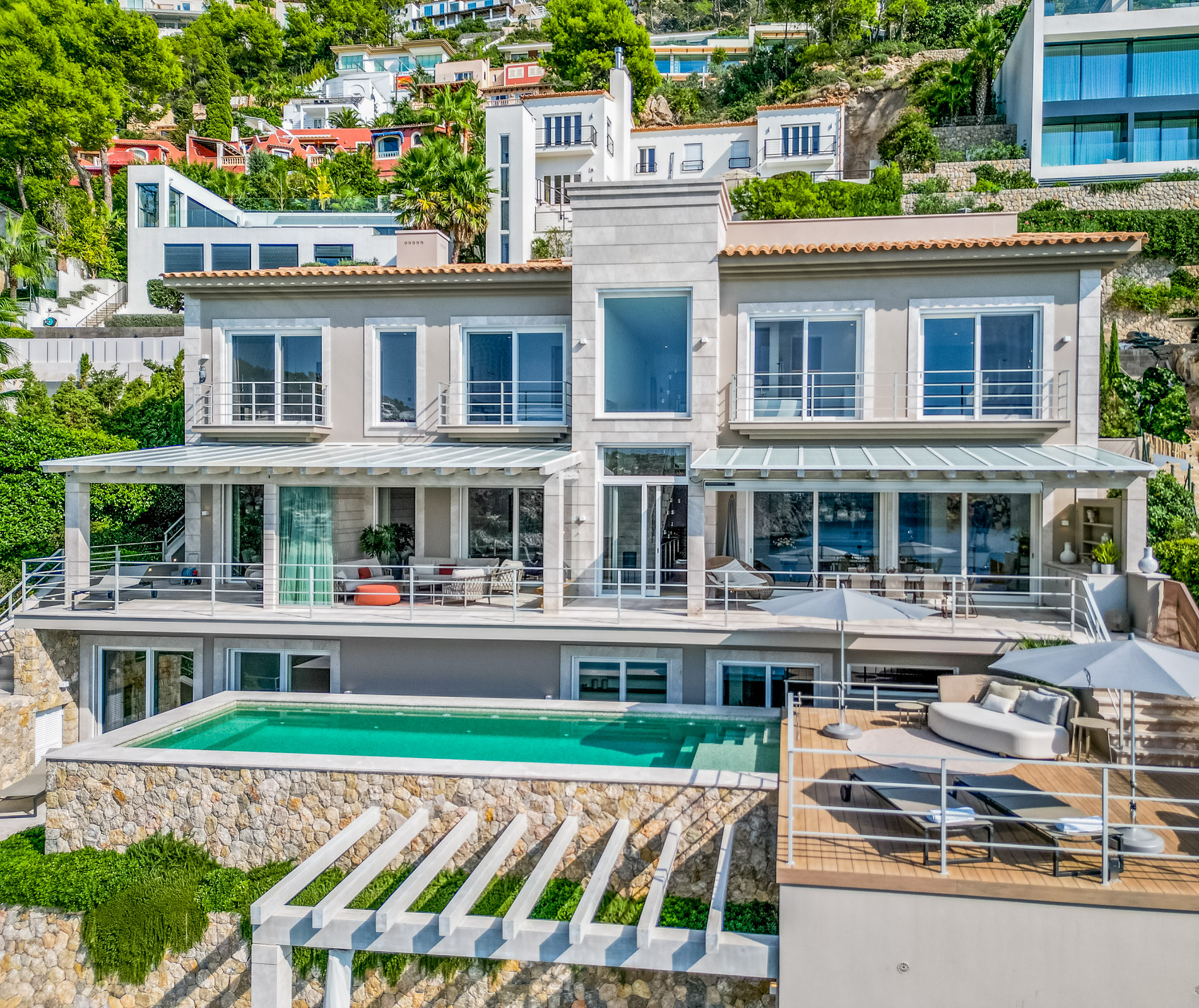 Exploring Elegance in Port d'Andratx: A Dream VillaLocated in one of the most stunning locations in Port d'Andratx, this property dazzles with its incomparable luxury and breathtaking panoramic views. From majestic ocean views to surrounding mountains and postcard-perfect sunsets, this villa offers a dream lifestyle.The villa, which extends over three levels, covers a generous constructed area of 810 square metres. Upstairs, two large master bedrooms with en-suite bathrooms and walk-in closets offer privacy and comfort. A third bedroom with a shower room completes this floor, guaranteeing space for the entire family or guests.On the ground floor, a spacious and exclusive kitchen merges harmoniously with an elegant living room, creating the perfect setting for modern living. A separate bedroom with en-suite bathroom and private terrace adds a touch of extra privacy and comfort.From the kitchen and living room, there is direct access to terraces that surround the pool area. Here, residents can relax and enjoy unrivaled panoramic views of the sea, creating the perfect setting for outdoor gatherings and entertaining.The basement of the villa houses two additional bedrooms, a bathroom and an additional living room with its own private terrace. Additionally, a spacious, fully equipped gym room provides the opportunity to stay active and fit without leaving home.A standout feature of this property is its separate sauna deck, offering the possibility of a relaxing sauna session with sea views, a truly unique experience.High-quality materials such as natural stone and oak parquet give the villa a warm and welcoming feel. Exclusivity and quality are elevated even further with premium furniture from brands such as January, B&B Italia, Flexform, Freifrau, Poliform, Minotti and Tribu.In short, this property in Port d'Andratx is a masterpiece of luxury and design, where elegance is combined with stunning views to create an exceptional lifestyle on the beautiful coast of Mallorca. It is an invitation to live life to its fullest.