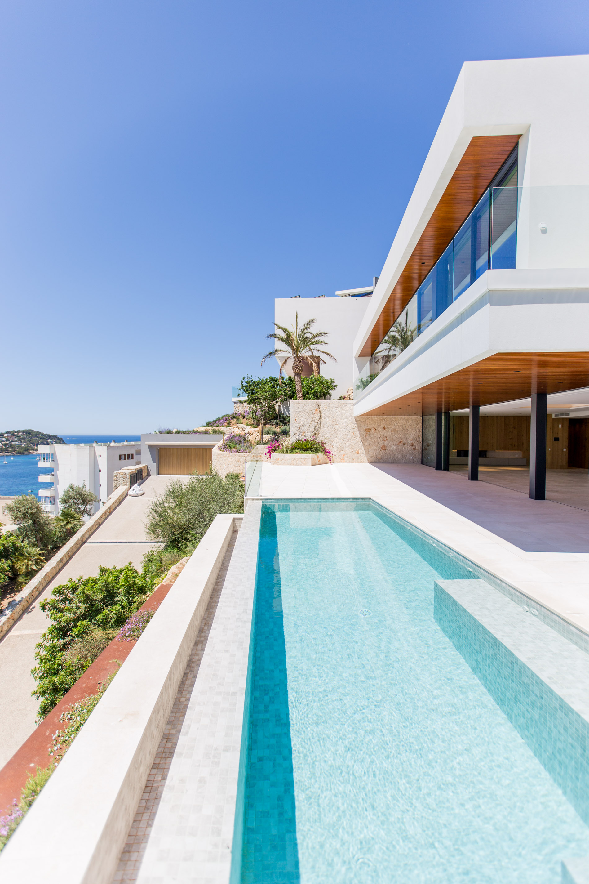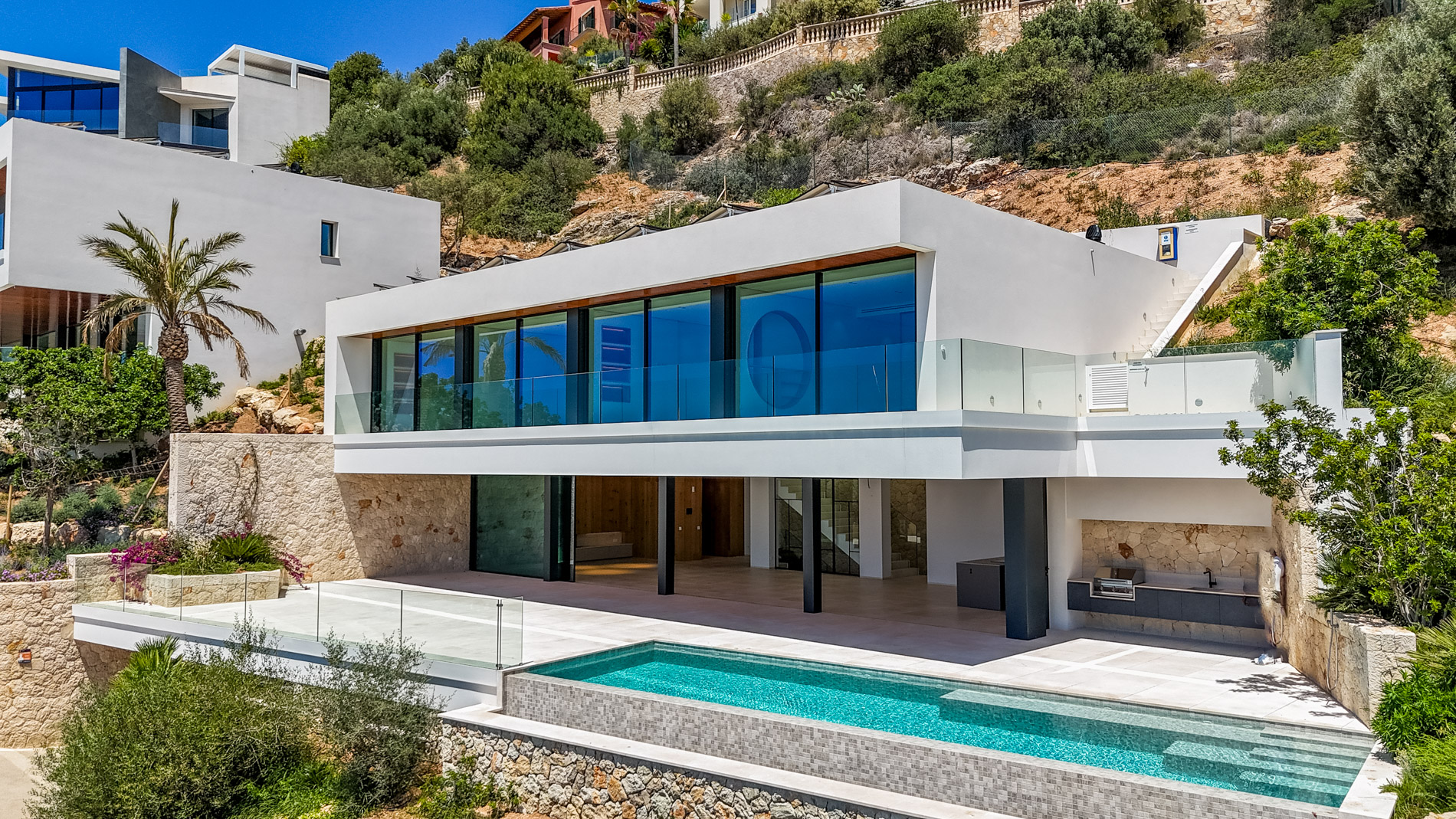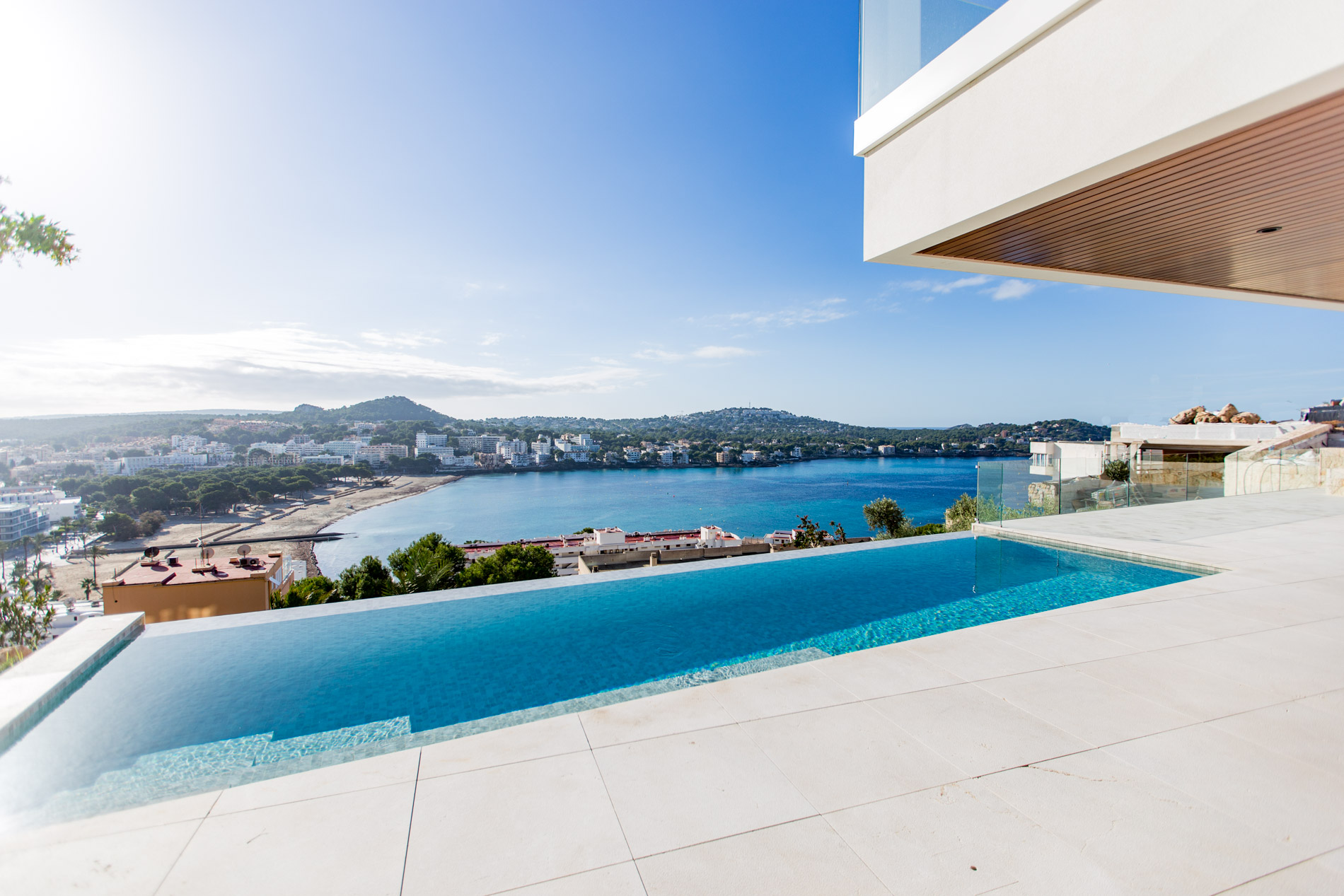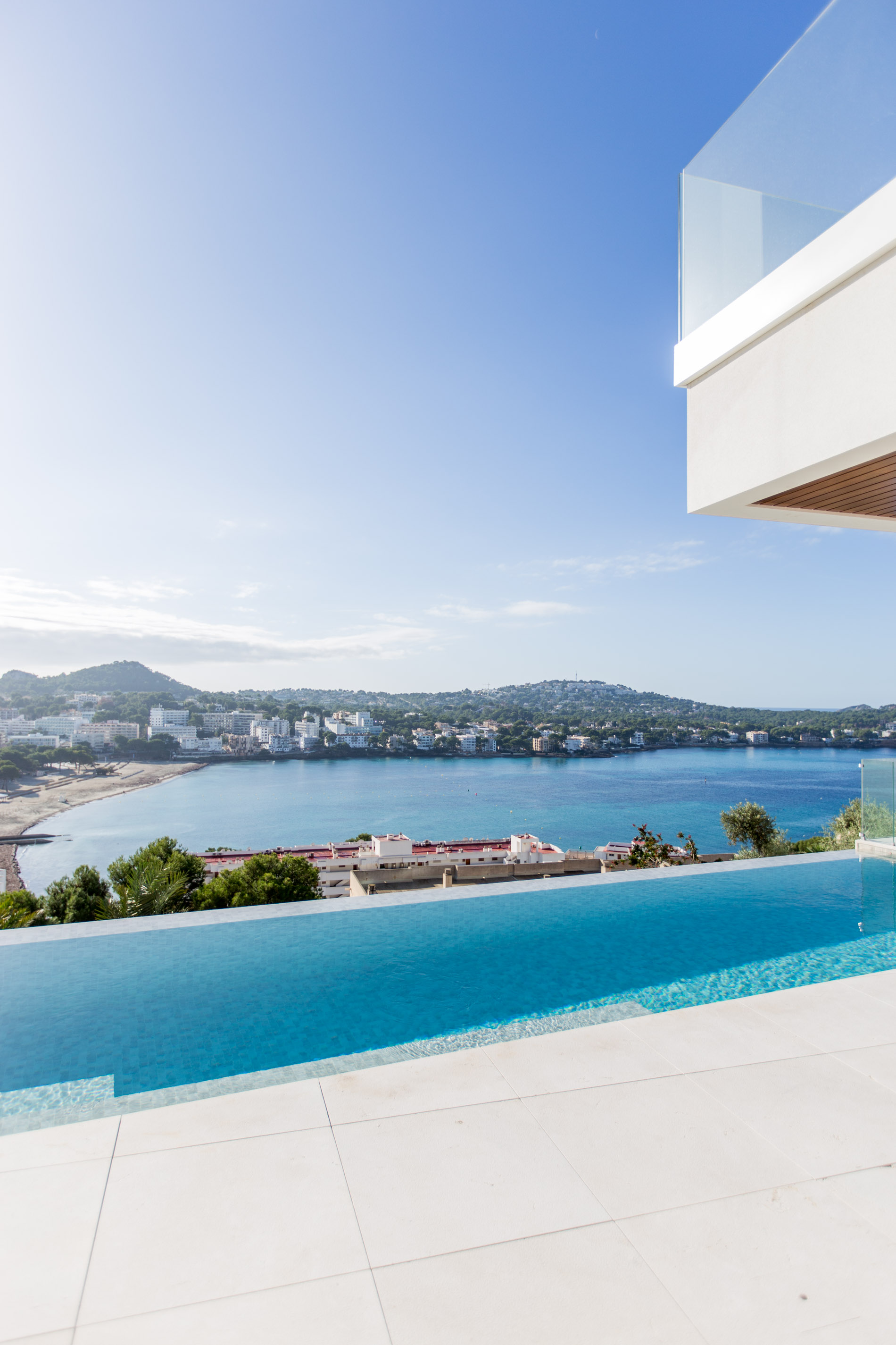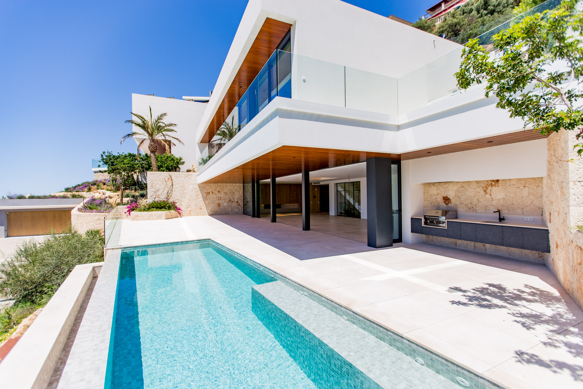 Nestled in the heart of Santa Ponsa, this stunning villa epitomizes contemporary luxury and timeless elegance. Ready for occupancy, the property stands out for its high-quality interior design and the use of exceptional materials, ensuring an unparalleled living experience.From the moment you cross the threshold of its majestic entrance, the villa envelops you in an aura of elegance and style. The ground floor, with its large climate-controlled wine cellar, luxury spa, and gym, invites wellness and relaxation. Every corner is carefully designed to offer an unparalleled living experience.On the first floor, an open-plan design harmoniously integrates the living room, kitchen, and dining area. Here, space is synonymous with freedom, and the panoramic sea views from any point are simply stunning. The kitchen, equipped with state-of-the-art appliances, is a gourmet’s paradise, while the living and dining areas provide the perfect setting for entertainment and family life.The second floor houses the bedrooms, each a sanctuary of comfort and tranquility. These rooms are designed with total energy efficiency in mind, thanks to an advanced thermal heating system and solar panels installed throughout the rooftop. Here, luxury meets sustainability, offering a home that is both elegant and eco-friendly.The spacious terrace and infinity pool seem to merge with the horizon, creating a private oasis from which to contemplate the splendor of the Mediterranean Sea. The south-facing orientation ensures an abundance of natural light throughout the day, making this villa a warm and welcoming retreat in any season.MallorcaSite, your real estate agency in Mallorca, recommends this property for its views, design, and location.
