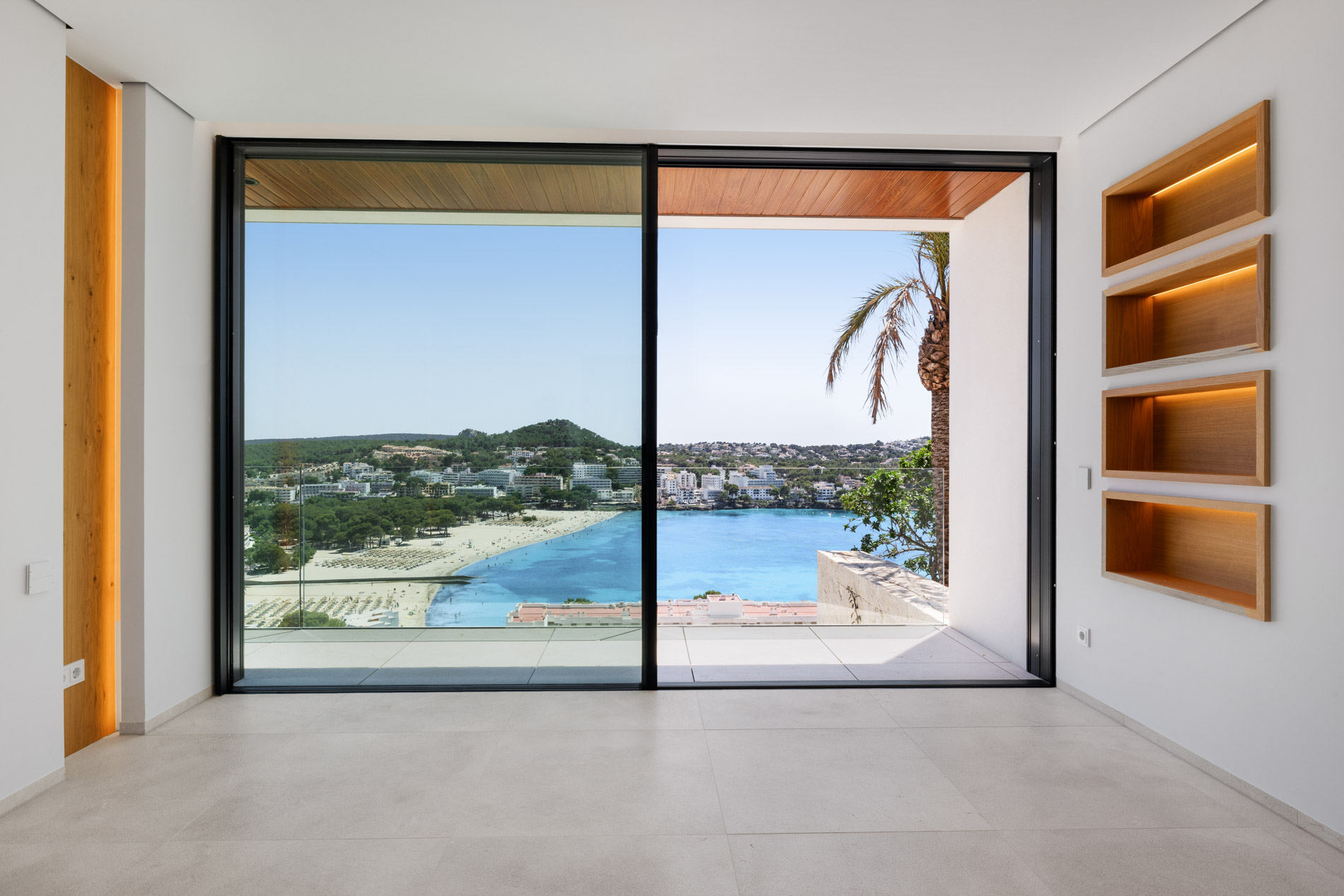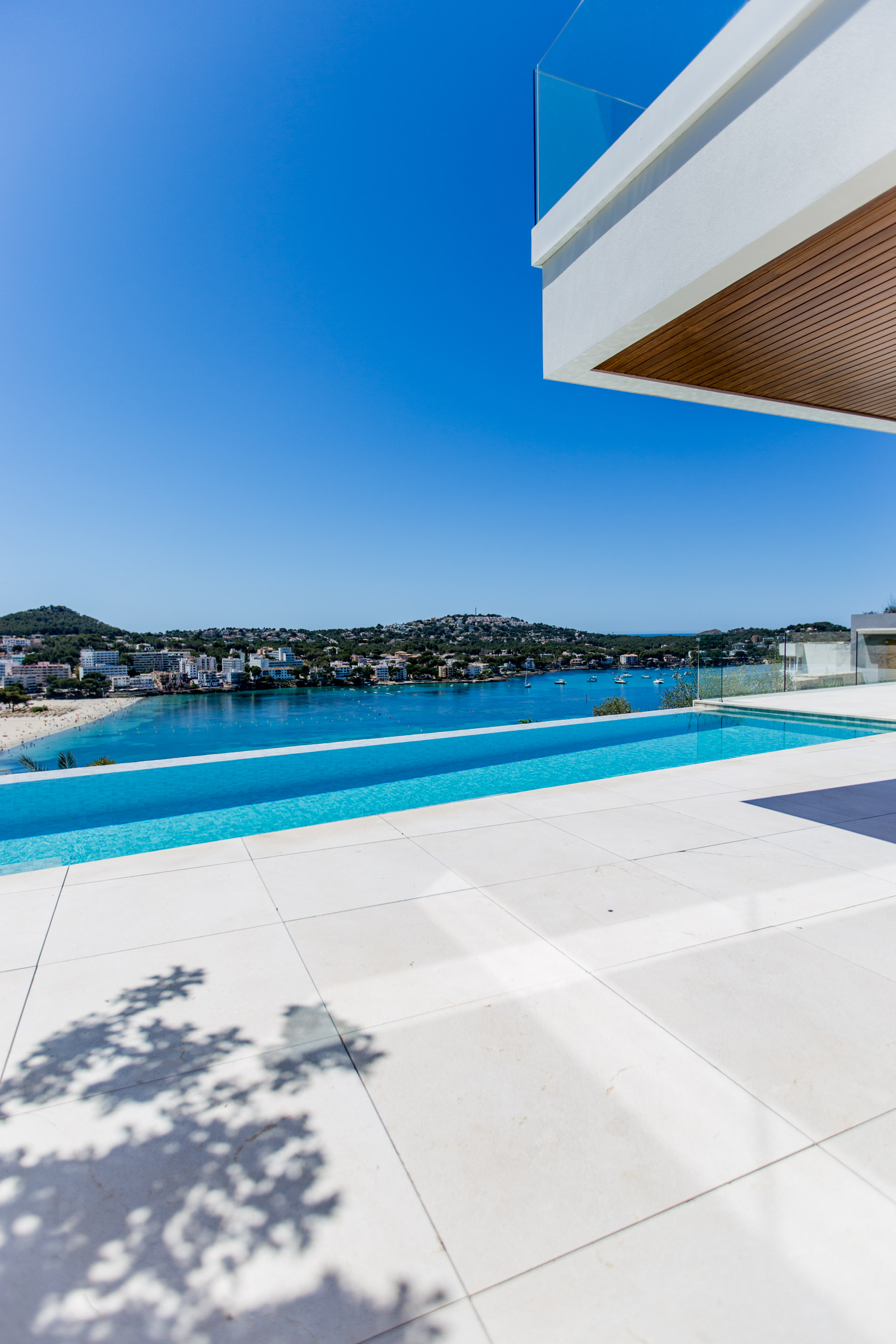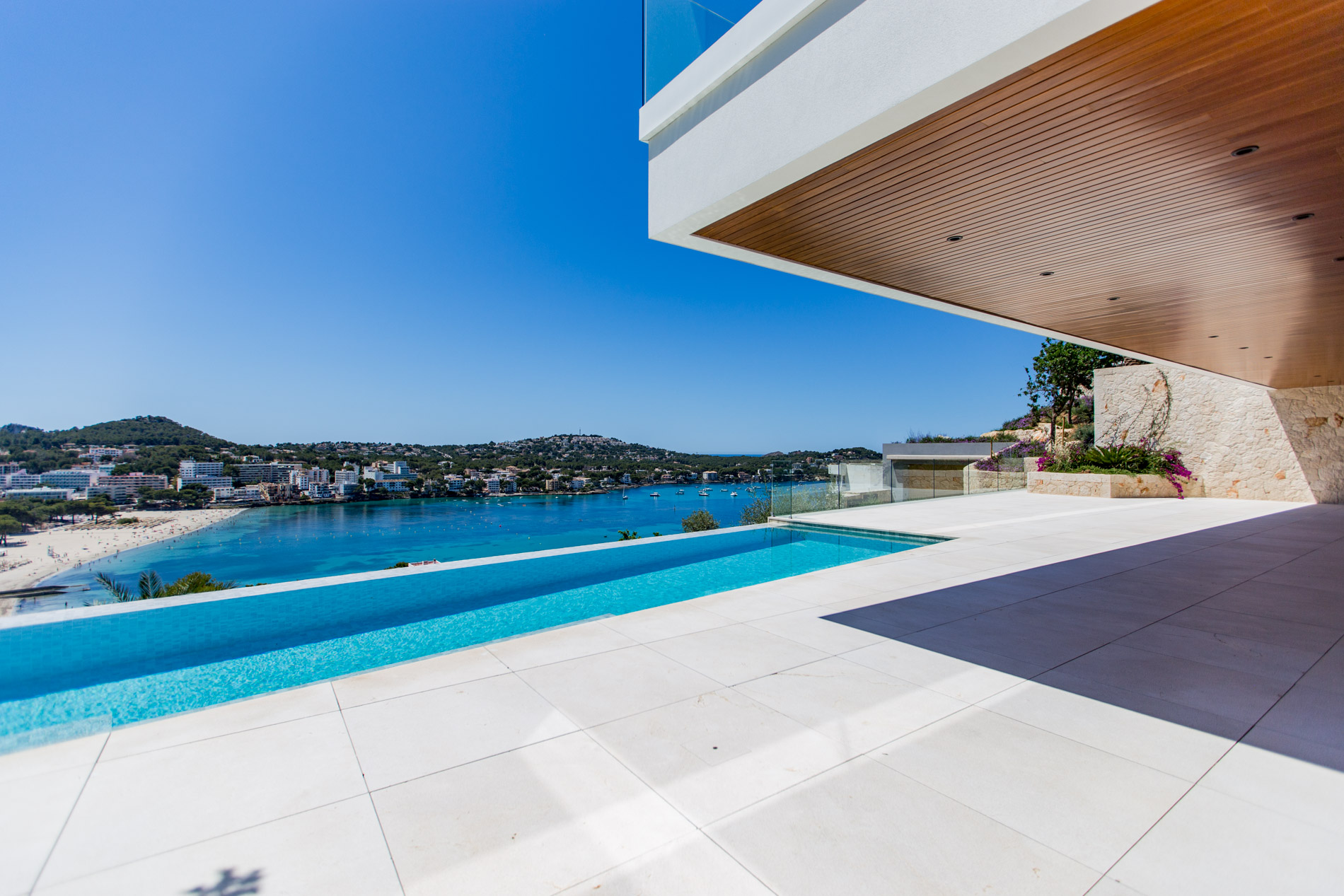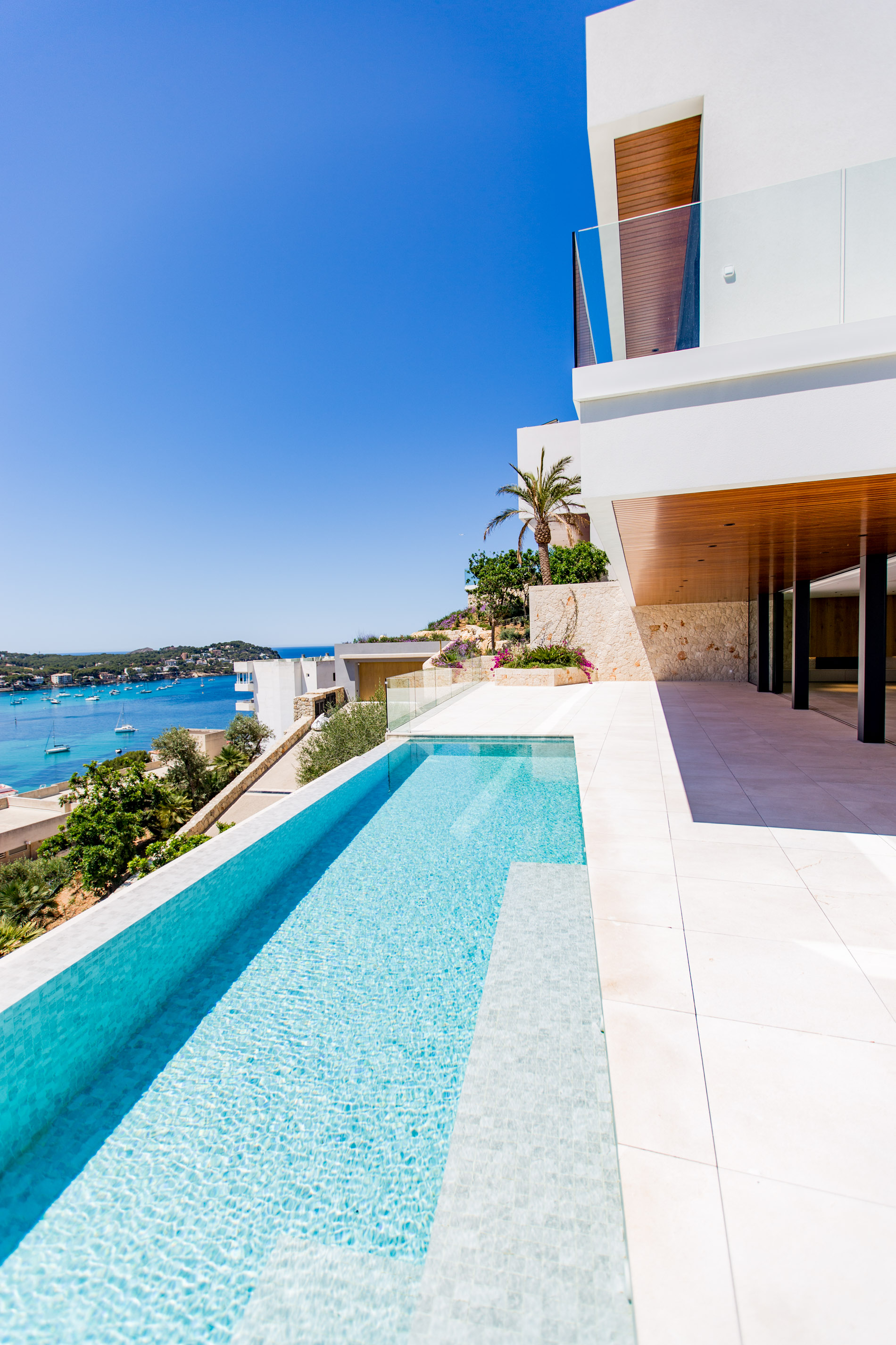 Nestled in the heart of Santa Ponsa, this stunning villa epitomizes contemporary luxury and timeless elegance. Ready for occupancy, the property stands out for its high-quality interior design and the use of exceptional materials, ensuring an unparalleled living experience.From the moment you cross the threshold of its majestic entrance, the villa envelops you in an aura of elegance and style. The ground floor, with its large climate-controlled wine cellar, luxury spa, and gym, invites wellness and relaxation. Every corner is carefully designed to offer an unparalleled living experience.On the first floor, an open-plan design harmoniously integrates the living room, kitchen, and dining area. Here, space is synonymous with freedom, and the panoramic sea views from any point are simply stunning. The kitchen, equipped with state-of-the-art appliances, is a gourmet’s paradise, while the living and dining areas provide the perfect setting for entertainment and family life.The second floor houses the bedrooms, each a sanctuary of comfort and tranquility. These rooms are designed with total energy efficiency in mind, thanks to an advanced thermal heating system and solar panels installed throughout the rooftop. Here, luxury meets sustainability, offering a home that is both elegant and eco-friendly.The spacious terrace and infinity pool seem to merge with the horizon, creating a private oasis from which to contemplate the splendor of the Mediterranean Sea. The south-facing orientation ensures an abundance of natural light throughout the day, making this villa a warm and welcoming retreat in any season.MallorcaSite, your real estate agency in Mallorca, recommends this property for its views, design, and location.