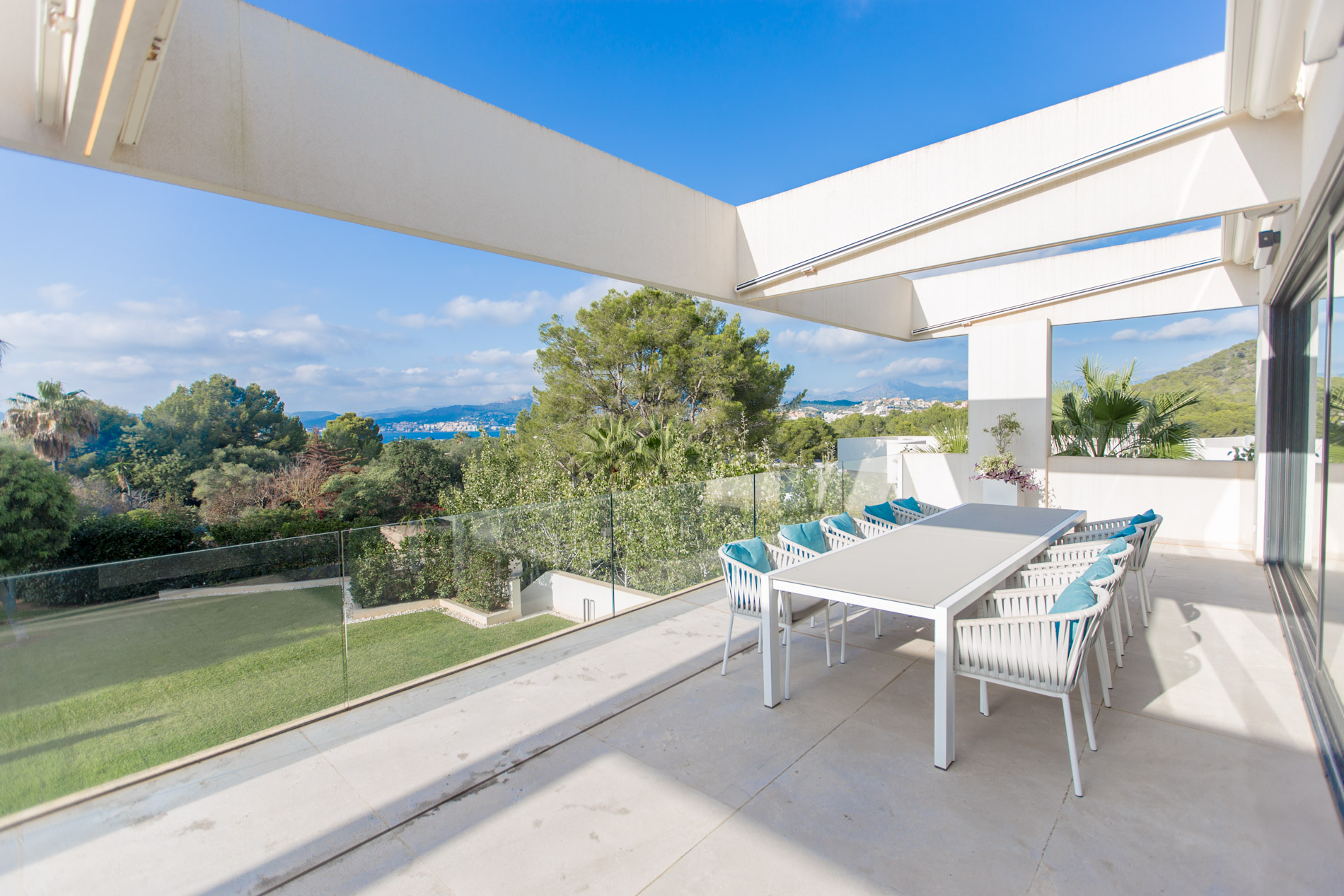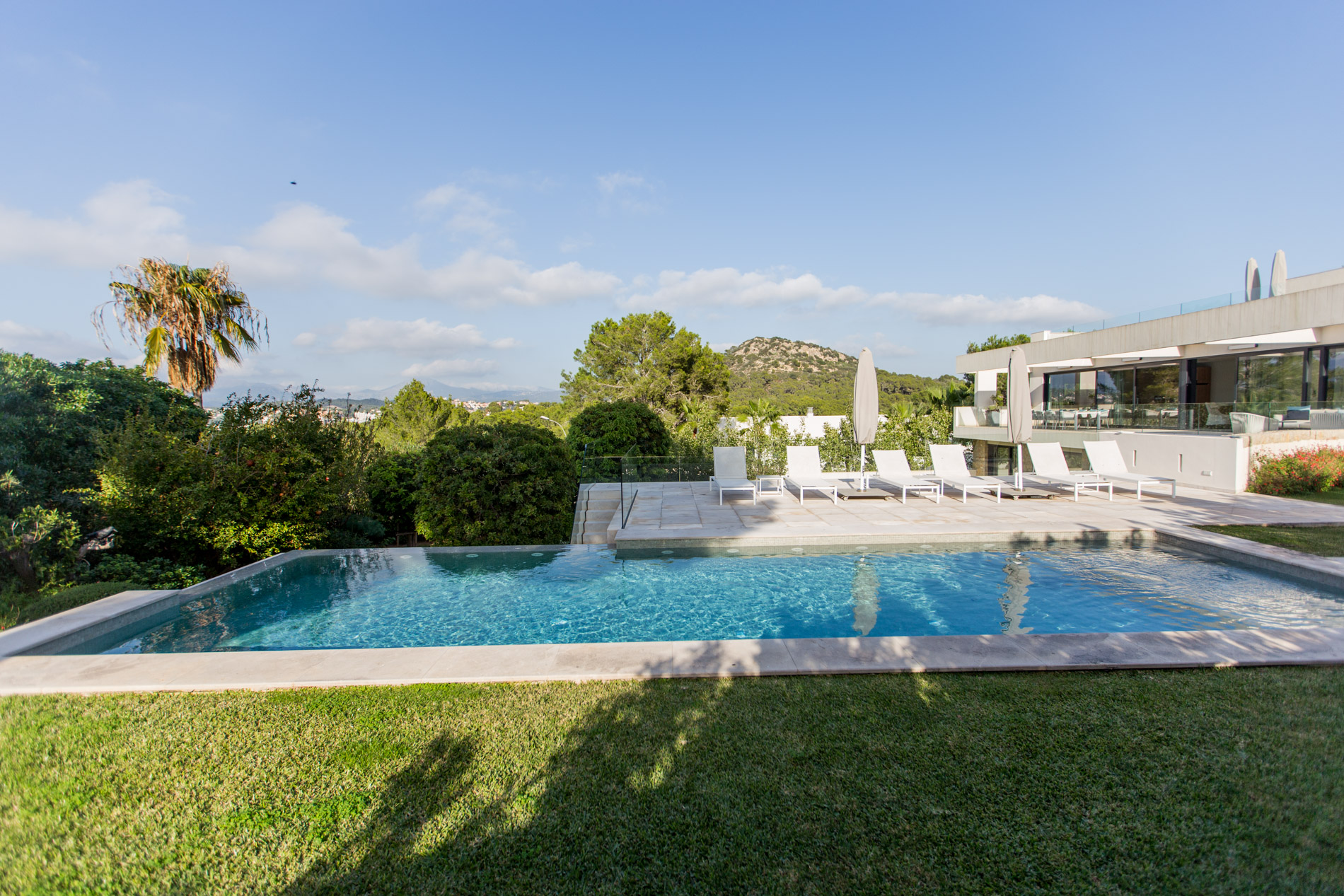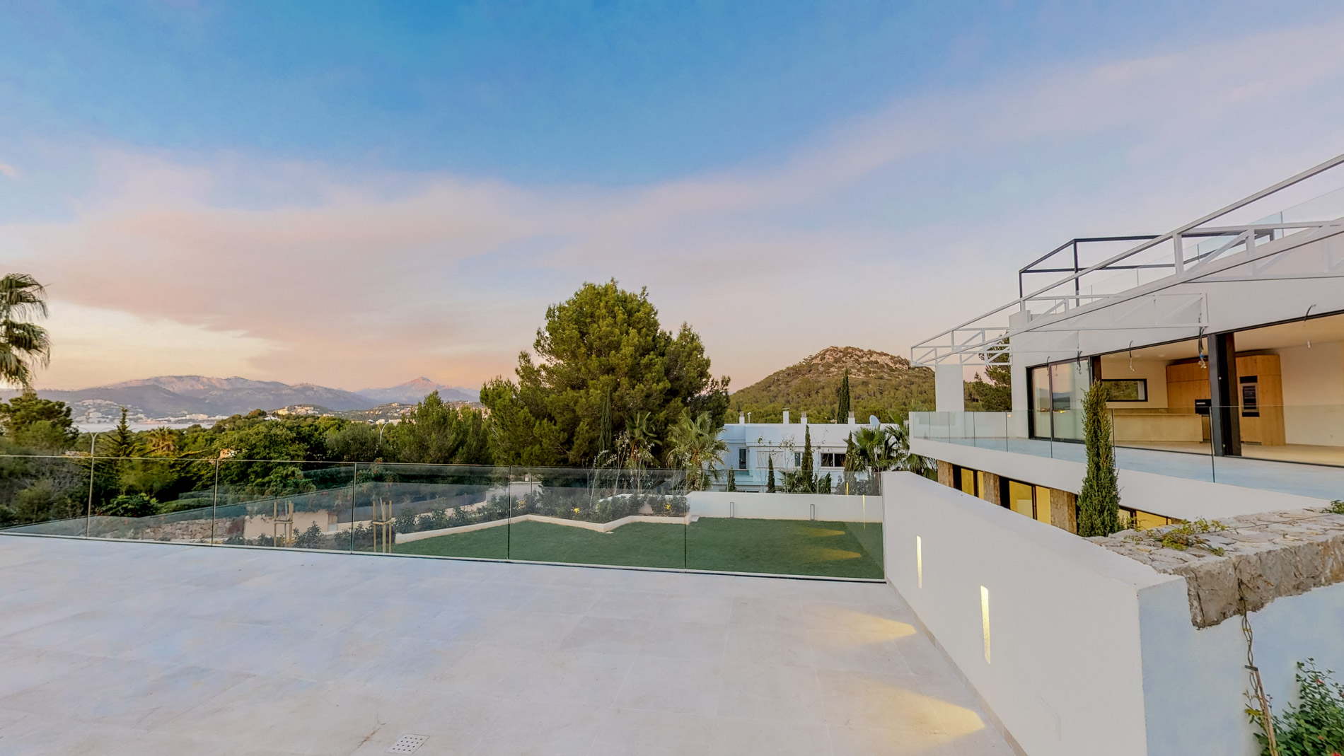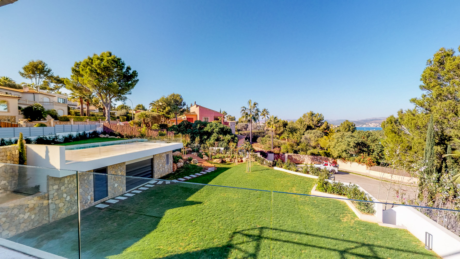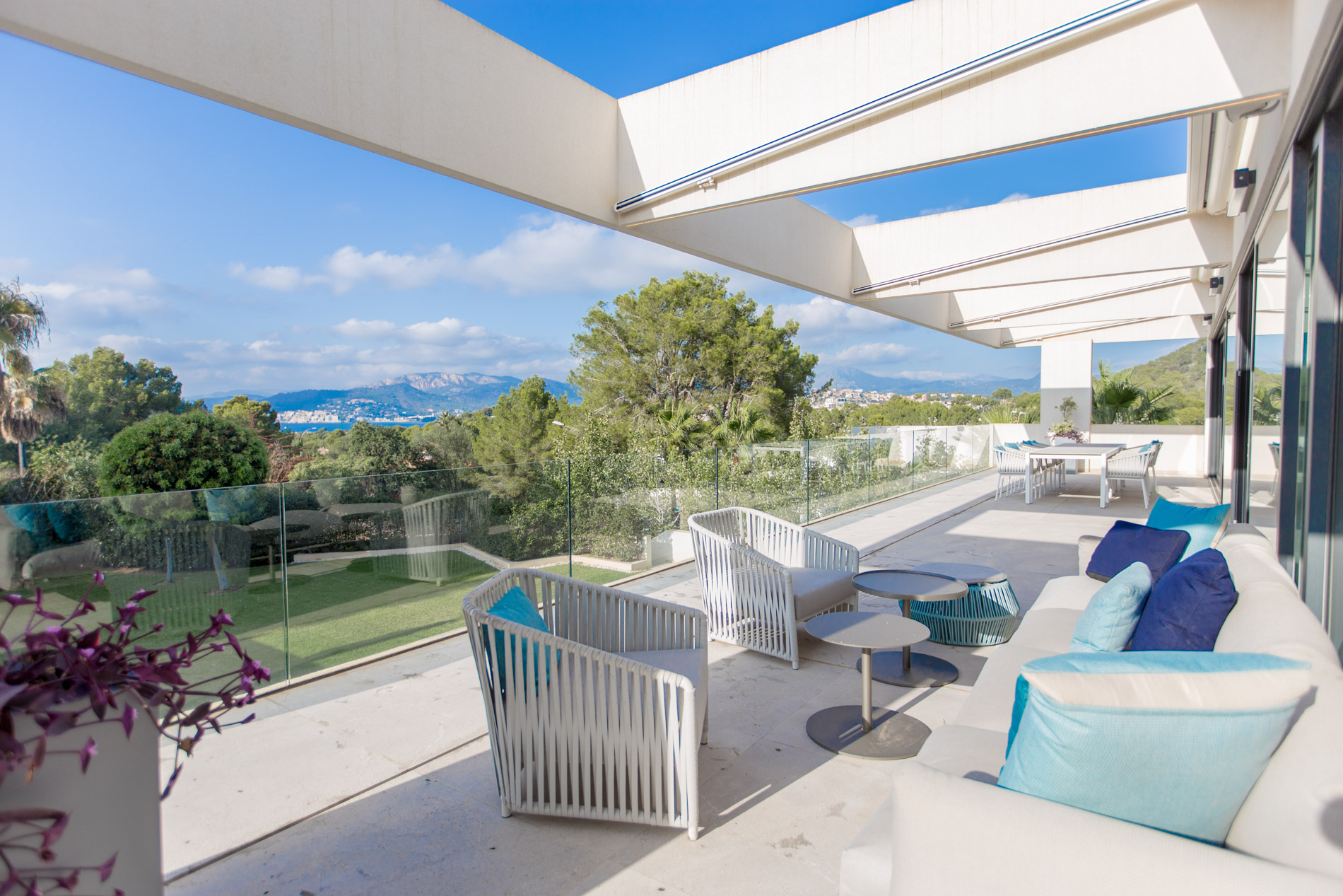 Family villa with sea views and with a nice flat garden, ideal for families with children, quiet location in Santa Ponsa. A modern design combined with Mediterranean elements.