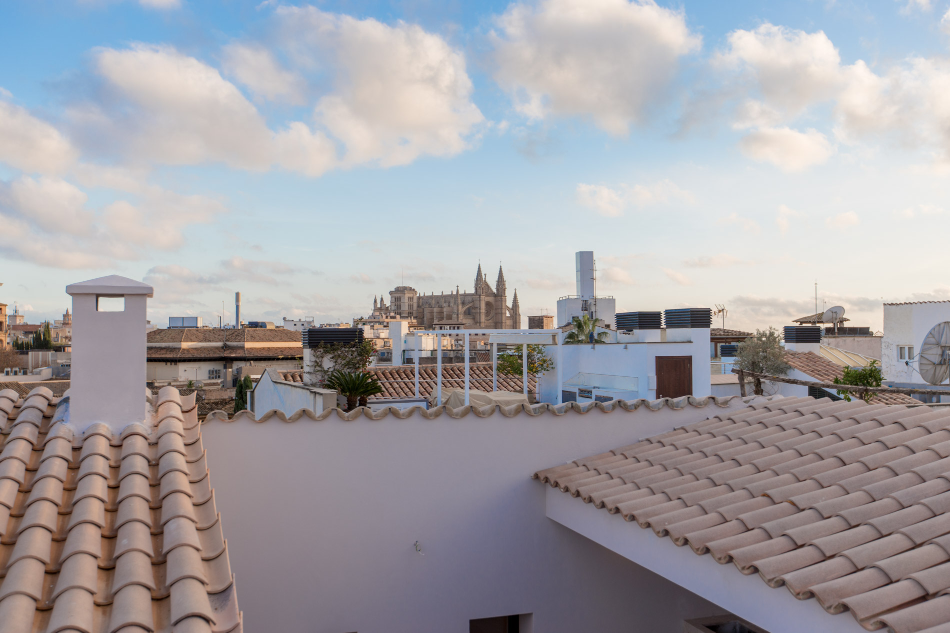 S'ARTISTA, ático duplex con bonitas vistas en modalidad de alquiler de larga temporada dentro del Palacio Can Serra Cavallería, palacete del siglo XIV en el Casco antiguo de Palma. Vive en un Palacio y experimenta la historia y disfruta de los extras comunitarios exclusivos que la vivienda aporta: SPA (Sauna, piscina, hamacas zona de relax), una bodega con zona individualizada para botelleros individuales y wine tasting area o degustación de vinos en zona común. 322 m2 de ático distribuido en dos plantas, planta segunda de 171m2, balcón de 6m2, ático de 62m2, terraza de 42m2 y solarium de 41m2, 3 habitaciones, 3 baños y un aseo. Destacar su arco gótico apuntalado ojival, del siglo XIV, el techo artesonado del siglo XV, o los frescos perfectamente conservados, joyas solo al alcance de personas que las sepan apreciar. El casco antiguo de Palma, más allá de sus impresionantes casas y palacetes, cuenta con un valor añadido que en muchos lugares no se puede comprar: la historia, testigo a través de los siglos de tanta riqueza interior y exterior. Un ejemplo de esta majestuosidad sencilla, hermosa, mediterránea es el antiguo palacete de Can Serra de Cavalleria se erige como uno de los edificios más emblemáticos de Palma. Elementos como su arco gótico apuntalado ojival, del siglo XIV, el techo artesonado del siglo XV, o los frescos en la última planta, perfectamente conservados y que representan barcos medievales, son joyas solo al alcance de personas que las sepan apreciar y deseen disfrutar de este trozo de historia de Palma, a la vez que viven rodeados de todas las comodidades de una casa de alto standing. Alquiler exclusivo único en Mallorca