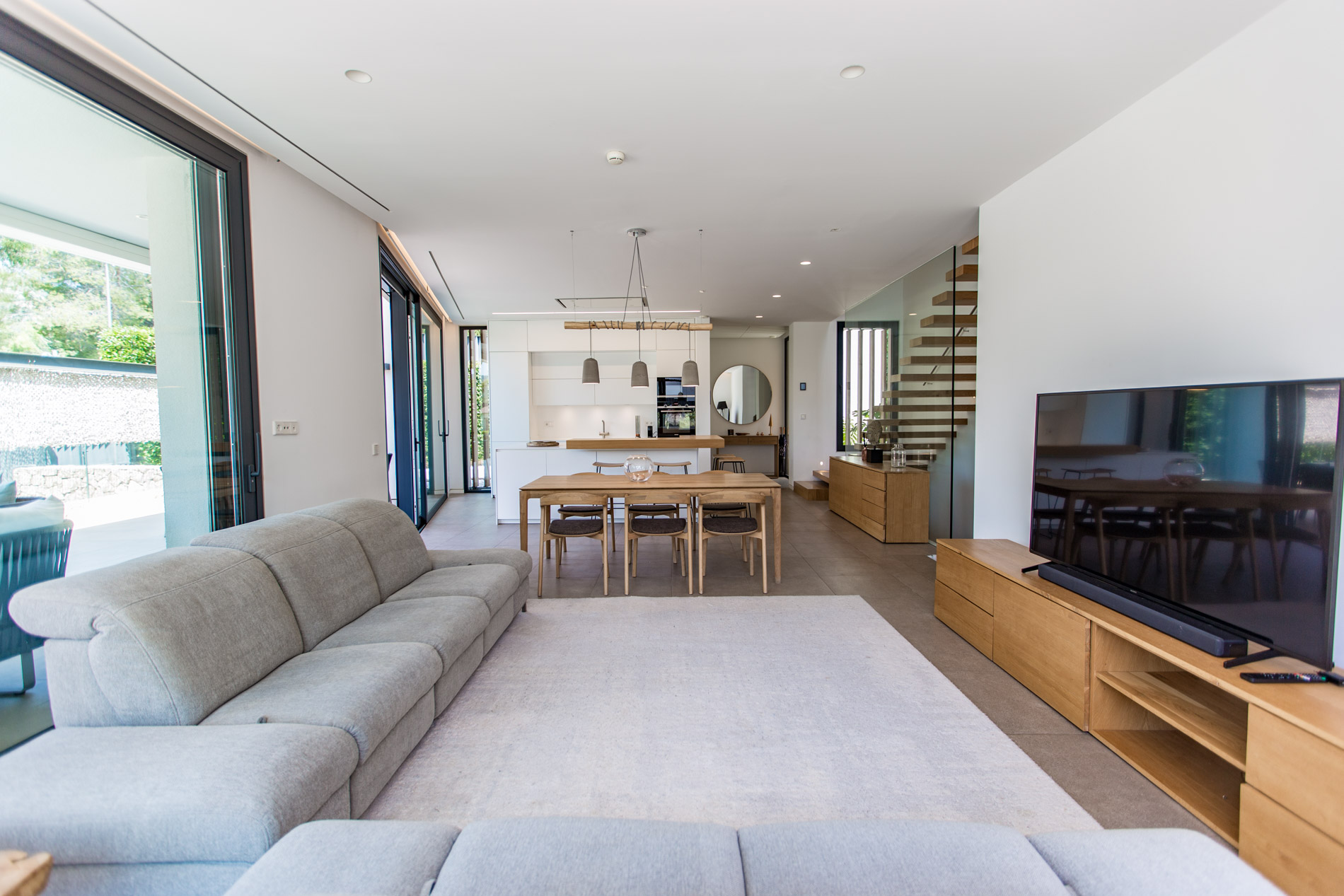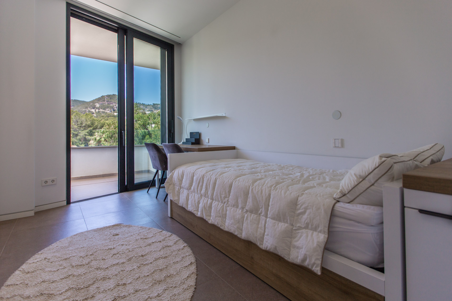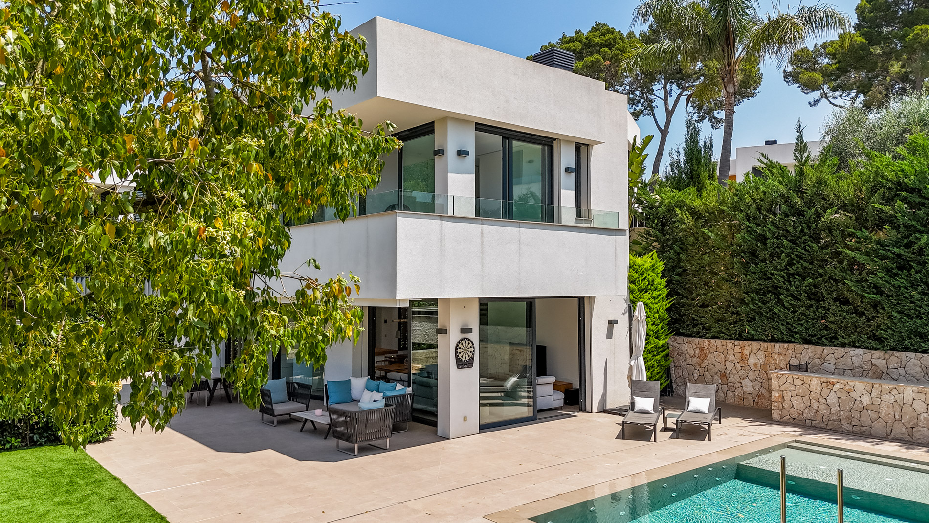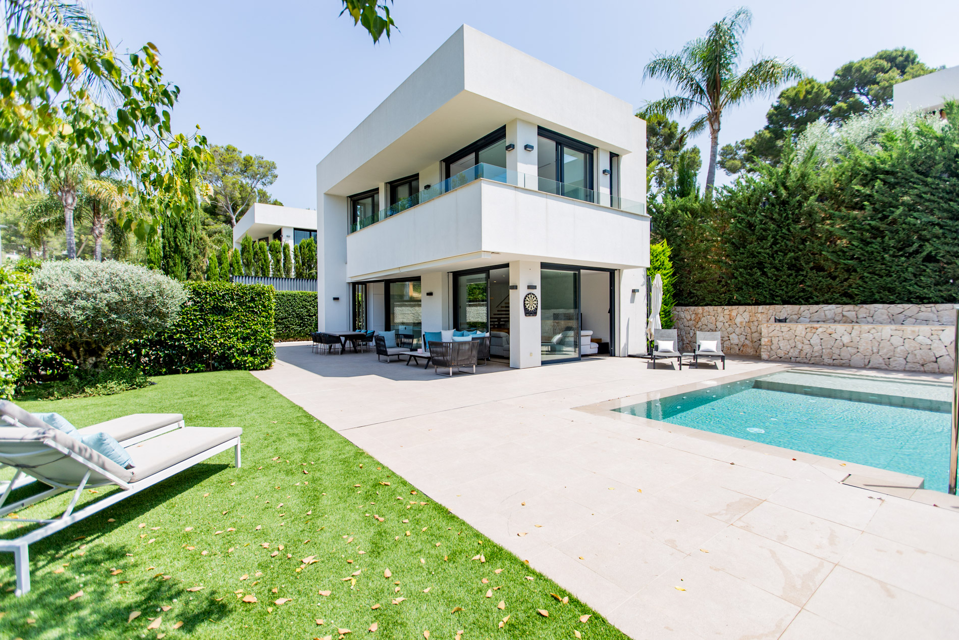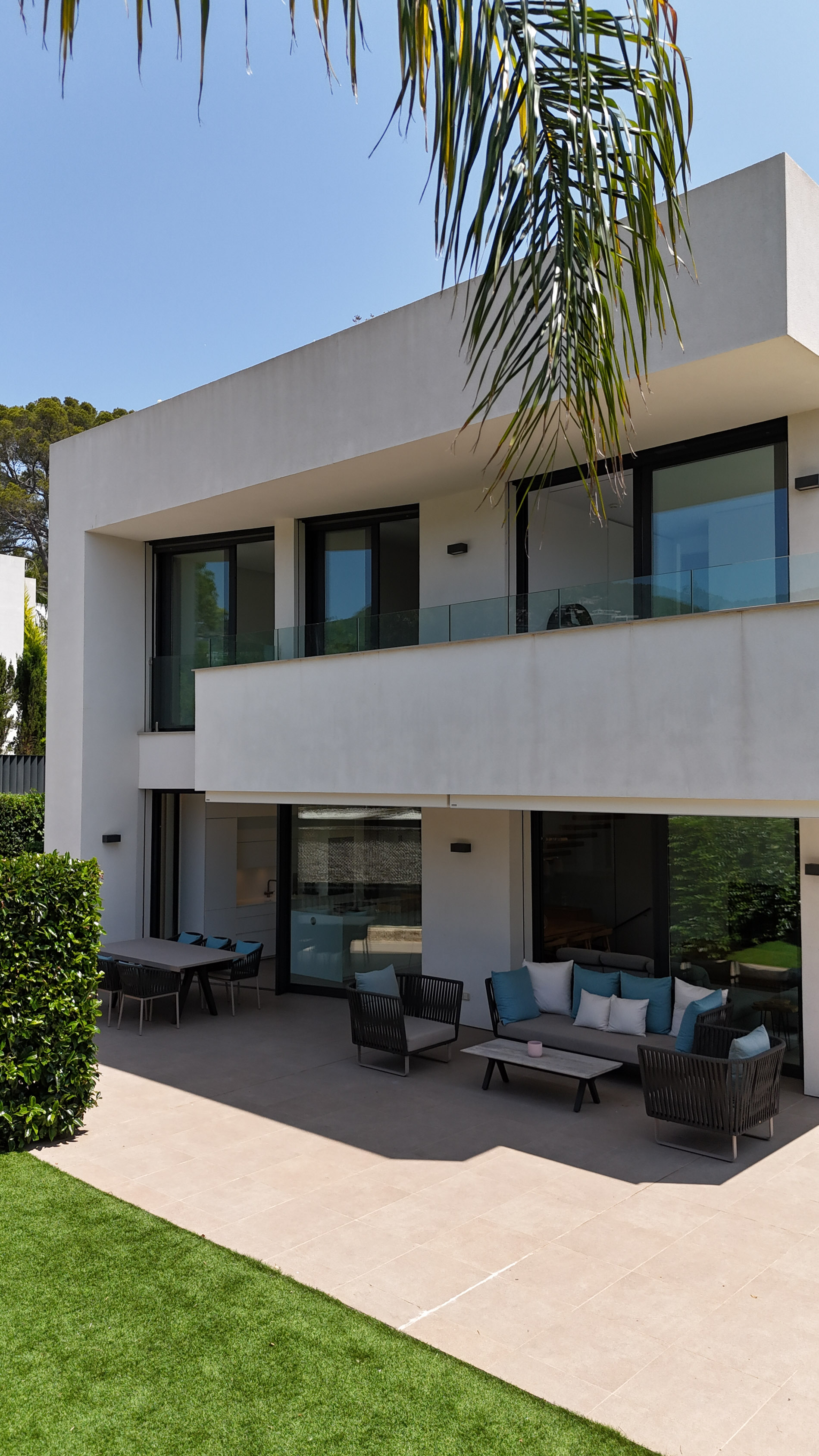 Enclavada en el entorno exclusivo de Son Vida, esta espectacular villa redefine el concepto de lujo y confort. Diseñada con un estilo contemporáneo y equipada con las más altas calidades, la propiedad ofrece un espacio sofisticado y funcional, ideal para quienes buscan privacidad y bienestar. Desde el primer momento, la armonía entre la arquitectura y la naturaleza se hace evidente. La vivienda, con una superficie de 275 m² sobre una parcela de 598 m², está rodeada de muros de piedra natural que realzan su esencia mediterránea, mientras que su cubierta ajardinada mejora la integración con el paisaje y optimiza el aislamiento térmico. El exterior está diseñado para el disfrute y la relajación, con una impresionante piscina desbordante de agua salada que incorpora un sistema de depuración silenciosa. Junto a ella, amplias terrazas, un solárium y exuberantes jardines crean un oasis de tranquilidad, perfecto para aprovechar el clima privilegiado de Mallorca. El interior de la casa es un reflejo de modernidad y luminosidad. La planta principal se distingue por un diseño de concepto abierto, donde la zona de estar, el comedor y la cocina se funden en un espacio amplio y fluido. La cocina, equipada con electrodomésticos de última generación y una gran isla central, se convierte en el corazón del hogar, con un diseño minimalista en tonos blancos que maximiza la entrada de luz natural a través de los ventanales de suelo a techo. En la primera planta, la zona de descanso ofrece tres amplios dormitorios dobles, todos con acceso a una espectacular terraza que rodea la vivienda y proporciona vistas despejadas a las montañas y al entorno verde. La suite principal cuenta con baño privado, mientras que los otros dormitorios comparten un segundo baño completo. La vivienda también dispone de un versátil sótano, ideal para adaptarlo según las necesidades del futuro propietario, así como un garaje con capacidad para dos vehículos. Ubicación privilegiada: Esta propiedad no solo destaca por su diseño y calidades, sino también por su ubicación inmejorable. Son Vida es sinónimo de exclusividad y tranquilidad, ofreciendo vistas espectaculares a la naturaleza y fácil acceso a servicios de alto nivel. Esta villa representa una oportunidad única para disfrutar de la mejor calidad de vida en un entorno de lujo y privacidad. MallorcaSite, su agencia inmobiliaria en Mallorca, recomienda esta propiedad por su ubicación, por estar en el golf y sus calidades.
