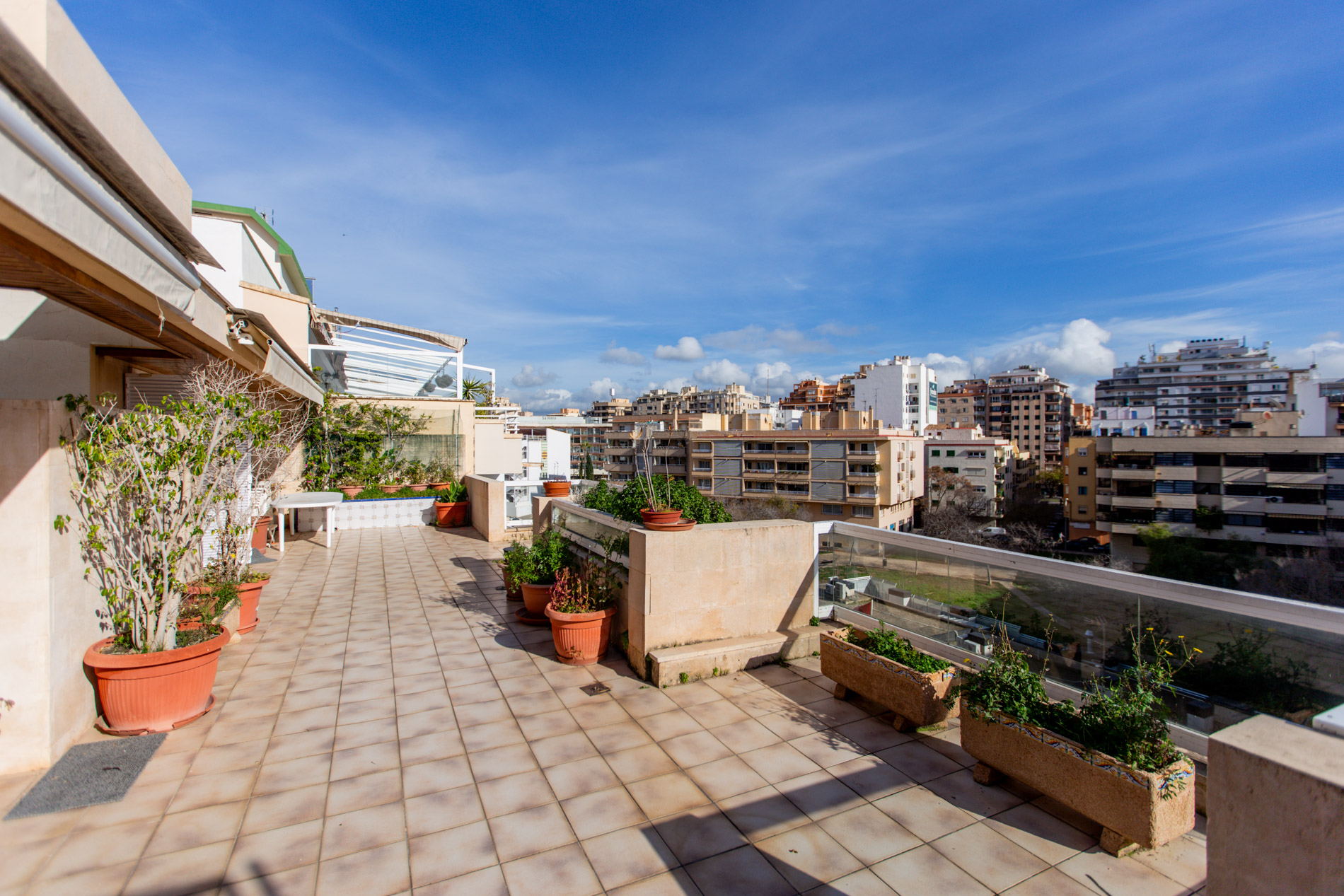 Este ático, situado en una séptima planta de un edificio residencial con tan solo trece vecinos, se presenta como una pieza singular dentro del tejido urbano de Palma. Construido en 1990, combina amplitud, privacidad y una ubicación estratégica, en una zona consolidada y muy valorada por su equilibrio entre vida residencial y cercanía al centro de la ciudad. La vivienda cuenta con cerca de 200m2 construidos, de los cuales más de 170m2 corresponden a superficie útil, ofreciendo estancias generosas y bien proporcionadas. A ello se suma una terraza de uso privativo de setenta y cinco metros cuadrados que, gracias a su orientación este, se abre a la luz de la mañana y a vistas despejadas sobre el entorno urbano. Este espacio exterior se convierte en una auténtica prolongación de la vivienda, ideal para disfrutar del clima mediterráneo, crear diferentes ambientes y vivir el día a día con una sensación constante de amplitud y libertad. El interior se distribuye actualmente en cinco dormitorios y cuatro baños, una configuración poco habitual en áticos de la ciudad y especialmente interesante para familias numerosas o para quienes buscan combinar vivienda y espacios de trabajo o invitados. La propiedad necesita reforma, lo que brinda la oportunidad de redefinir los espacios con una mirada contemporánea, respetando los volúmenes originales y adaptándolos a un estilo de vida actual. Los suelos de mármol, las ventanas con climalit, las persianas, el aire acondicionado y la calefacción central por gas con radiadores constituyen una base sólida sobre la que proyectar una renovación a medida. El sistema de alarma aporta, además, un extra de seguridad y tranquilidad. La vivienda se completa con un trastero y dos plazas de aparcamiento de grandes dimensiones, un valor añadido especialmente relevante en Palma, donde el espacio para estacionar es cada vez más apreciado. El edificio, con pocos vecinos, refuerza la sensación de privacidad y exclusividad. La ubicación es, sin duda, uno de los grandes atractivos de esta propiedad. Se encuentra en una zona bien comunicada, con acceso rápido al centro de Palma, a sus zonas comerciales, culturales y gastronómicas, así como a servicios esenciales, colegios y transporte público. Vivir aquí permite disfrutar de la vida urbana sin renunciar a la calma de un entorno residencial, con el centro histórico y el mar a pocos minutos. En conjunto, este ático representa una oportunidad excepcional para quienes buscan espacio, luz y potencial en una de las áreas más prácticas y bien conectadas de Palma, con la posibilidad de crear una vivienda verdaderamente única y personal. MallorcaSite recomienda esta propiedad como una excelente oportunidad para dar forma a un ático amplio, luminoso y con carácter en una ubicación privilegiada de la ciudad.