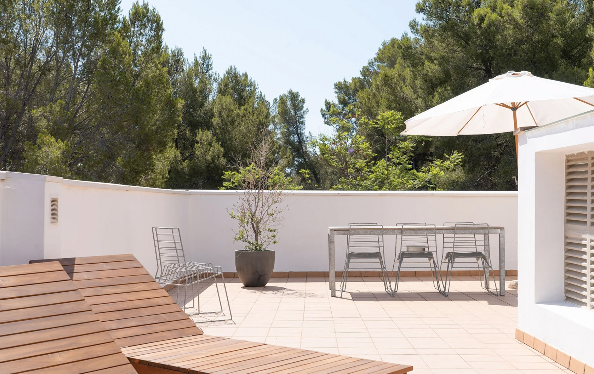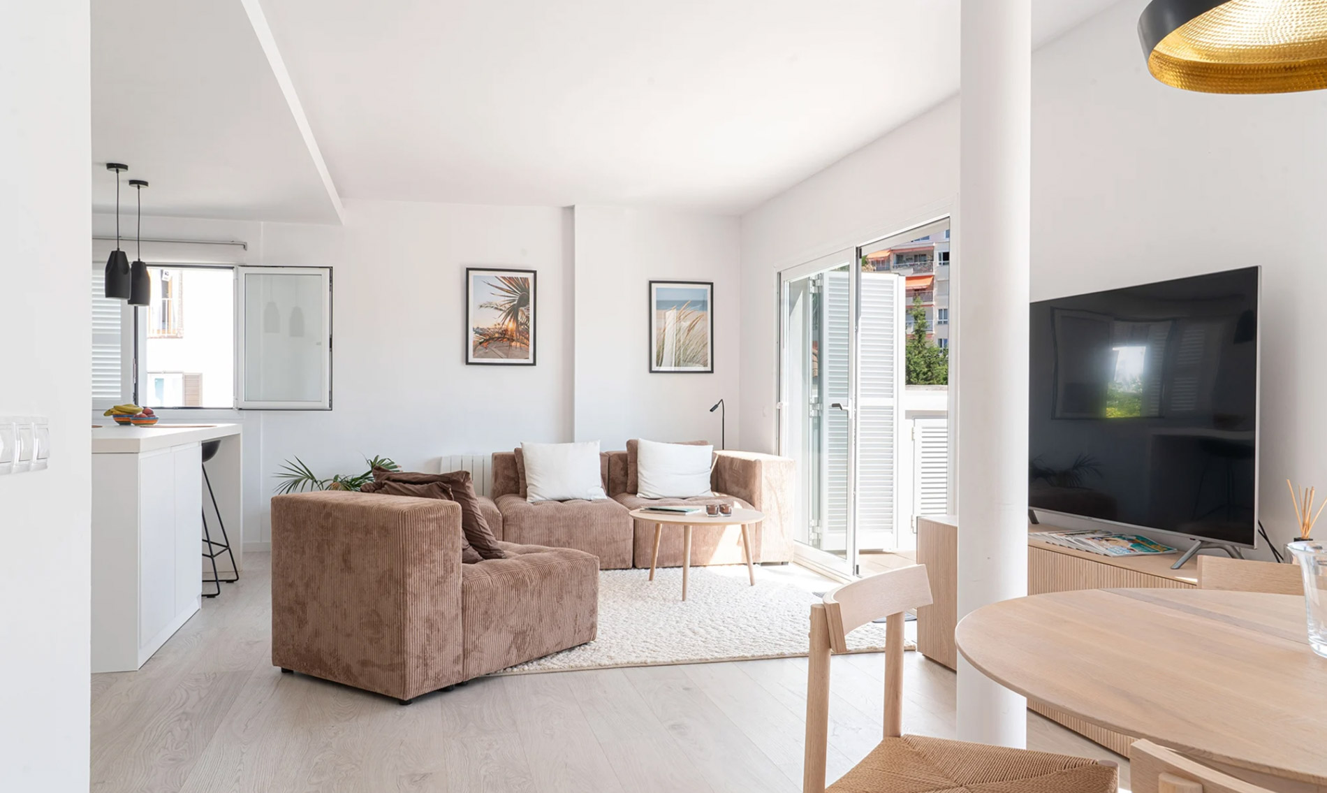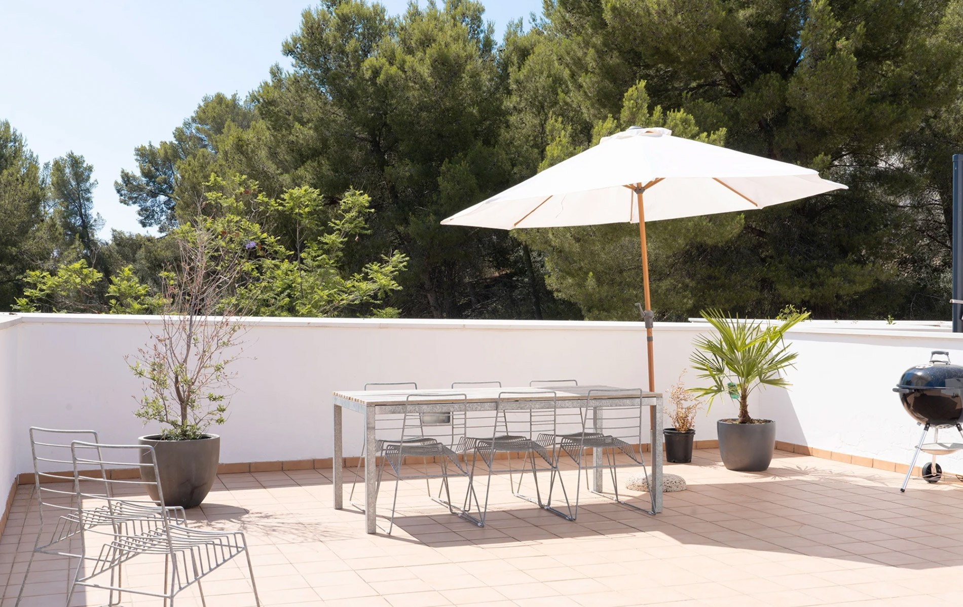 Ubicado en el apacible barrio residencial de San Agustín, al suroeste de Palma, este luminoso ático recientemente reformado representa una magnífica oportunidad para quienes buscan tranquilidad sin renunciar a la proximidad del mar y la ciudad. San Agustín es conocido por su ambiente relajado, con calles residenciales bordeadas de árboles, cafés con encanto, pequeños comercios y una excelente conexión con el centro de Palma, al que se llega en apenas 10 minutos en coche. Además, se encuentra muy cerca del Puerto Calanova, ideal para los amantes del mar, y de varias calas y playas como Cala Major o Illetas, perfectas para disfrutar del sol mediterráneo. El ático se sitúa en la planta superior de un edificio pequeño y discreto de tan solo tres alturas, lo que garantiza privacidad y una atmósfera tranquila. Con una superficie habitable de 98 m², el interior destaca por su diseño contemporáneo y funcional, con una distribución diáfana que integra una cocina moderna con el espacioso salón, creando un ambiente ideal para el día a día o para recibir invitados. La vivienda cuenta con dos dormitorios de buen tamaño, ambos con capacidad para una cama doble, y dos cuartos de baño completos, uno de ellos en suite en el dormitorio principal. Gracias a su orientación y grandes ventanales, el piso goza de una excelente entrada de luz natural durante todo el día, lo que aporta una sensación de amplitud y bienestar. Uno de los principales atractivos es su terraza de 40 m², que recorre toda la vivienda y se convierte en una extensión natural del salón: el lugar perfecto para disfrutar de cenas al aire libre, leer bajo el sol o simplemente relajarse. Además, en la planta superior se encuentra la amplia azotea privada de 84 m², un espacio versátil con vistas abiertas, ideal para crear una zona chill-out o instalar un comedor exterior. Desde aquí, un pequeño puente conduce directamente a la piscina comunitaria, ofreciendo un acceso cómodo y directo para refrescarse durante los meses más cálidos. La propiedad incluye también una amplia plaza de aparcamiento en el garaje del edificio, lo cual añade un plus de comodidad en esta zona donde el aparcamiento puede resultar limitado. En resumen, este ático en San Agustín combina perfectamente diseño moderno, espacios exteriores generosos y una ubicación privilegiada junto al mar, convirtiéndolo en una opción ideal tanto como residencia habitual como segunda vivienda.