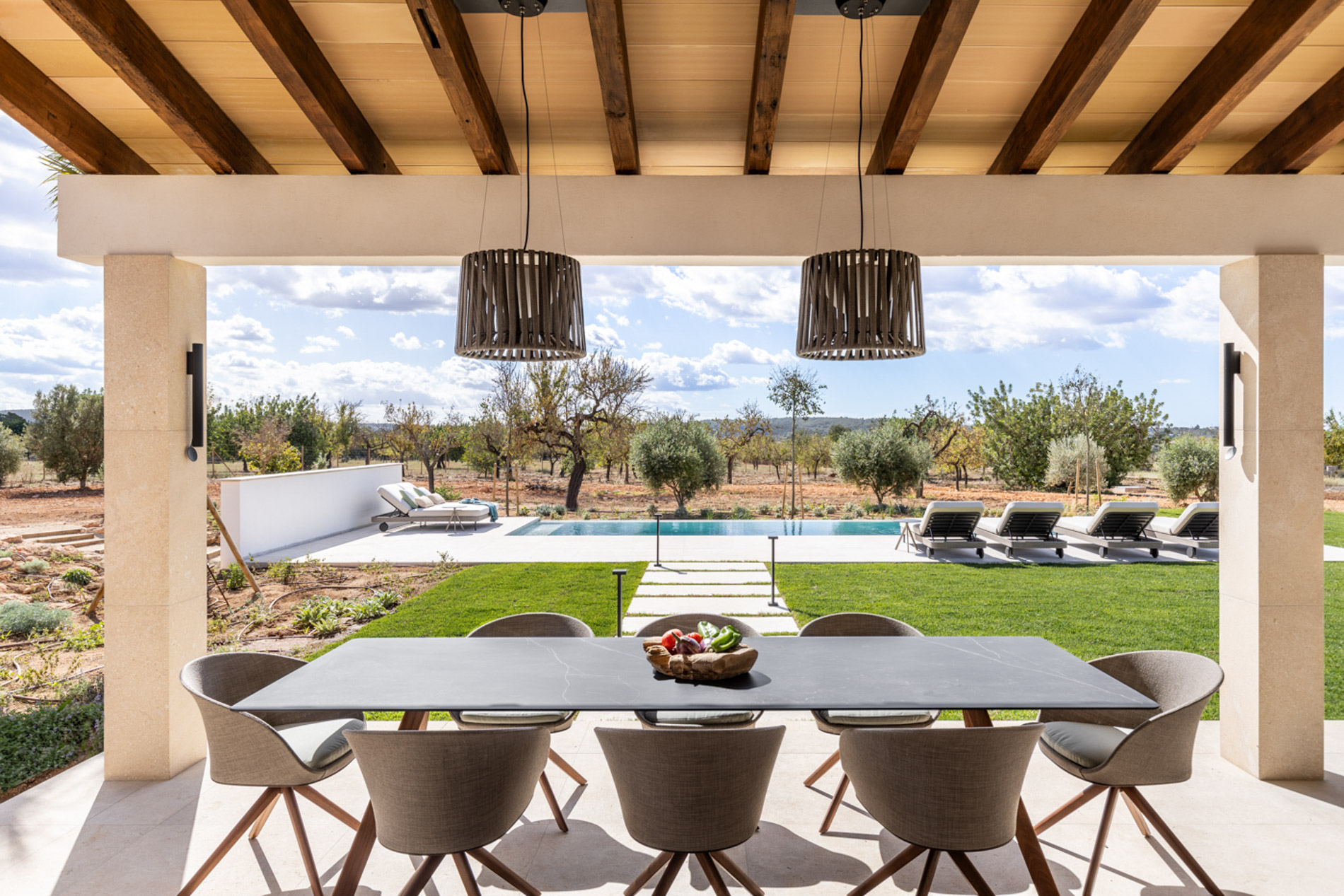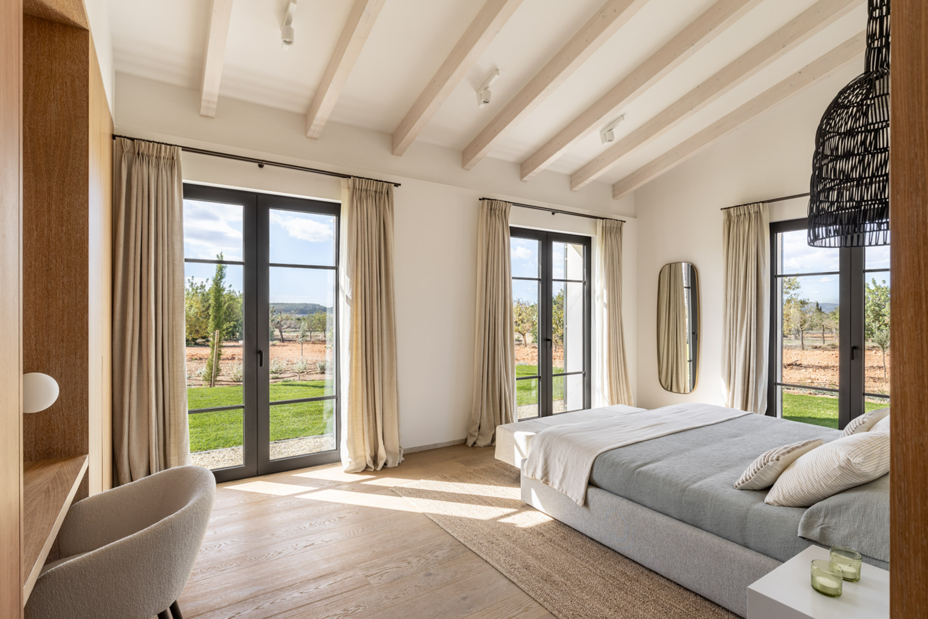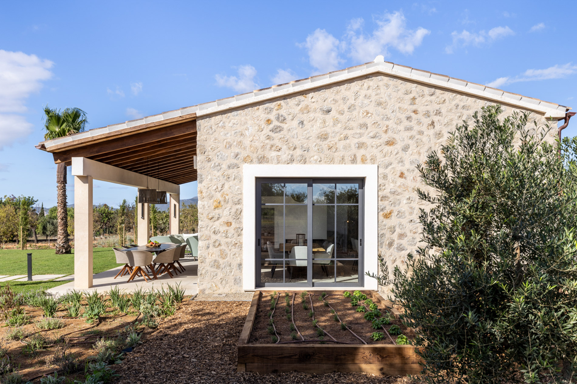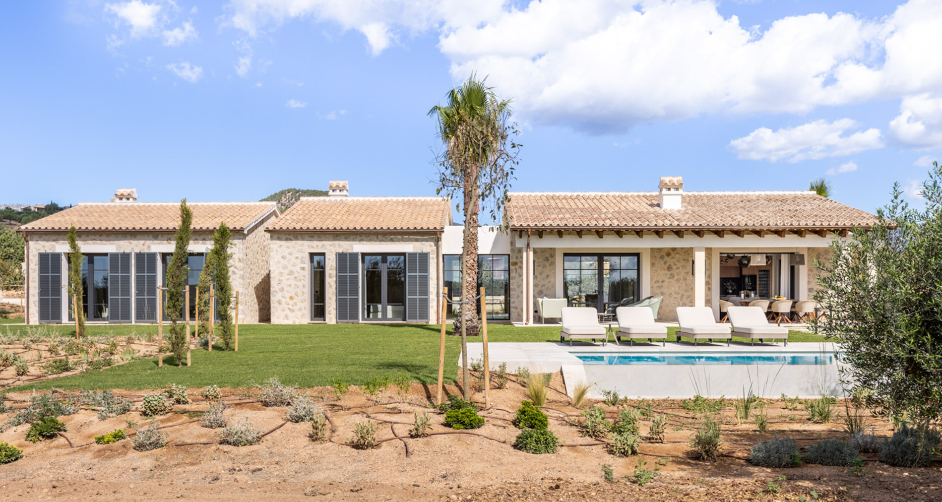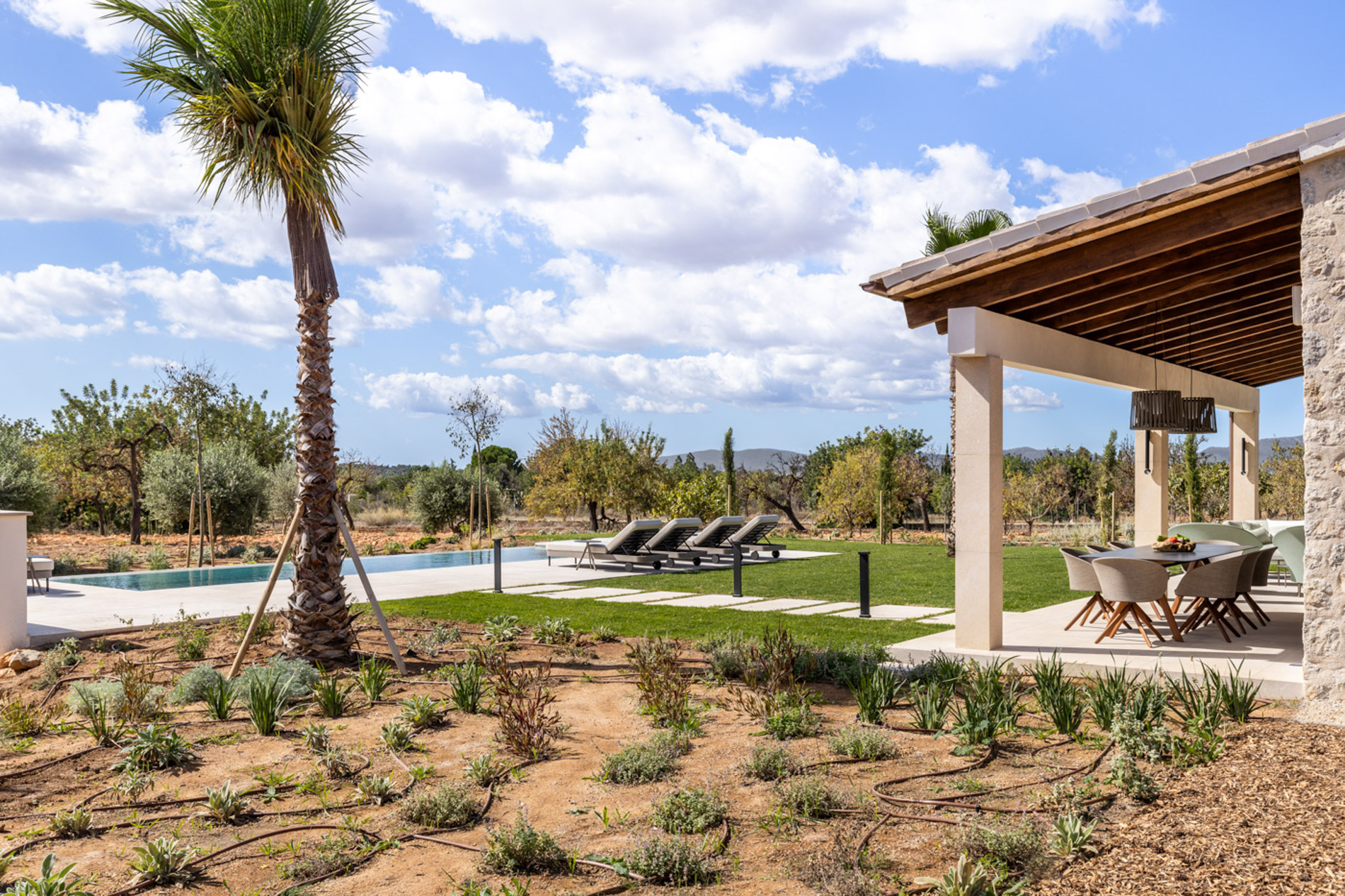 En el pintoresco pueblo de Santa Maria del Camí se encuentra una espectacular finca de nueva construcción que combina lujo y serenidad en un entorno natural privilegiado. Esta propiedad goza de una ubicación estratégica en el corazón de la isla, a tan solo 20 minutos de Palma, el aeropuerto y las playas más cercanas. Situada en una extensa parcela de 16.239 m², la finca ofrece una experiencia de vida exclusiva. En la planta baja, destaca una amplia zona de cocina-comedor de concepto abierto junto a una sala de estar, ambas sutilmente separadas por una elegante chimenea. Los tres dormitorios de la casa, todos con baños en suite, ofrecen acceso directo a los jardines, brindando vistas relajantes del entorno natural. Además, la propiedad cuenta con un aseo adicional para invitados. El nivel subterráneo incluye un garaje, una bodega, un baño, una sala de lavandería/despensa y un gran espacio multifuncional adaptable como gimnasio, sala de cine o una suite adicional para invitados, ofreciendo diversas opciones de uso. El exterior es un auténtico oasis de paz, con un frondoso jardín mediterráneo y una terraza cubierta, perfectos para disfrutar de momentos al aire libre. La piscina, de aproximadamente 34 m², se encuentra en medio de un paisaje sereno, proporcionando el lugar ideal para relajarse. Esta finca ha sido construida con materiales de primera calidad, incluyendo una fachada de piedra natural, vigas de madera expuestas, suelos de piedra Gris Zarci y una cocina hecha a medida. La propiedad está equipada con calefacción por suelo radiante, aire acondicionado, paneles solares, ventanas de doble acristalamiento y tecnología de aerotermia para agua caliente, garantizando comodidad y eficiencia energética durante todo el año. MallorcaSite, su agencia inmobiliaria de confianza en Mallorca, recomienda esta finca por ser la combinación perfecta de lujo, confort y estilo de vida mediterráneo.
