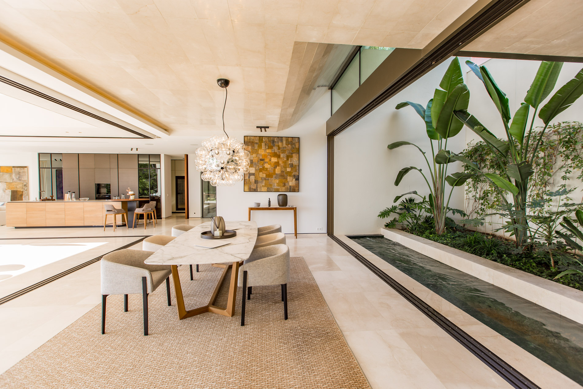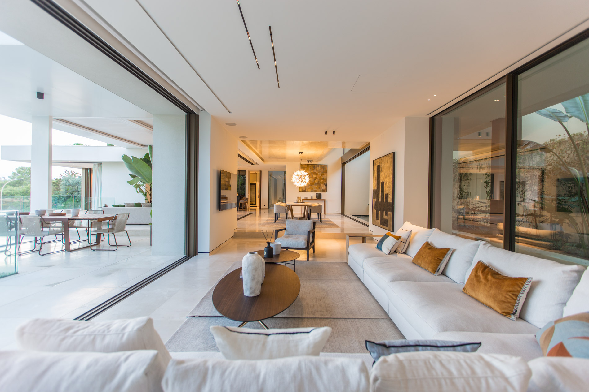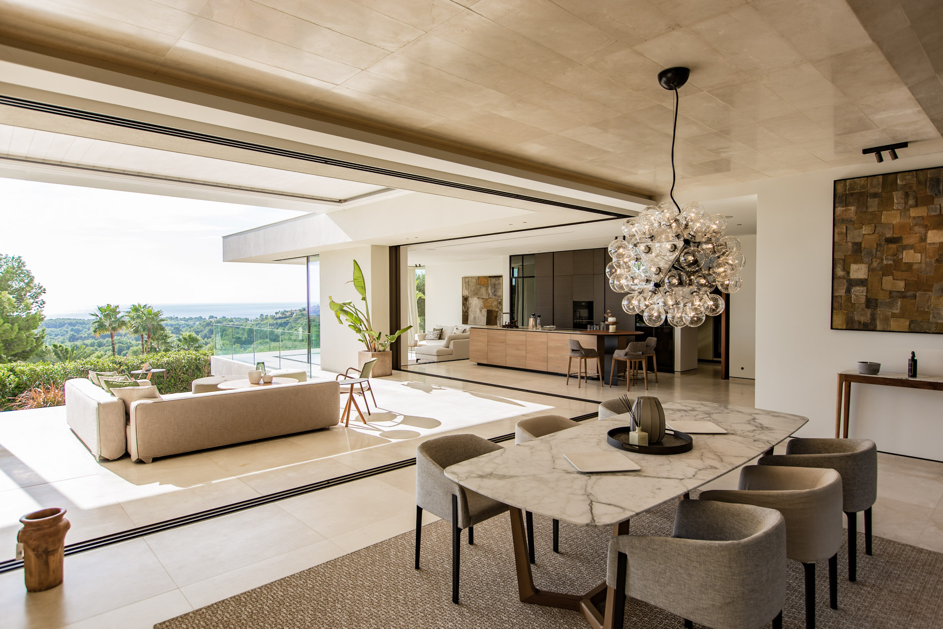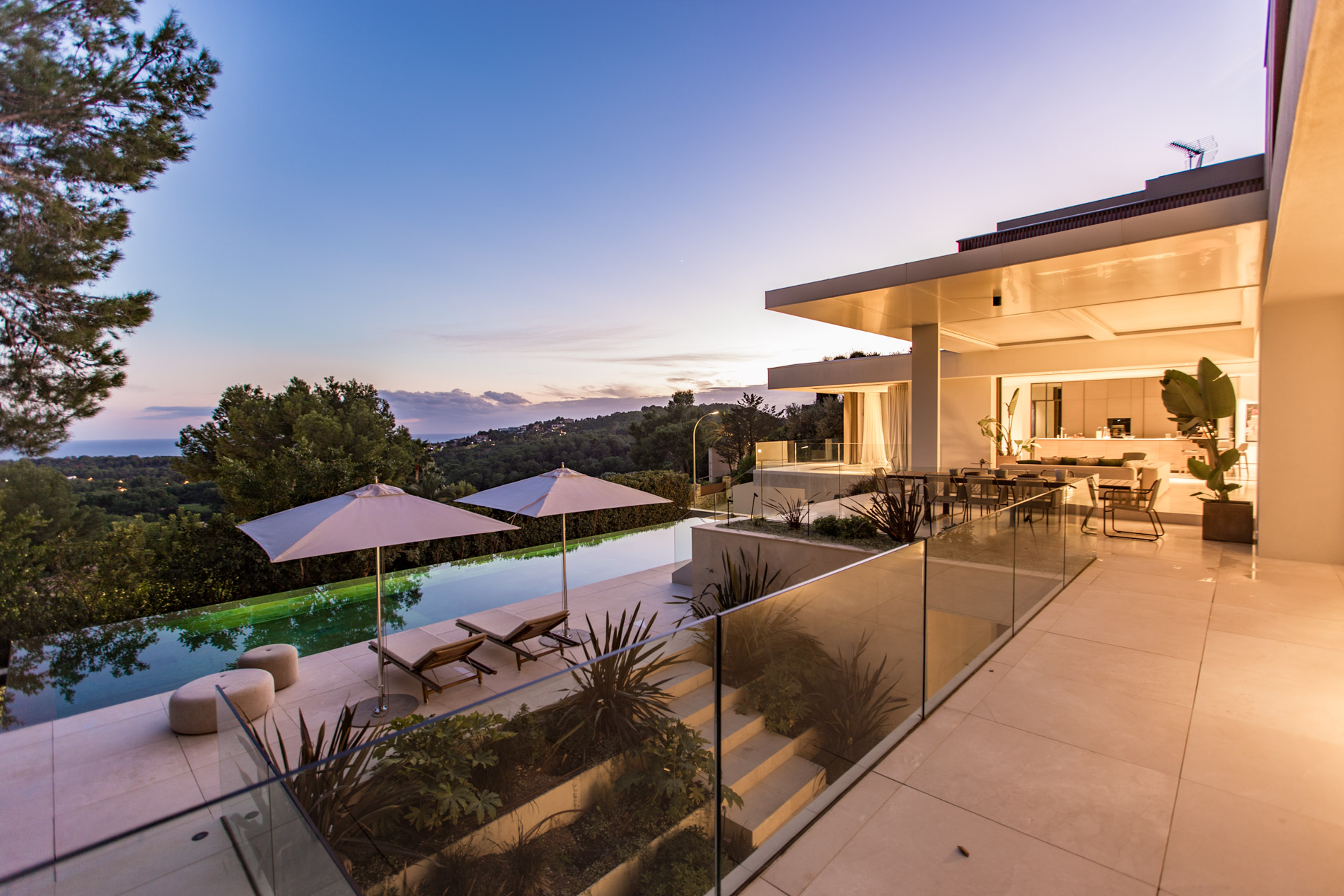 Esta villa es una auténtica obra de arte arquitectónica, diseñada con un nivel de detalle excepcional para resaltar las impresionantes vistas que la rodean. Su concepto vanguardista, desarrollado por un equipo internacional, fusiona materiales naturales de la isla con un entorno de ensueño, creando una propiedad única e inigualable. Distribuida en tres niveles, la villa cuenta con un nivel principal que alberga tres dormitorios, entre ellos una amplia y elegante suite principal con vistas al mar. Para el disfrute de los invitados, dos junior suites adicionales se encuentran en el nivel de la piscina, donde también se ubican una lujosa zona de spa y bienestar y un espacioso gimnasio. El nivel de vida, con su magnífica terraza al aire libre, es otro de los puntos culminantes de esta propiedad. Además de una sala de estar con comedor formal, la villa incluye una amplia y lujosa cocina Poliform con una sala contigua. Un elaborado sistema de iluminación aporta la atmósfera perfecta para cada ocasión. Con grandes ventanales minimalistas de Panoramah!, techos altos, y suelos de piedra natural y parquet de madera de alta calidad en las zonas de descanso, la villa se presenta como un espacio de lujo y confort incomparables. Su sistema domótico, de uso intuitivo y accesible desde cualquier dispositivo móvil, permite un control total del hogar. Las amplias zonas de aparcamiento están preparadas con estaciones de carga para vehículos eléctricos, ofreciendo todas las comodidades de una propiedad moderna y sostenible. Rodeada de exuberantes plantas tropicales y mediterráneas que complementan su diseño galardonado, esta villa es el epítome de la elegancia y el confort. MallorcaSite, su agencia inmobiliaria de confianza en Mallorca, recomienda esta propiedad por su diseño impecable, sus vistas espectaculares y la calidad excepcional de sus materiales.