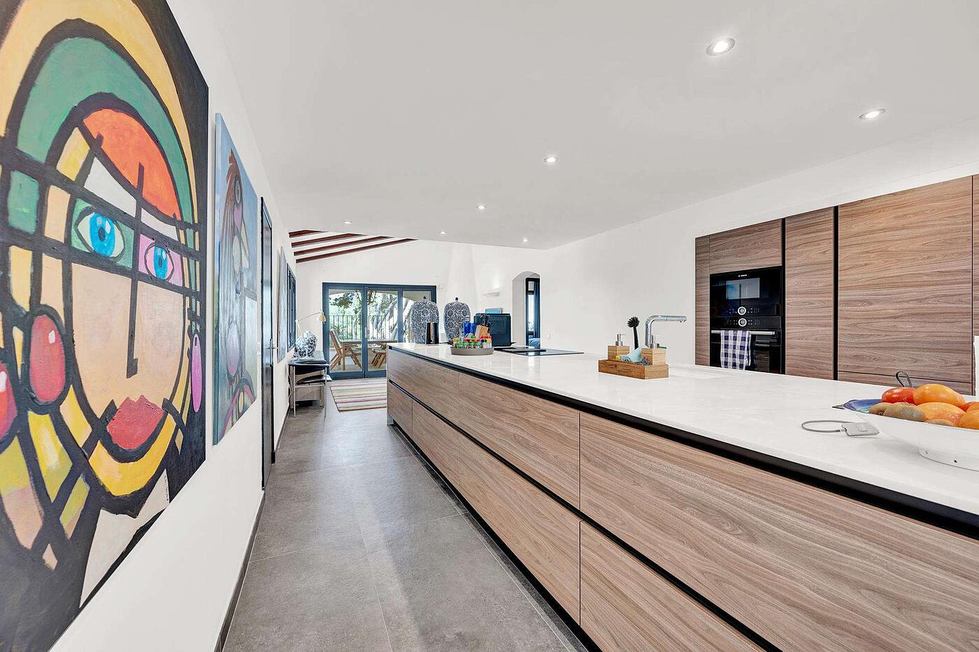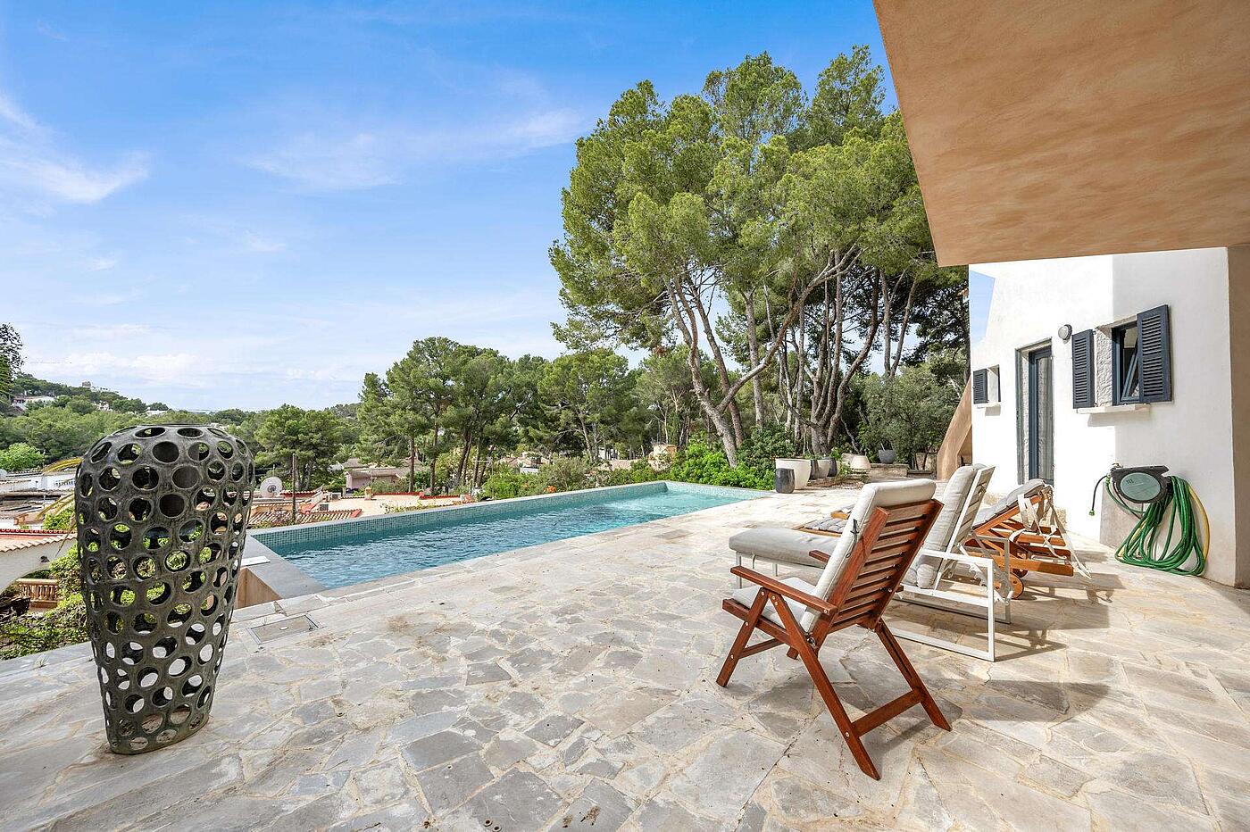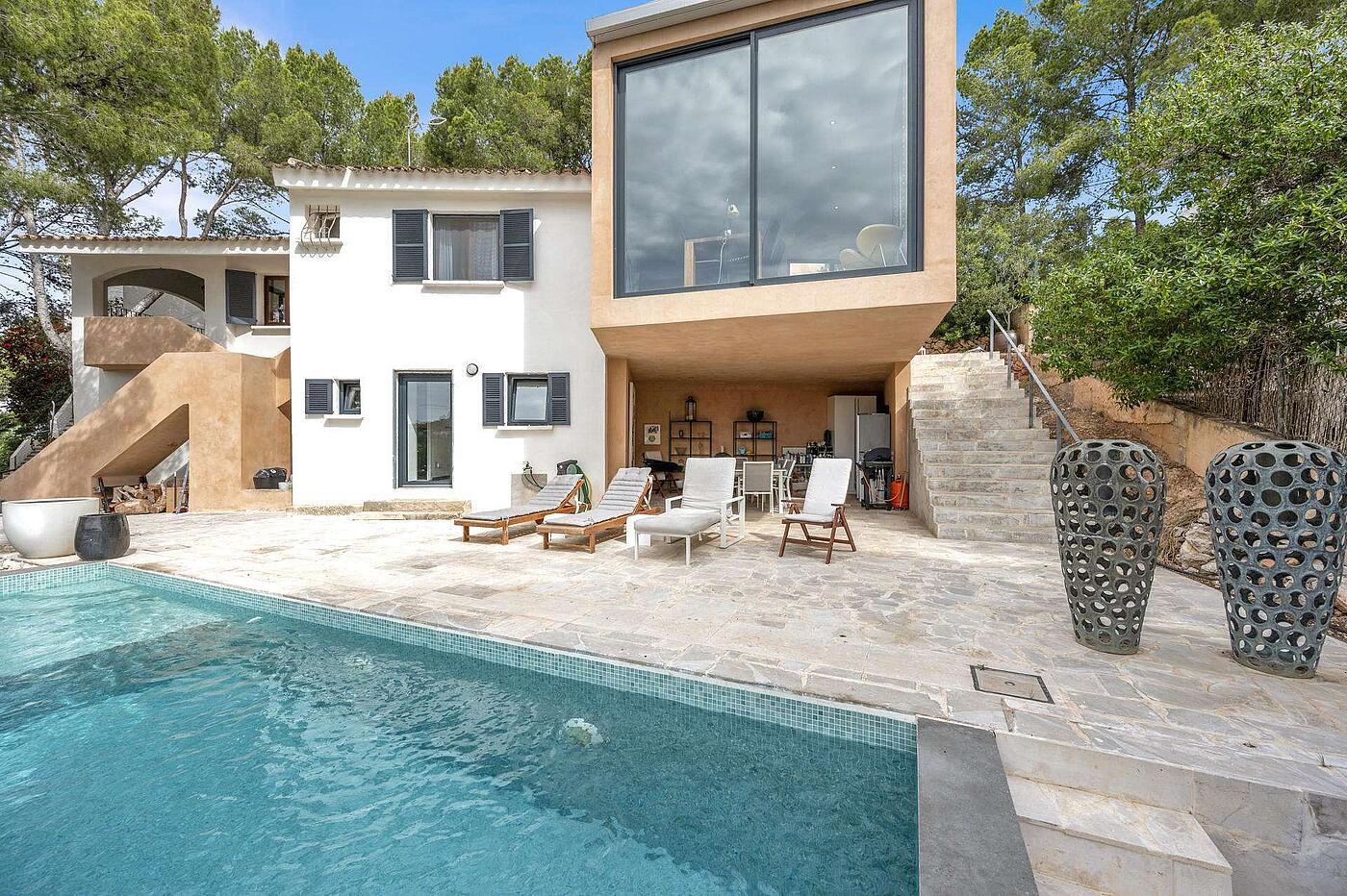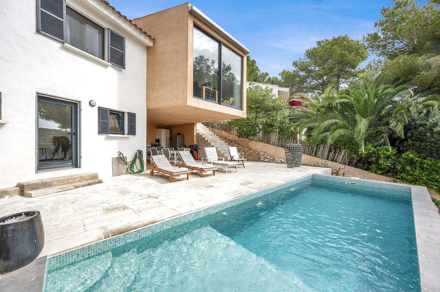 En una ubicación privilegiada del suroeste de Mallorca, esta impresionante villa ofrece una combinación perfecta de diseño contemporáneo, confort y funcionalidad. Situada en una de las zonas más tranquilas y codiciadas de Costa de la Calma (Calvià), la propiedad ha sido completamente renovada y ampliada con un proyecto arquitectónico de estilo refinado en 2023. Distribuida en dos plantas, la vivienda principal se encuentra en el nivel superior y ofrece un espacioso hall de entrada, un lavadero independiente, tres dormitorios con armarios empotrados y dos baños completos, uno de ellos en suite. La zona de día sorprende con un salón-comedor de techos altos, chimenea y un ambiente acogedor que se conecta con una zona de estudio abierta. La moderna cocina con isla de mármol blanco está totalmente equipada y se abre a una terraza cubierta ideal para comer al aire libre o relajarse disfrutando del entorno. En la planta inferior, con acceso independiente, se ubica una suite de invitados con baño propio y un acogedor salón-dormitorio, perfecta para alojar a familiares o visitas de forma privada. Los exteriores están pensados para el disfrute durante todo el año: un exuberante jardín rodea la vivienda, con una espectacular piscina de agua salada, una terraza cubierta equipada con cocina de verano y barbacoa, y un solárium en la azotea que ofrece vistas despejadas. En la planta inferior también se ha habilitado un cuarto técnico para la piscina. La propiedad está equipada con todas las comodidades modernas: aire acondicionado frío/calor en salón y dormitorios, suelos de gres y microcemento en las áreas comunes, ventanas Climalit con doble acristalamiento, amplio trastero, recogida de aguas pluviales subterránea y aparcamiento exterior para dos vehículos.