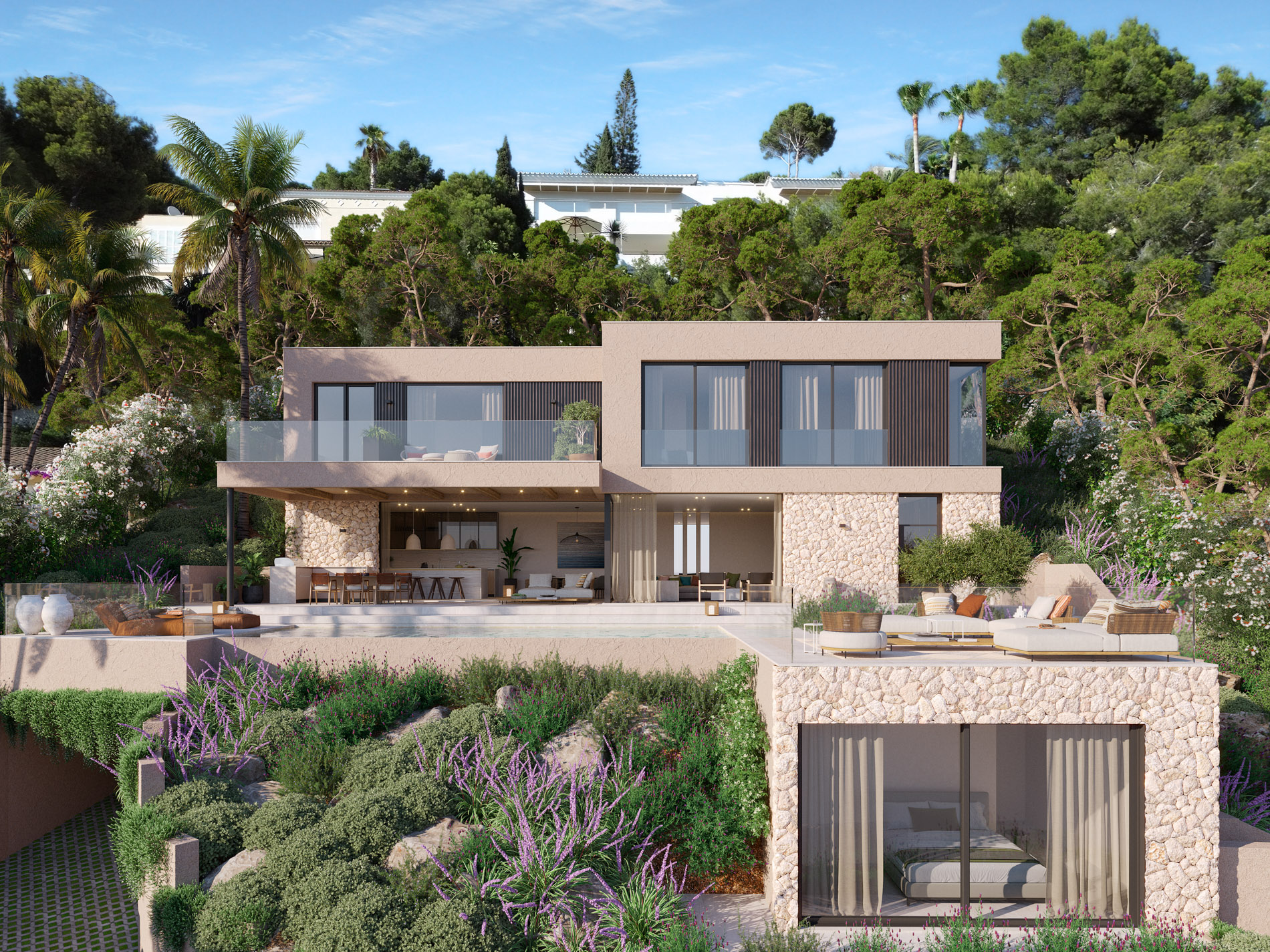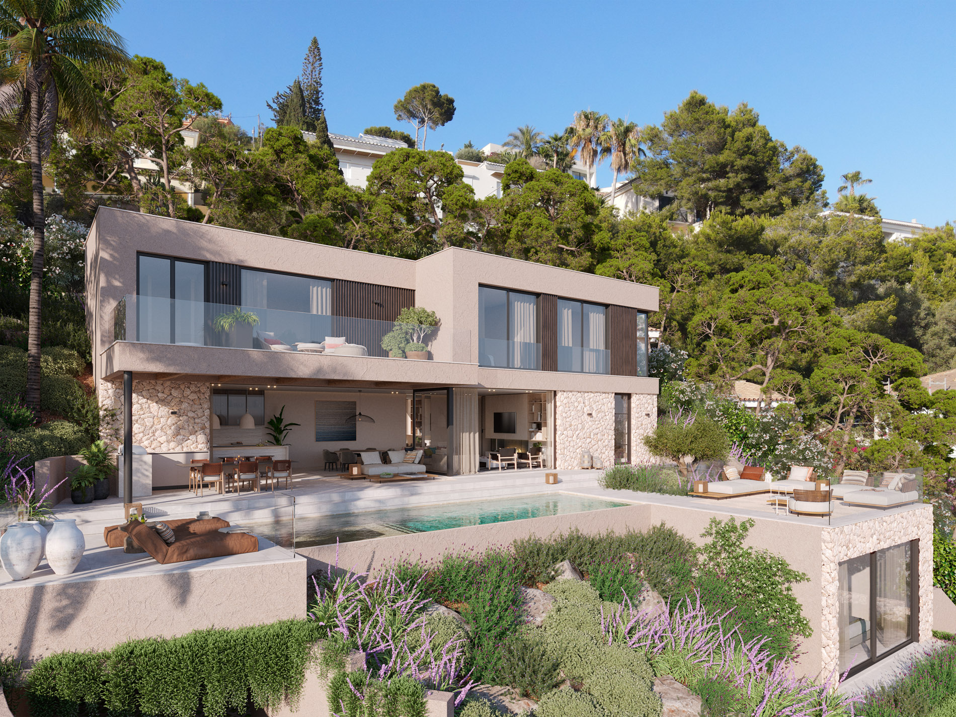 Situada en las colinas verdes de Costa d’en Blanes y orientada al suroeste, esta villa contemporánea disfruta de vistas abiertas al mar y de una luminosidad constante a lo largo del día. Su posición elevada garantiza privacidad y, al mismo tiempo, una relación directa con el paisaje mediterráneo, con panorámicas que se extienden sobre la bahía. La arquitectura combina líneas modernas y depuradas con materiales naturales, creando un equilibrio sereno entre diseño contemporáneo y entorno. Los muros de piedra, las texturas cálidas y las amplias superficies acristaladas definen el carácter de la vivienda y permiten que los espacios interiores se abran de forma natural hacia el exterior. La planta principal se concibe como un espacio abierto y fluido, donde salón, comedor y cocina se conectan de manera orgánica con la terraza cubierta, la zona chill-out y la piscina. El mar acompaña cada estancia y marca el ritmo de la vida cotidiana, mientras que la cocina y el comedor se orientan para aprovechar al máximo las vistas, ofreciendo un escenario pensado tanto para el día a día como para encuentros relajados. La planta superior está dedicada al descanso y la privacidad, con una amplia suite principal que cuenta con vestidor y baño en suite, junto a dos dormitorios adicionales, también con baño privado. Cada uno de estos espacios ha sido diseñado para transmitir calma, confort y una conexión visual constante con el entorno. El nivel inferior completa la vivienda con áreas funcionales y de bienestar, incluyendo un gimnasio y un garaje con capacidad para dos vehículos. Como valor añadido, una casa de invitados independiente aporta flexibilidad al conjunto, ideal para alojar invitados o personal, preservando siempre la intimidad de la residencia principal. Con volúmenes generosos, espacios exteriores cuidadosamente diseñados y una ubicación definida por las vistas, la orientación y la luz, esta propiedad representa una interpretación refinada del estilo de vida mediterráneo contemporáneo. MallorcaSite recomienda esta propiedad por su arquitectura equilibrada, su ubicación elevada en Costa d’en Blanes y la forma serena y natural en la que se integra en su entorno.