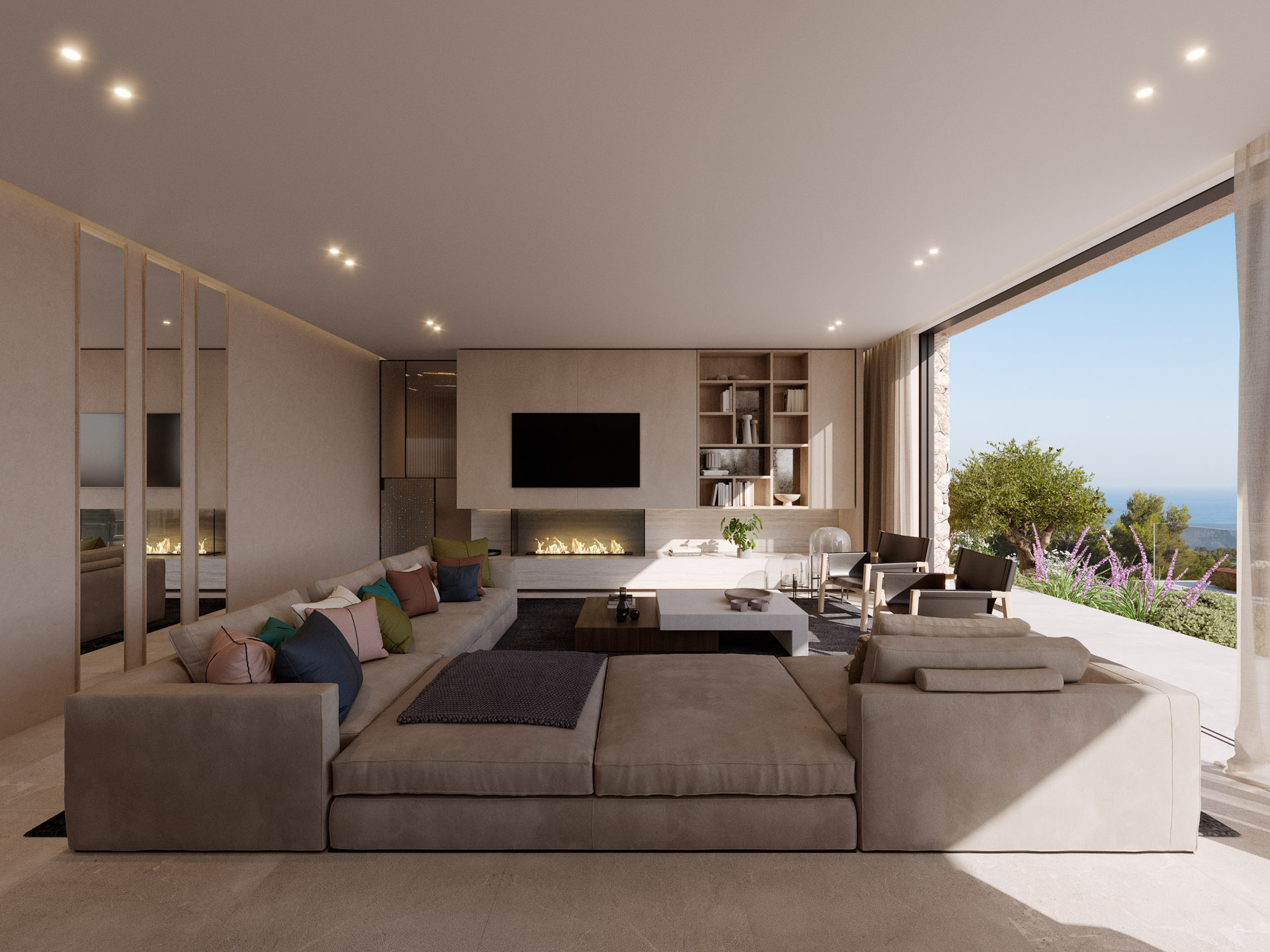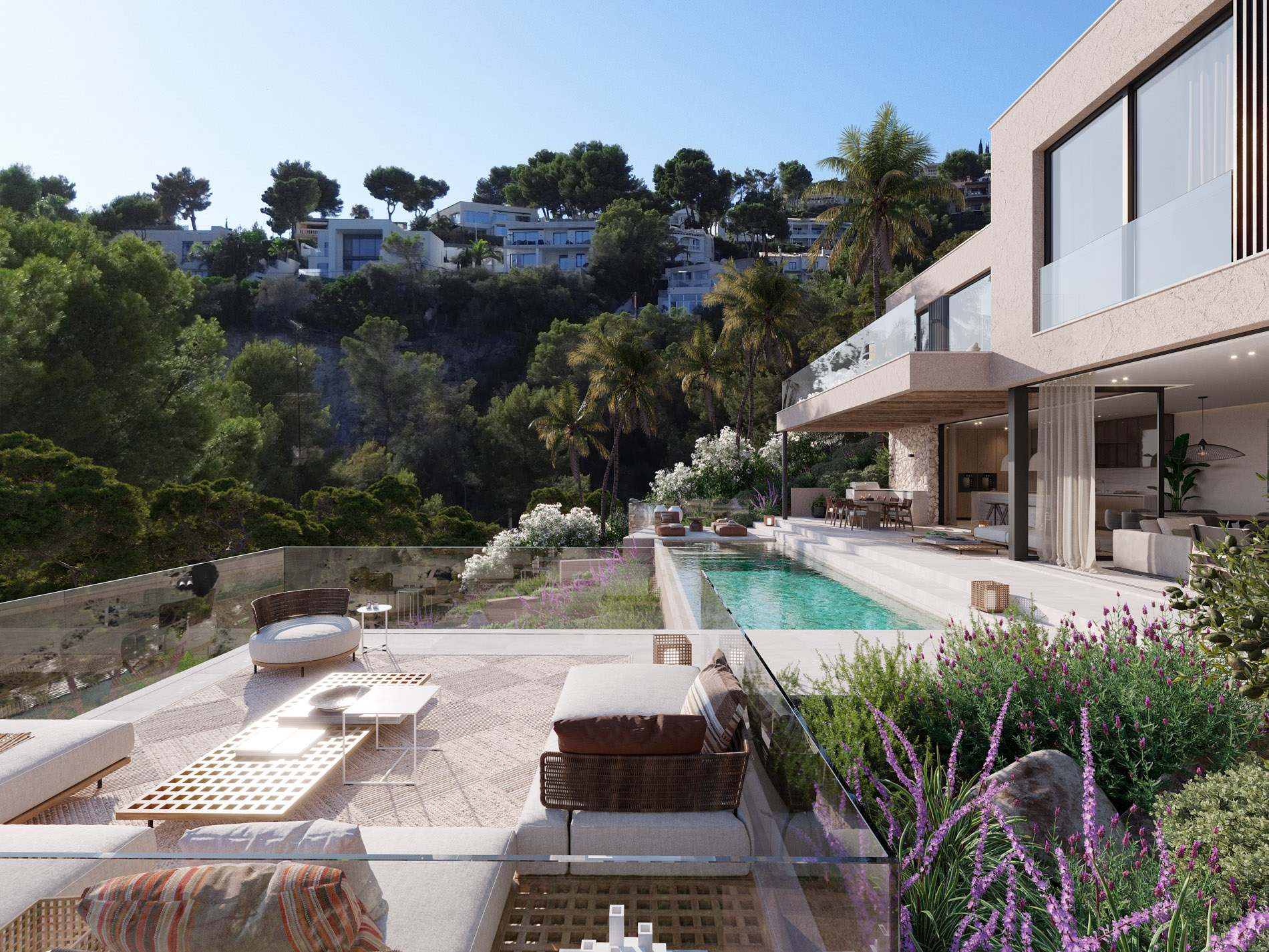 Situada en las colinas verdes de Costa d’en Blanes y orientada al suroeste, esta villa contemporánea disfruta de vistas abiertas al mar y de una luminosidad constante a lo largo del día. Su posición elevada garantiza privacidad y, al mismo tiempo, una relación directa con el paisaje mediterráneo, con panorámicas que se extienden sobre la bahía.