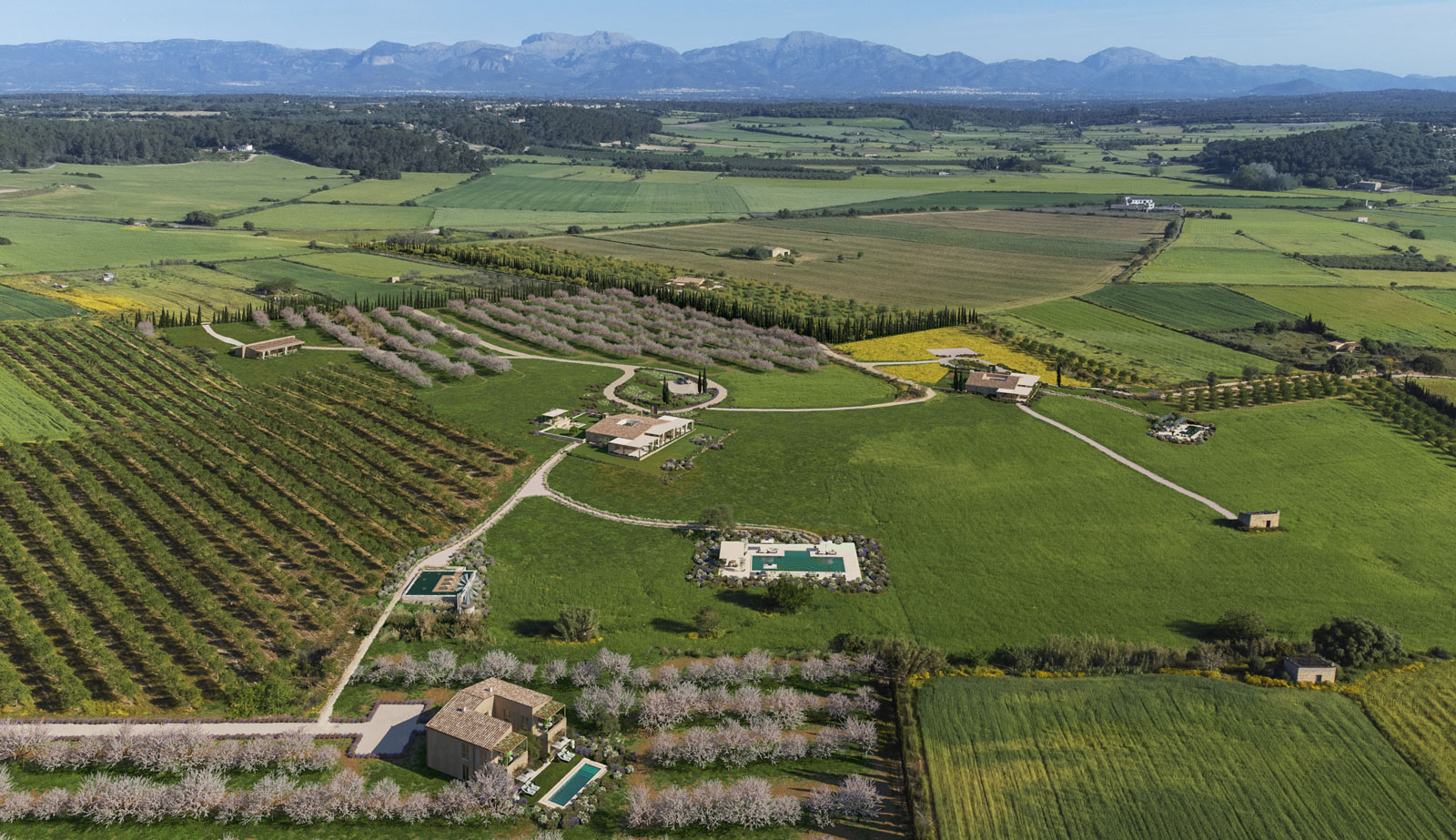 La arquitectura como forma de vida - Una finca contemporánea enraizada en la naturaleza atemporal de Mallorca Situada entre viñedos y árboles de almendros, olivos y algarrobos, esta extraordinaria finca es un santuario privado donde el diseño y la naturaleza conviven en perfecta armonía. Creada en estrecha colaboración con un maestro de Feng Shui, cada elemento —desde la distribución hasta la orientación— ha sido concebido para potenciar el bienestar, el flujo de energía y la conexión con el paisaje. La propiedad se compone de cuatro villas independientes, cada una con una arquitectura refinada, amplios espacios y vistas panorámicas. Más de 2.700 árboles y un viñedo de media hectárea enmarcan la atmósfera serena de la finca. Un camino privado de 2,8 km serpentea entre campos de romero y jardines mediterráneos, conectando piscinas, un pabellón para contemplar la puesta de sol, una plataforma de yoga y meditación, y áreas al aire libre diseñadas para la calma y la conexión. La parte agrícola de la finca es completamente biodinámica y libre de pesticidas, con 1.300 almendros, 1.000 olivos, 550 algarrobos, 50 cítricos y 12 colmenas en producción, todas cuidadas por el único viticultor y olivicultor de la isla certificado por Demeter. La finca dispone de su propio pozo de agua y paneles solares. Existe la opción de desarrollar una quinta casa bajo la licencia de construcción actual y ampliarla hasta 1.500 m³ según las nuevas regulaciones rurales. Ubicada a tan solo 20 minutos de Palma, el aeropuerto y la costa, esta finca de 25 hectáreas ofrece total privacidad, un confort excepcional y el espacio para disfrutar de la vida lentamente, estación tras estación. Un hogar no solo para vivir, sino para sentir, preservar y legar.