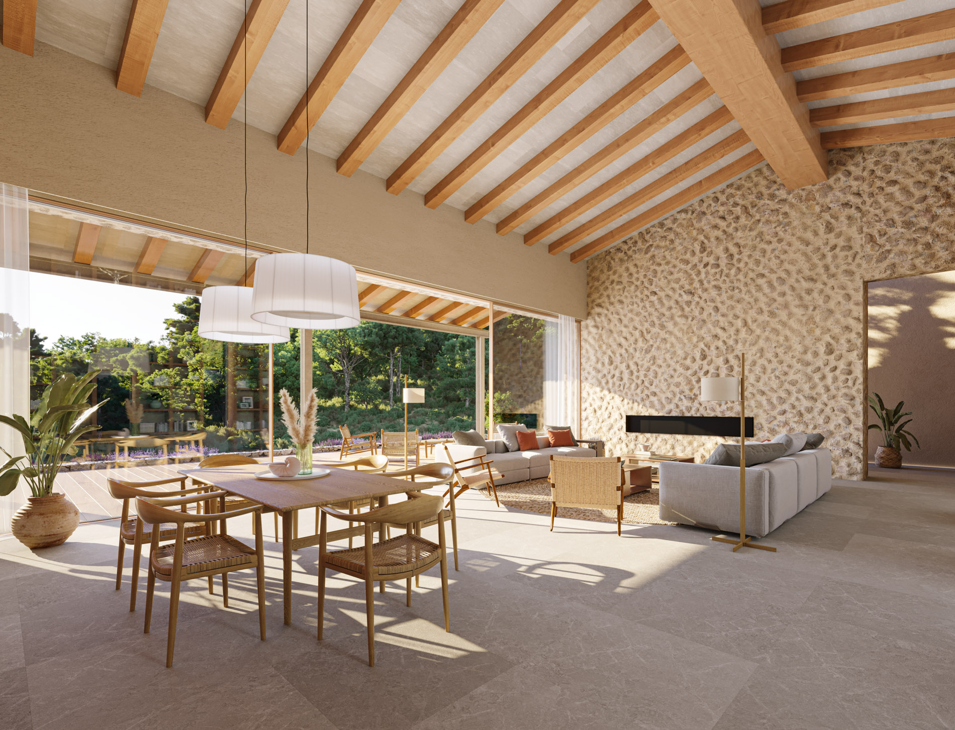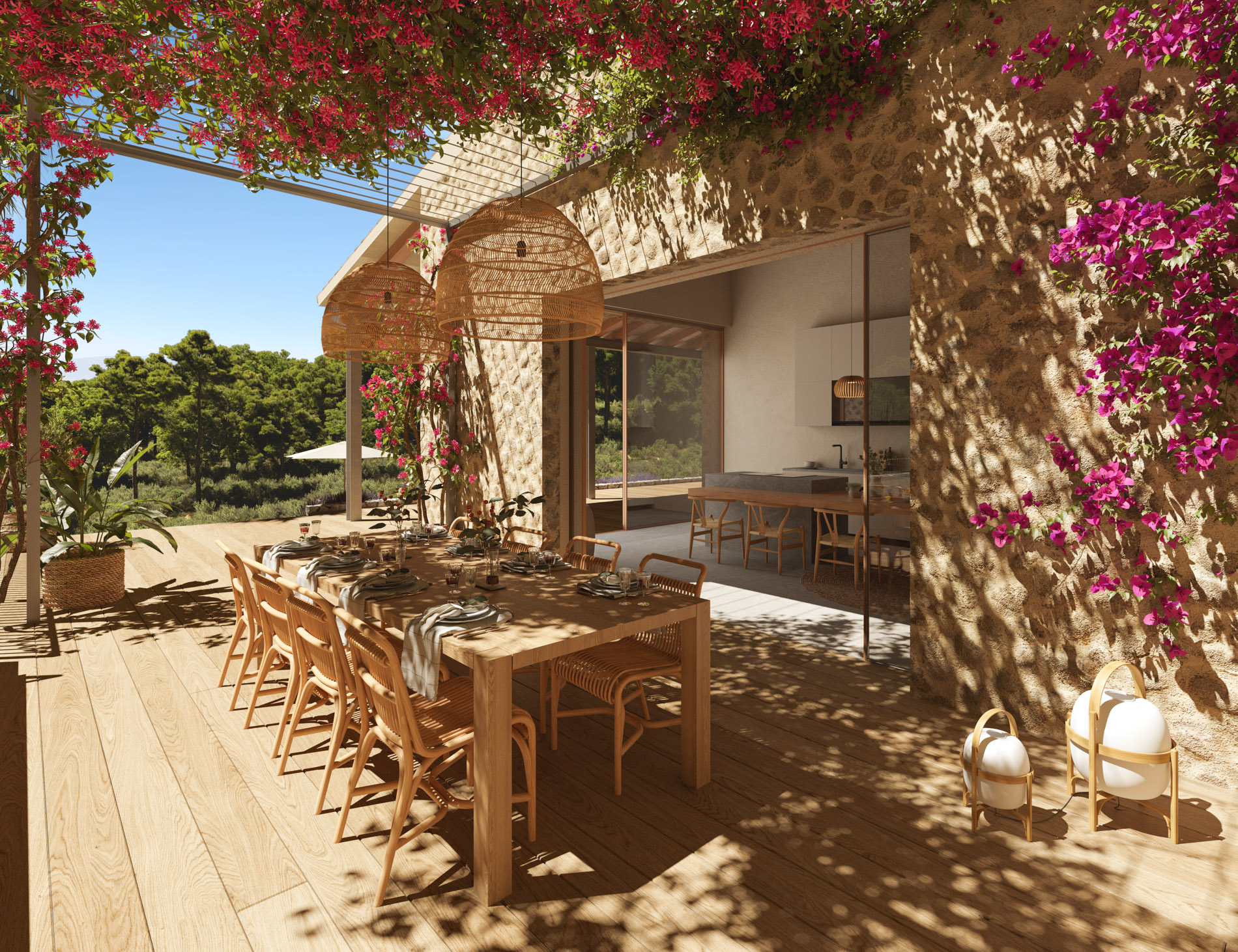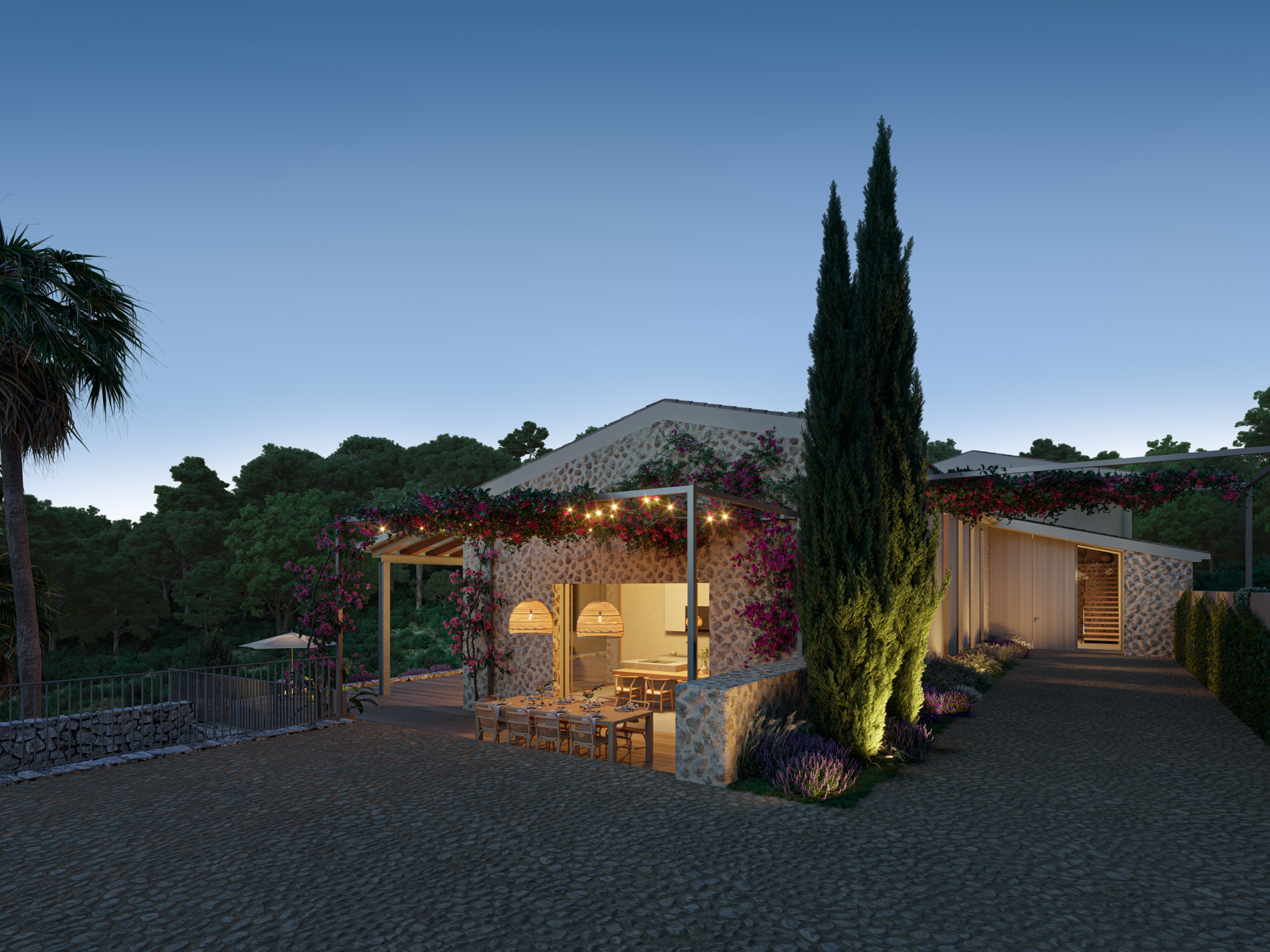 Una casa concebida desde su inicio para integrarse en el paisaje y diera protagonismo al extraordinario enclave natural que la rodea, en el corazón de la Serra de Tramuntana. Este proyecto de obra nueva con vistas hasta la Bahía de Palma está situado en una zona privada entre Bunyola y Santa Maria, a tan sólo 5 minutos de Santa María del Camí. El concepto de la propiedad es una combinación de arquitectura moderna con elementos naturales de la isla como la piedra y la madera. Este énfasis en el paisaje se aprecia al crear el acceso a la propiedad por la parte trasera, para no invadir la vista privilegiada que se despliega ante la vivienda.