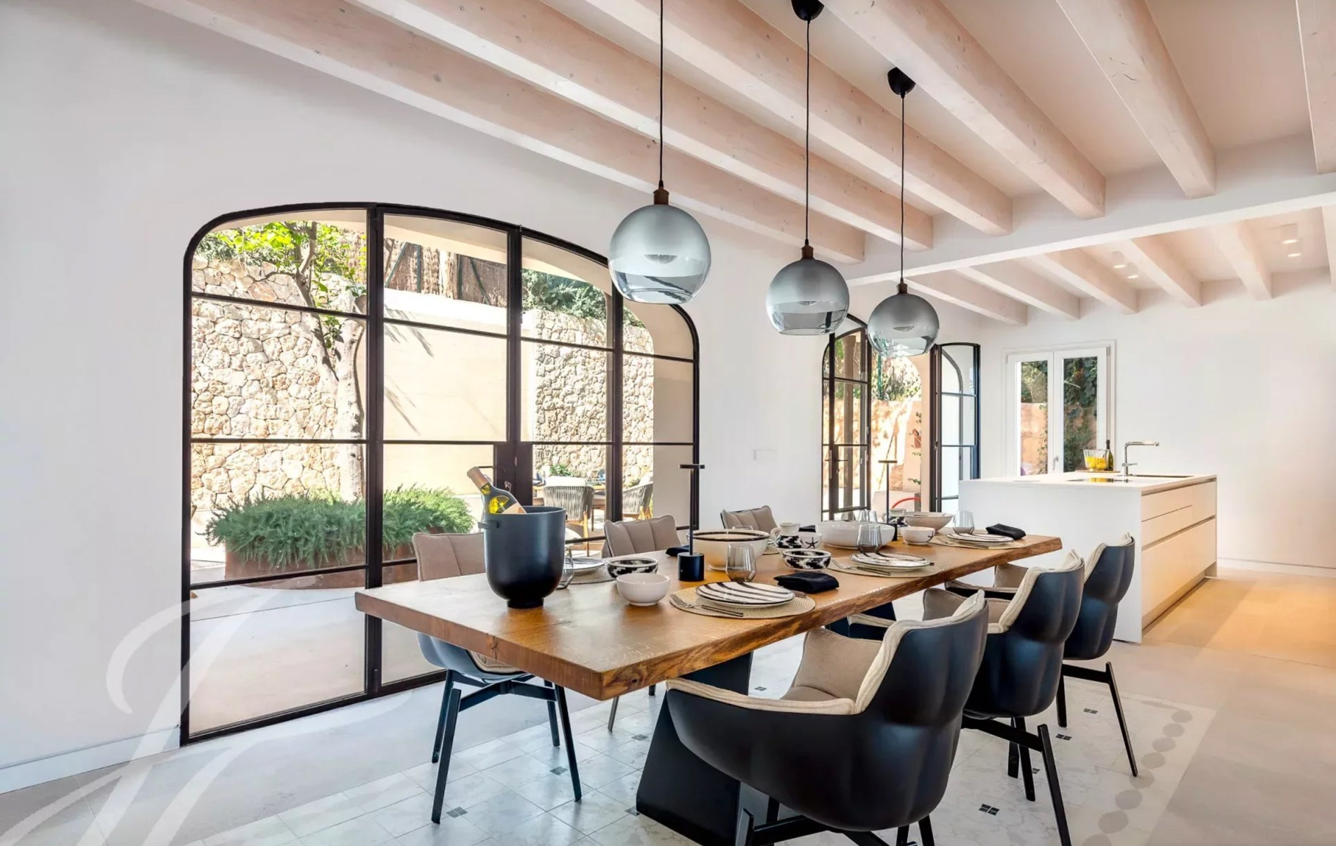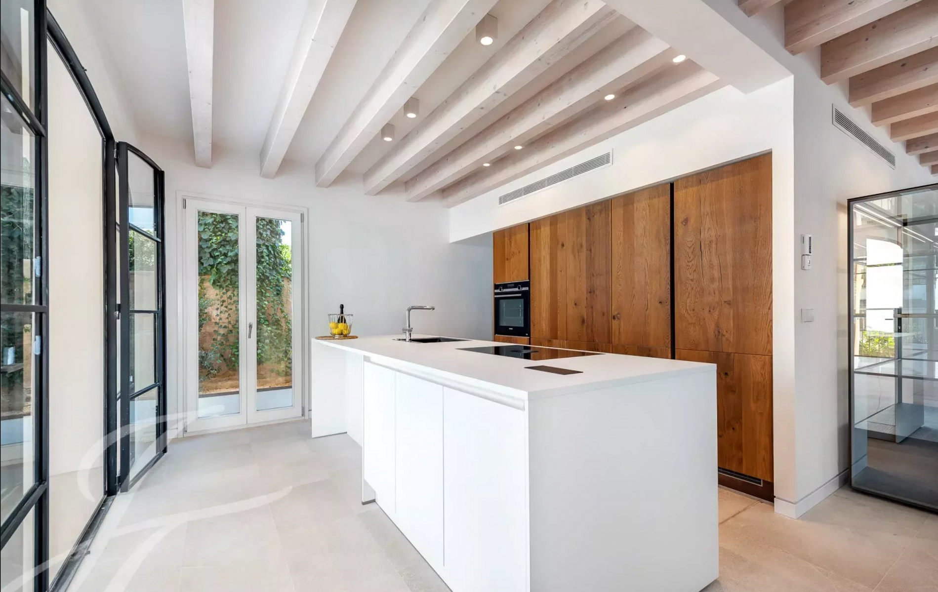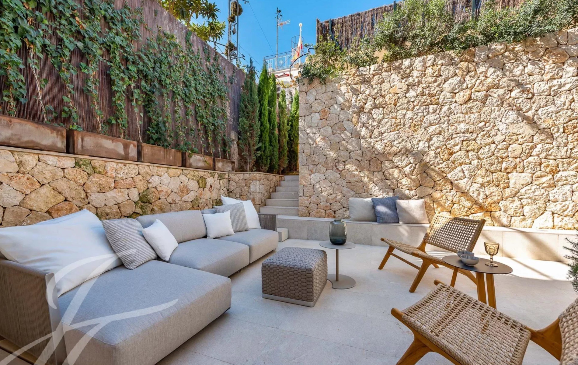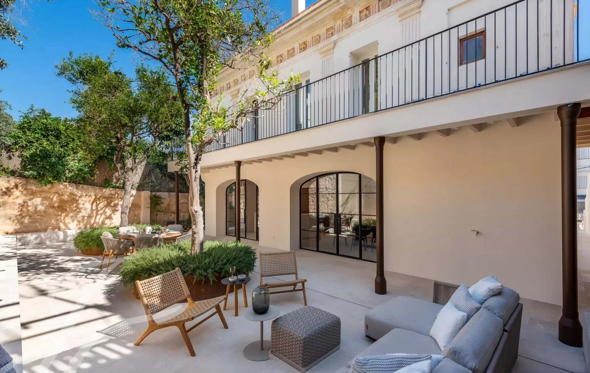Antigua residencia del artista Santiago Rusiñol, la historia de la villa se puede reconocer a primera vista, especialmente en el estuco único de la fachada y las estatuas históricamente protegidas, que han sido restauradas con meticuloso esmero y devuelta a la vida Al acceder a la villa, nos encontramos con una amplia zona exterior con piscina privada de 23 m2 y una terraza soleada que conduce a la entrada. Además, la planta baja ofrece un aljibe histórico que ha sido reformado y ofrece un espacio perfecto para una bodega, gimnasio o zona de spa. Este nivel se completa con un baño completo y espacio para un trastero. La planta principal es el mejor ejemplo de espacio diáfano que incorpora espacios interiores y exteriores para garantizar el máximo confort y calidad de vida. Su luminoso espacio incluye un amplio salón, comedor y cocina totalmente equipada con electrodomésticos Siemens / Bora / Liebherr. Esta zona se abre al porche con vistas al jardín / piscina y en la parte trasera a un magnífico patio privado rodeado de hermosas plantas mediterráneas, árboles, cascada que fluye suave, piedra natural tallada a mano y está amueblado tanto para disfrutar de comidas al aire libre como para relajarse en total privacidad. La planta principal se completa con una oficina independiente, zona de lavandería y aseo de invitados. La planta superior está pensada para el descanso y consta de un espacioso dormitorio principal con baño en-suite y acceso a una amplia terraza con vistas a la zona de la piscina y vistas parciales al mar. Además, dispone de dos dormitorios adicionales, cada uno con armarios empotrados, baños en-suite y acceso a su propia espaciosa terraza Un elemento absolutamente a destacar es la terraza chill-out en la azotea, amueblada acogedoramente y con vistas de 360 grados sobre el barrio, el castillo de Bellver y parcialmente al mar que completan esta propiedad única. La villa dispone de más de 200 m2 de terrazas, aire acondicionado, calefacción por suelo radiante, puerta automática garaje, parking exterior, y se vende completamente amueblada. Se encuentra a poca distancia del casco antiguo de Palma, así como a 5-10 minutos en coche de las playas, es realmente una joya escondida en la popular zona de El Terreno.