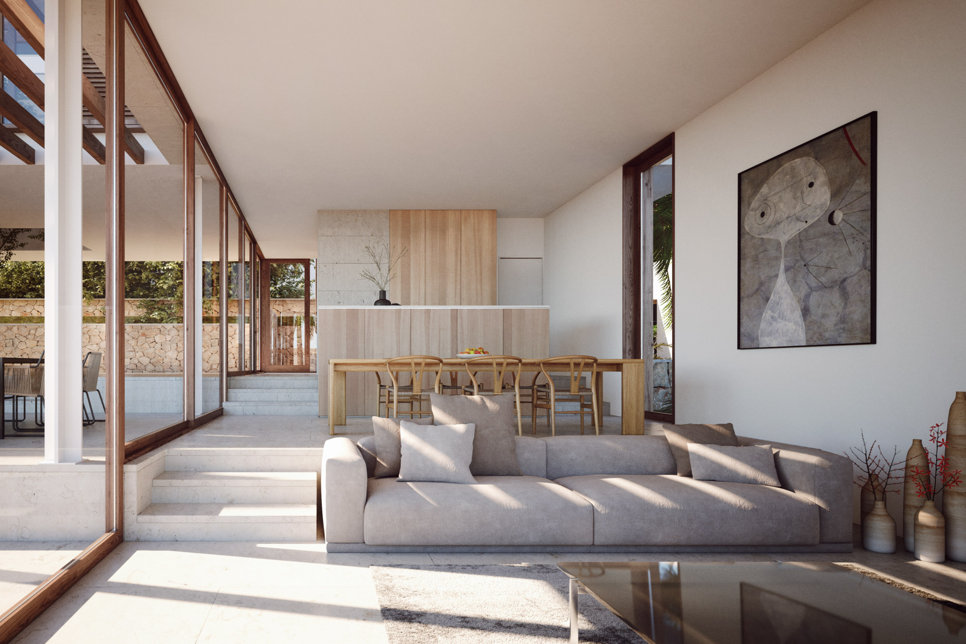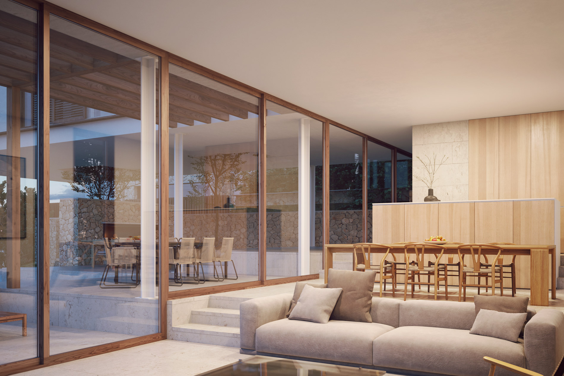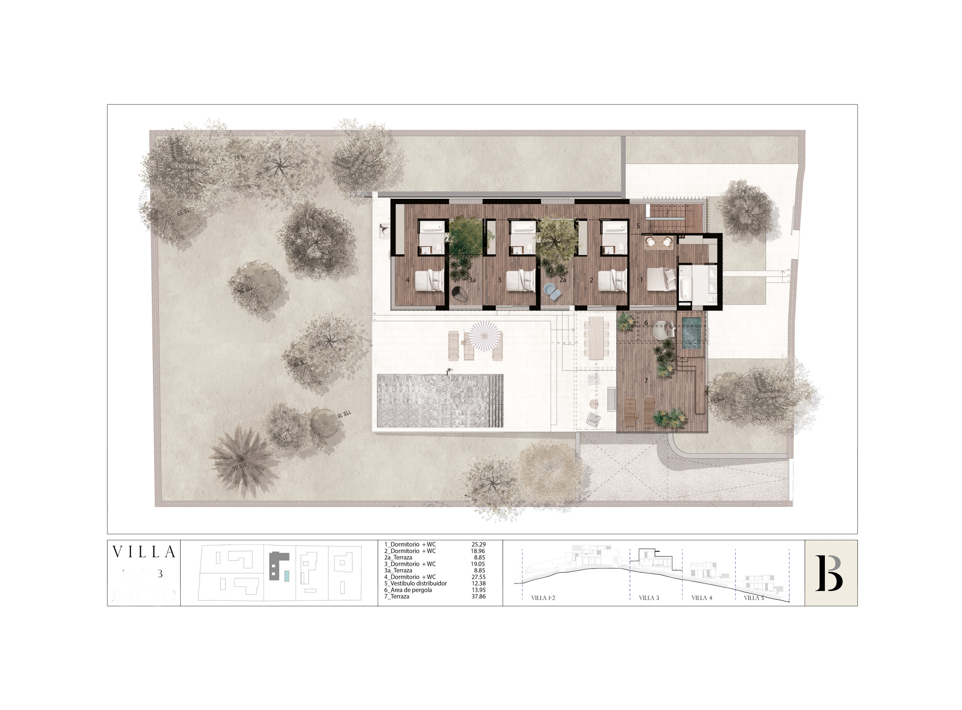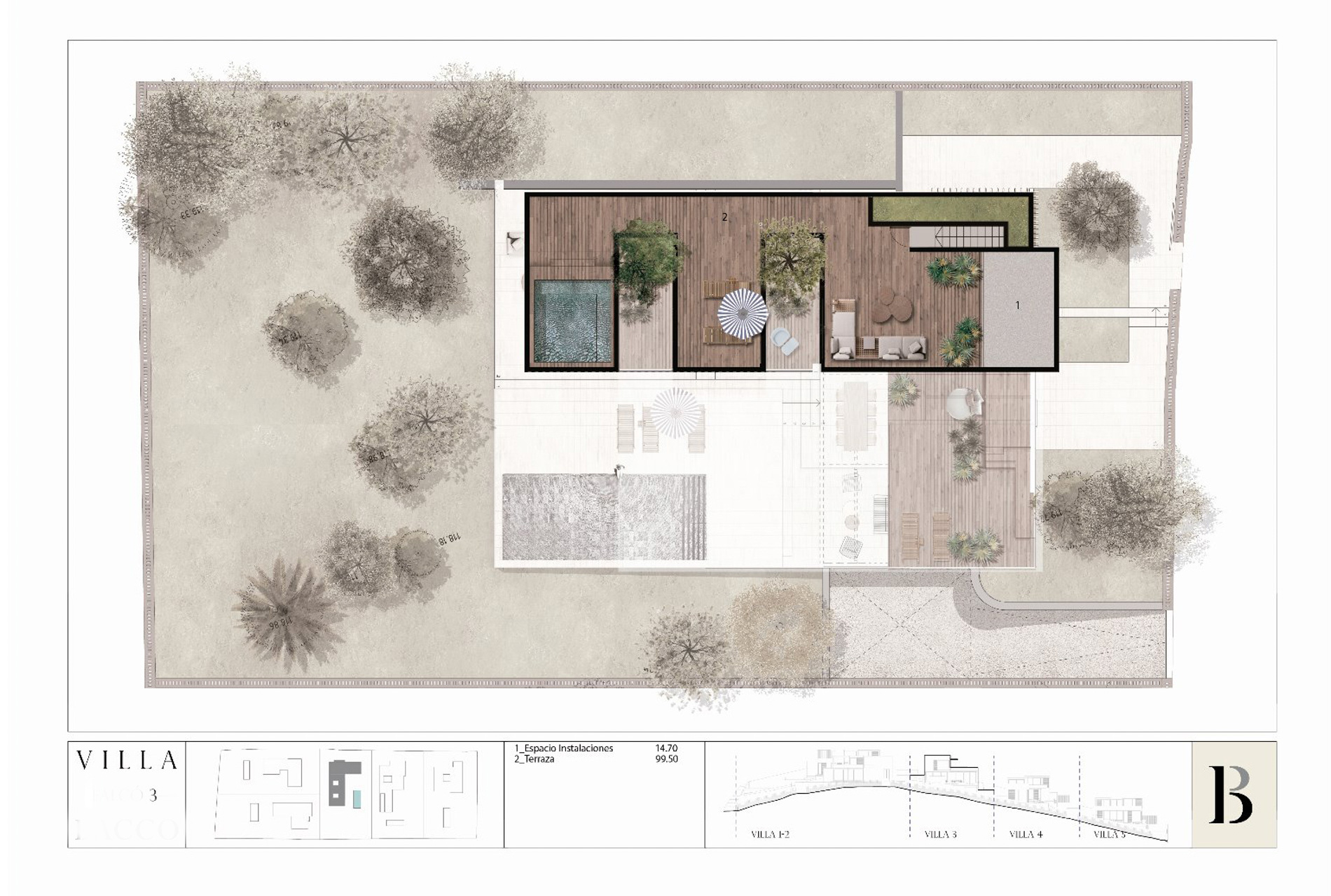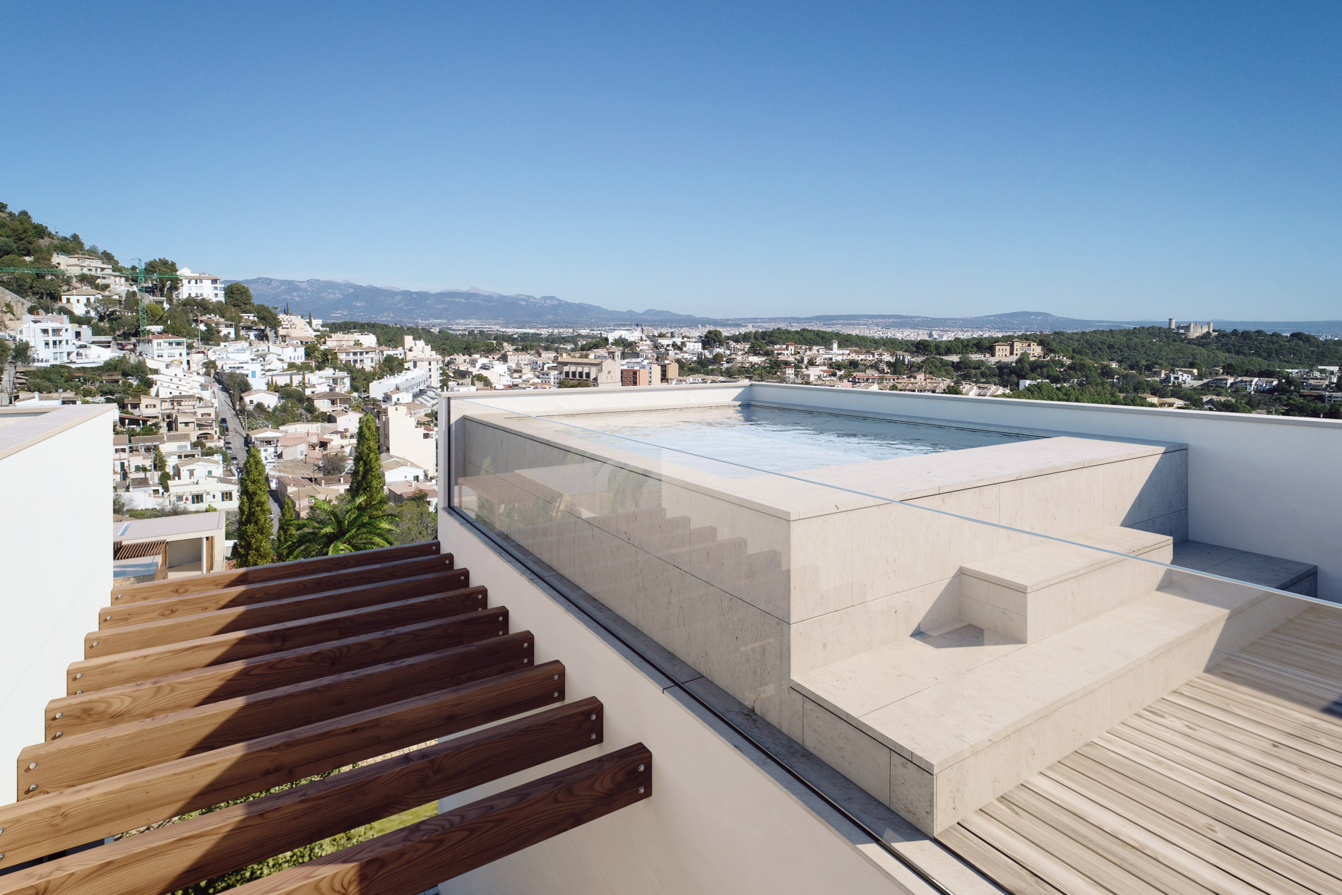 Villa de estilo contemporaneo en forma de L con piscina en la azotea con vistas al mar en Genova Esta villa de lujo está ingeniosamente diseñada en forma de L, con la planta baja formando un lado de la L, el otro lado formado por el piso superior, que se eleva sobre columnas, creando un espacio de vida al aire libre a la sombra debajo. Mirando hacia el este, se beneficia del sol de la mañana, las vistas de los alrededores y una gran cantidad de espacios al aire libre. El amplio uso de madera y piedra tanto en interiores como en exteriores le da una sensación cálida y orgánica y la continuidad de los materiales garantiza una estética consistente y sofisticada. Las grandes puertas de vidrio retráctiles hacen que los interiores sean luminosos y aireados y permiten que se abran por completo en climas cálidos. La planta baja consta de un plan abierto, cocina de dos niveles, comedor y sala de estar, con puertas de vidrio de piso a techo que conducen a un área de comedor cubierta y una segunda terraza parcialmente sombreada. Desde allí, los pasos conducen a una terraza soleada de la piscina. Esta villa también cuenta con una segunda piscina en la azotea donde los residentes pueden disfrutar de las vistas de la costa sur y el mar. Extendiéndose hacia el sur desde el hall de entrada, baño de visitas y cuarto de servicio, la terraza principal está sombreada por la estructura del primer piso y dividida en diferentes ambientes por secciones ajardinadas donde los árboles se elevan entre las habitaciones de arriba. Las cuatro habitaciones dobles, cada una con su propio baño privado, se encuentran en el primer piso. El dormitorio principal tiene una terraza privada y otros dos dormitorios tienen acceso a una segunda terraza. Esta propiedad también cuenta con un garaje subterráneo con espacio para cuatro coches. MallorcaSite, su agencia inmobiliaria en Mallorca, recomienda esta propiedad por sus vistas, su ubicación y sus calidades.