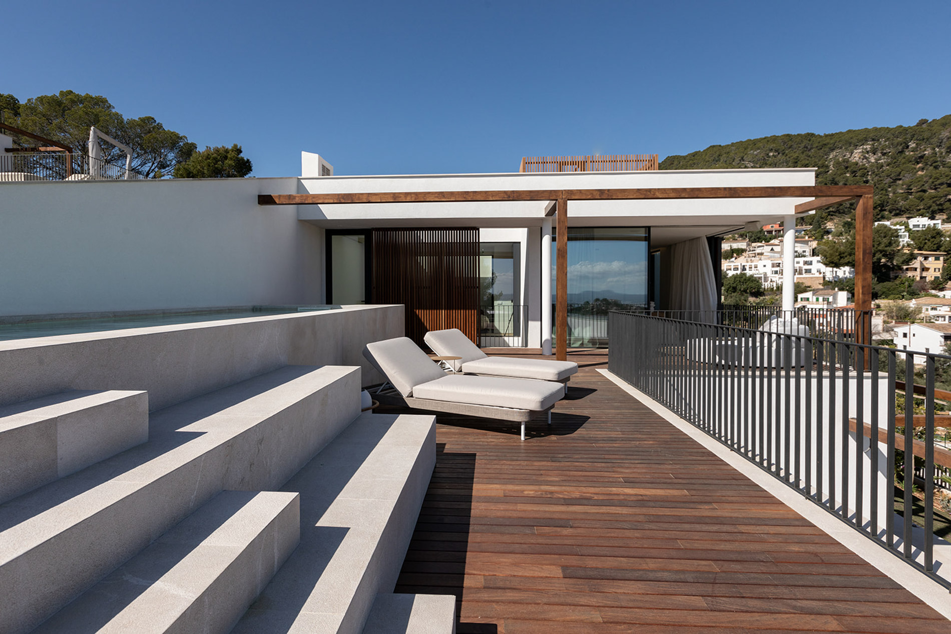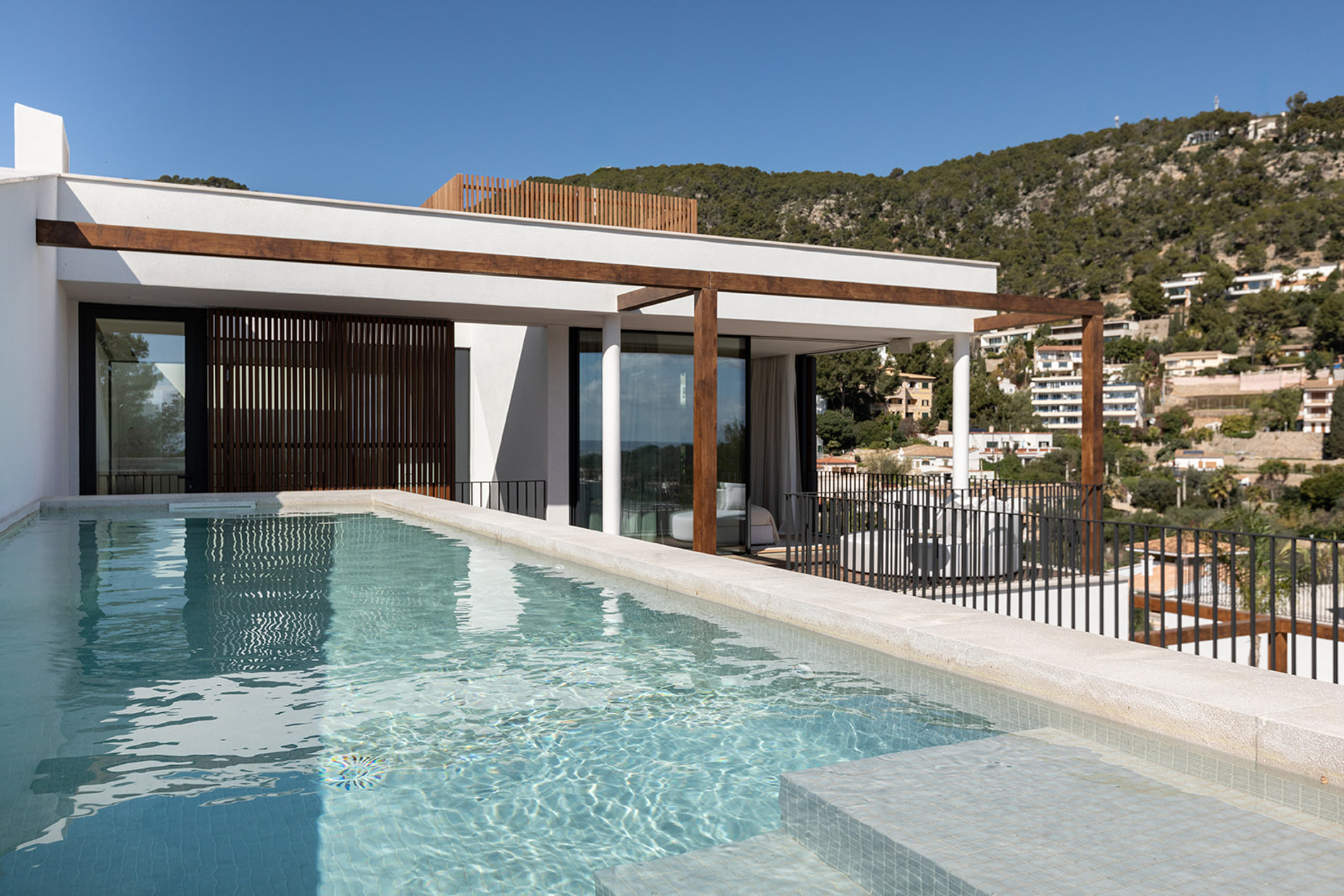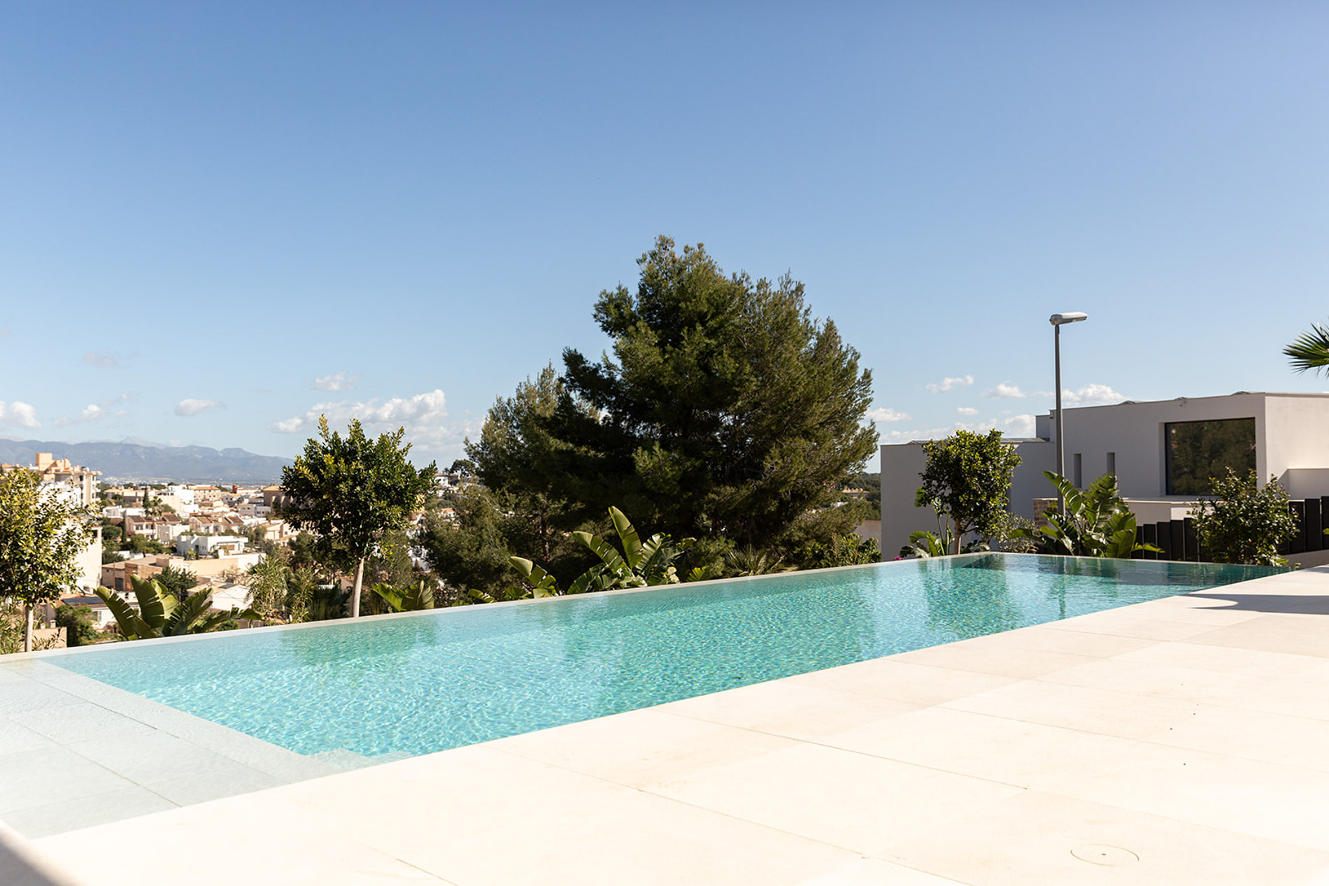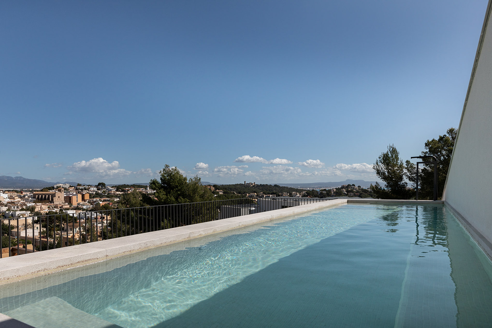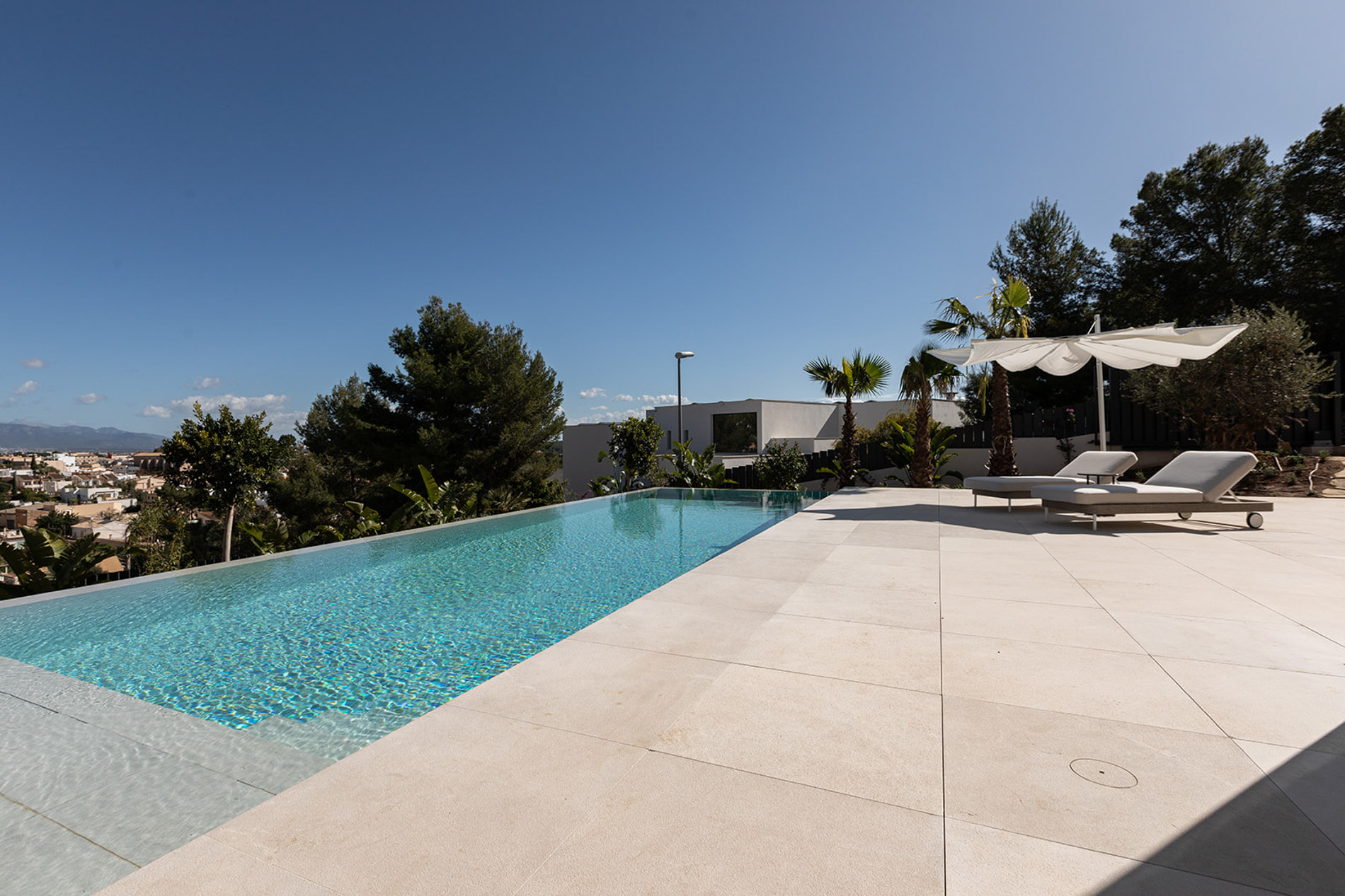 Villa contemporánea y sofisticada que difumina las líneas entre el interior y el exterior con vistas a las montañas en Genova Esta villa contemporánea cuenta con más de 418 metros cuadrados de espacio construido sofisticado que difumina las líneas entre el interior y el exterior. Los aspectos más destacados de esta propiedad excepcional incluyen dos piscinas, un atrio lleno de plantas, interiores excepcionalmente luminosos y espaciosos y estacionamiento subterráneo para tres coches. Orientada hacia las montañas en un terreno inclinado con una piscina infinita en el punto más bajo, la propiedad disfruta de vistas verdes de largo alcance, que se hacen eco del atrio interior. Tres de las cuatro habitaciones, cada una de las cuales tiene un baño en suite, conducen al atrio en la planta baja. Gran parte de este nivel es de planta abierta: una cocina, comedor y sala de estar y bien iluminados ocupan un solo espacio, con puertas de vidrio de piso a techo que se abren a generosas terrazas. Estas áreas al aire libre, algunas sombreadas por pérgolas de madera, otras abiertas al sol, aumentan enormemente el espacio vital, aprovechando al máximo el clima mediterráneo y el potencial para la vida al aire libre. Un baño de visitas y despensa / cuarto de servicio también se encuentran en la planta baja. Una escalera característica de madera conduce al primer piso, donde un suntuoso dormitorio principal y baño se abre directamente a una terraza aislada y una segunda piscina. Los propietarios pueden disfrutar de una privacidad absoluta y vistas de 360 grados desde aquí. MallorcaSite, su agencia inmobiliaria en Mallorca, recomienda esta propiedad por sus vistas, su ubicación y sus calidades.