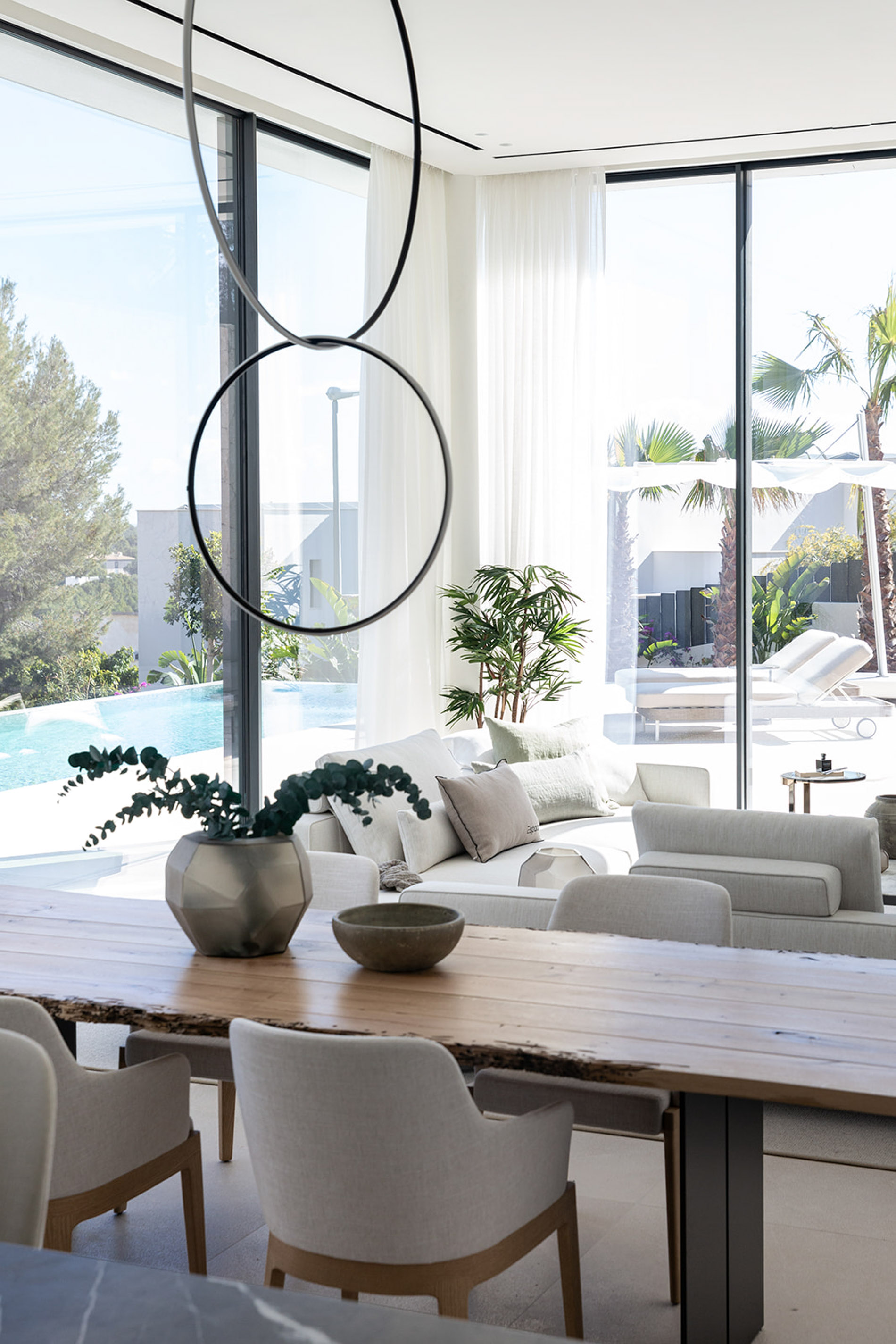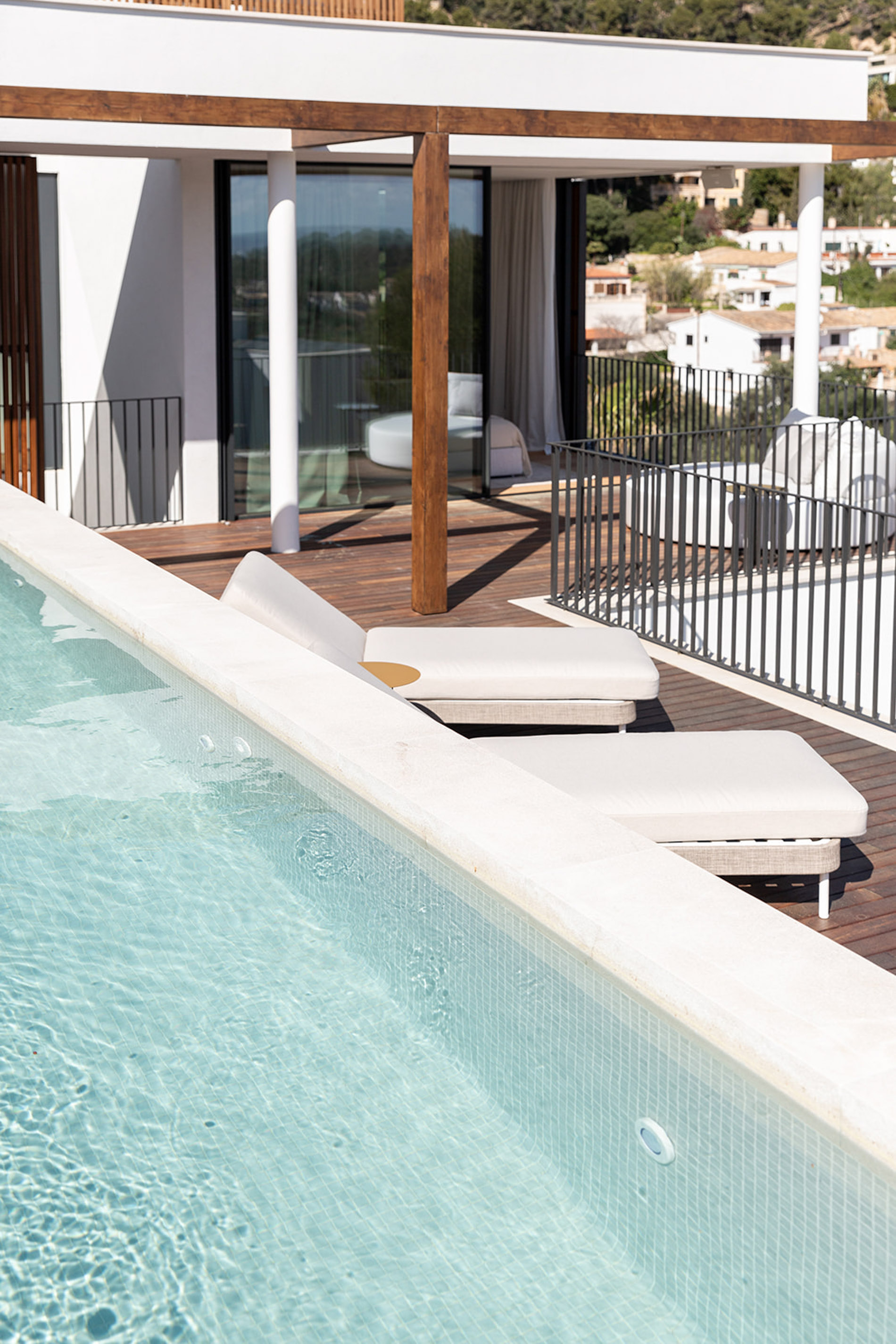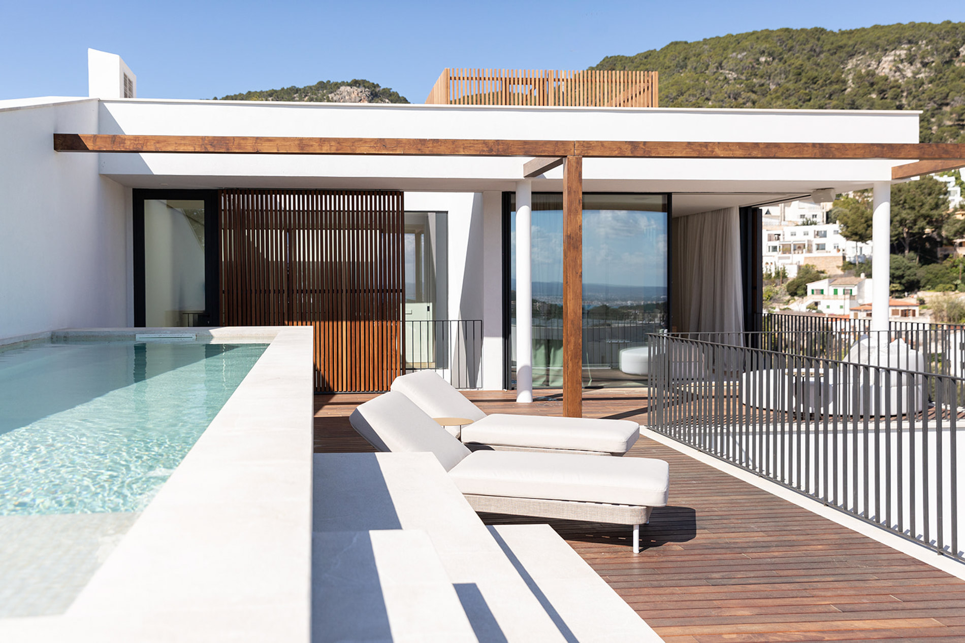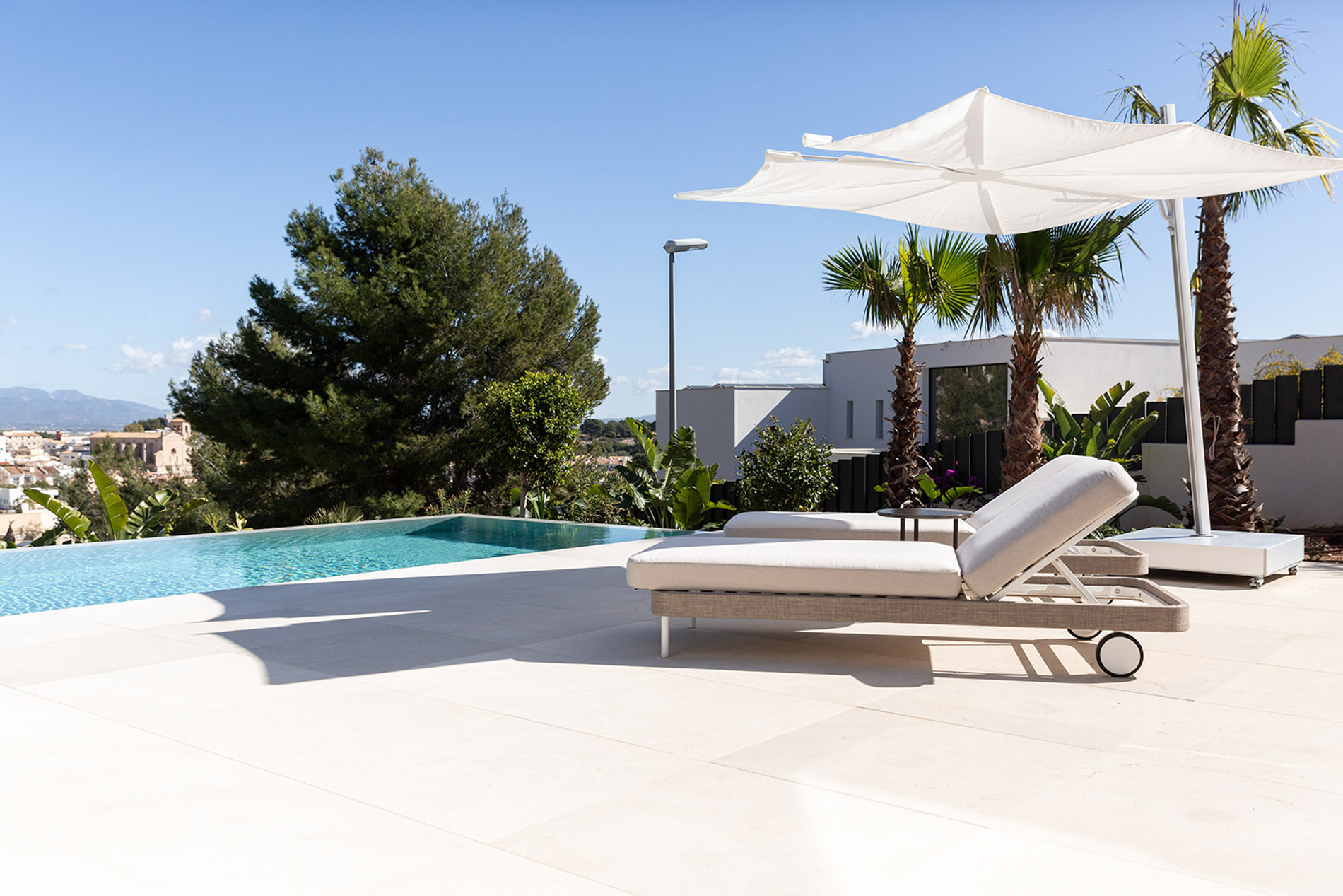 Villa contemporánea y sofisticada que difumina las líneas entre el interior y el exterior con vistas a las montañas en Genova Esta villa contemporánea cuenta con más de 418 metros cuadrados de espacio construido sofisticado que difumina las líneas entre el interior y el exterior. Los aspectos más destacados de esta propiedad excepcional incluyen dos piscinas, un atrio lleno de plantas, interiores excepcionalmente luminosos y espaciosos y estacionamiento subterráneo para tres coches. Orientada hacia las montañas en un terreno inclinado con una piscina infinita en el punto más bajo, la propiedad disfruta de vistas verdes de largo alcance, que se hacen eco del atrio interior. Tres de las cuatro habitaciones, cada una de las cuales tiene un baño en suite, conducen al atrio en la planta baja. Gran parte de este nivel es de planta abierta: una cocina, comedor y sala de estar y bien iluminados ocupan un solo espacio, con puertas de vidrio de piso a techo que se abren a generosas terrazas. Estas áreas al aire libre, algunas sombreadas por pérgolas de madera, otras abiertas al sol, aumentan enormemente el espacio vital, aprovechando al máximo el clima mediterráneo y el potencial para la vida al aire libre. Un baño de visitas y despensa / cuarto de servicio también se encuentran en la planta baja. Una escalera característica de madera conduce al primer piso, donde un suntuoso dormitorio principal y baño se abre directamente a una terraza aislada y una segunda piscina. Los propietarios pueden disfrutar de una privacidad absoluta y vistas de 360 grados desde aquí. MallorcaSite, su agencia inmobiliaria en Mallorca, recomienda esta propiedad por sus vistas, su ubicación y sus calidades.