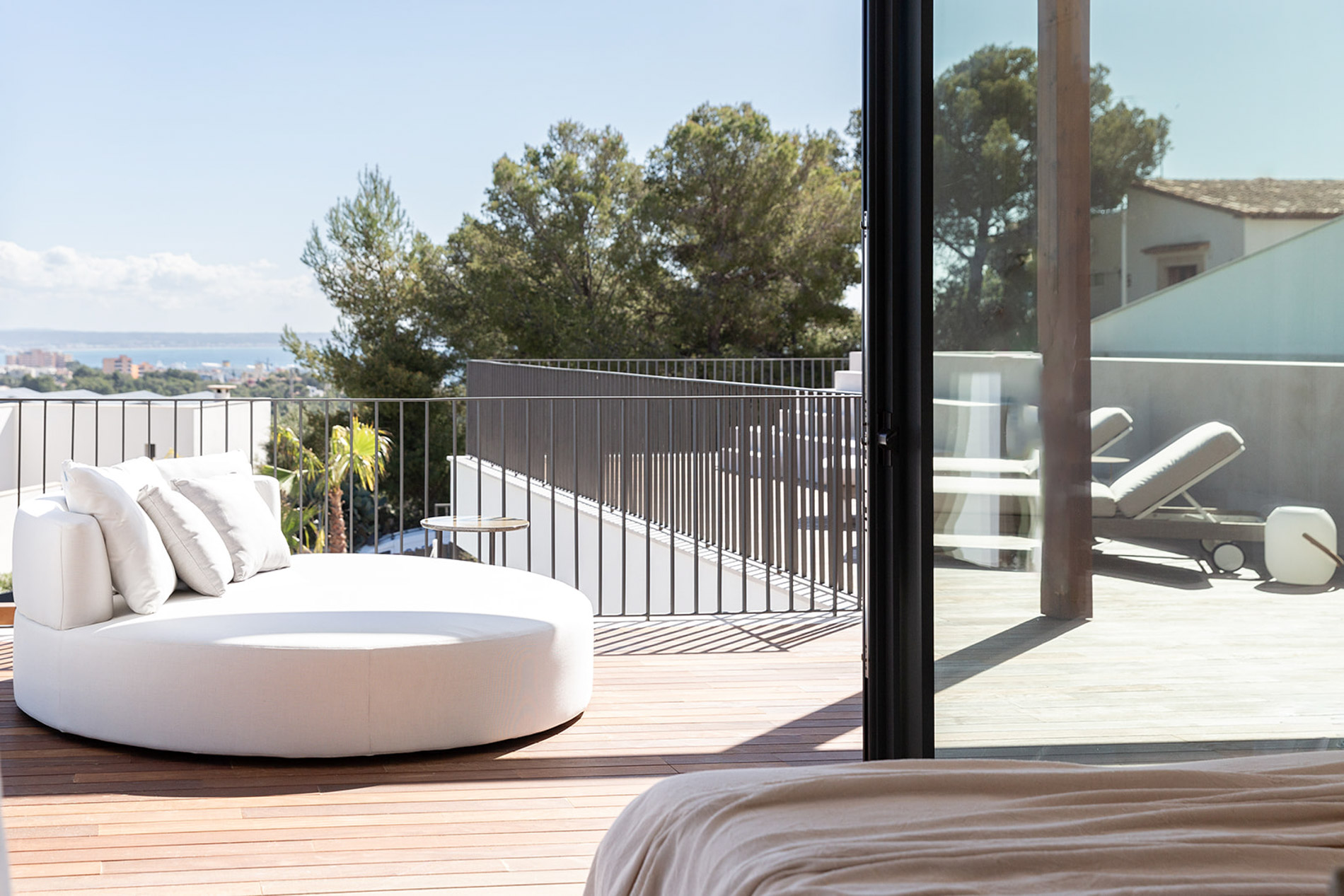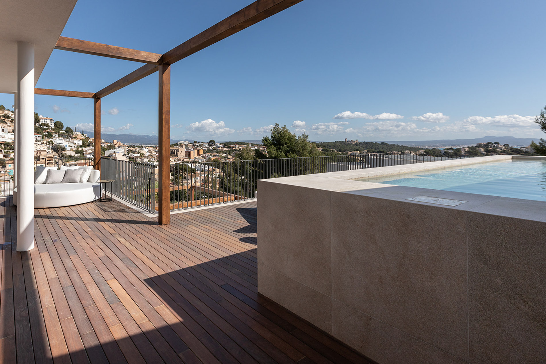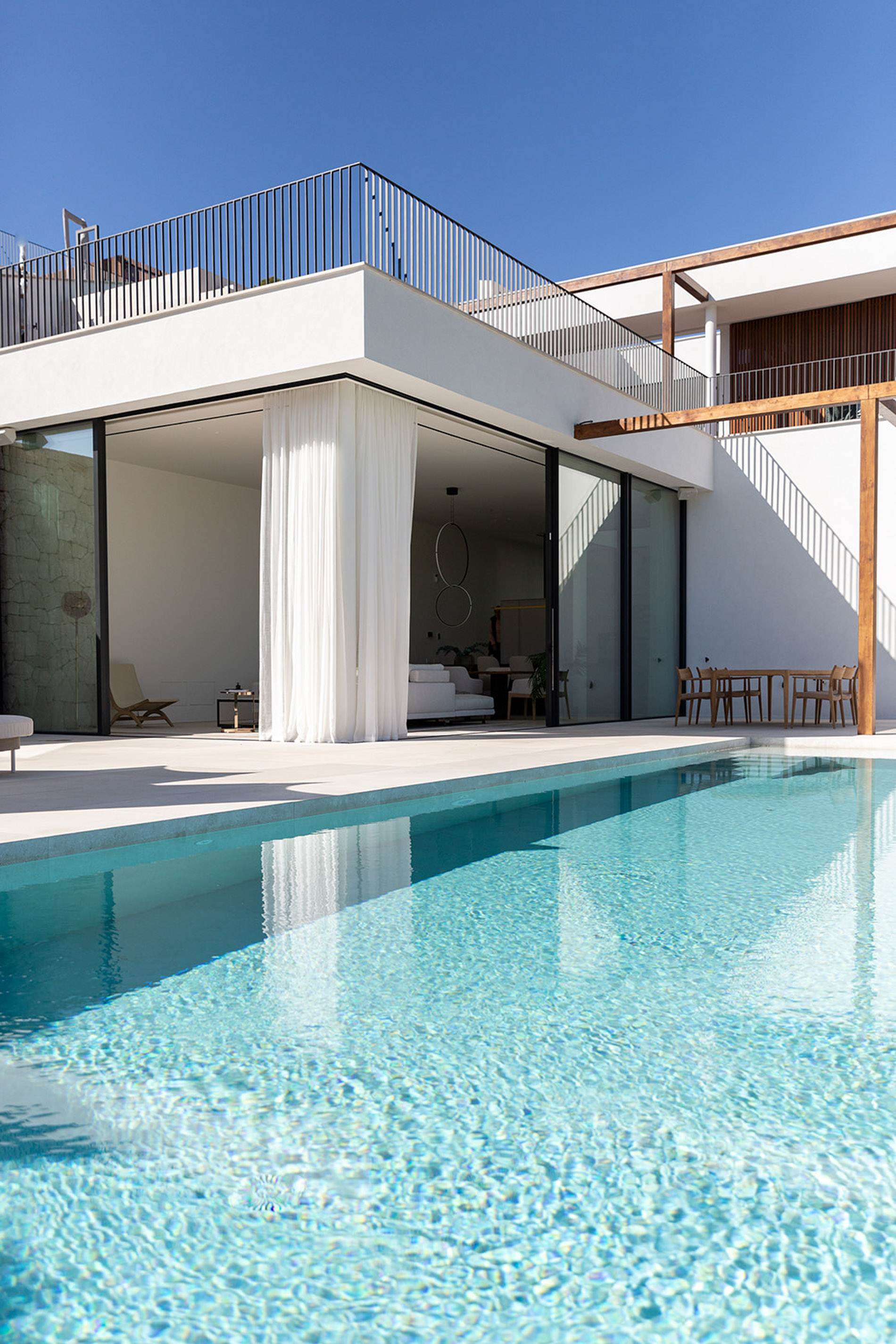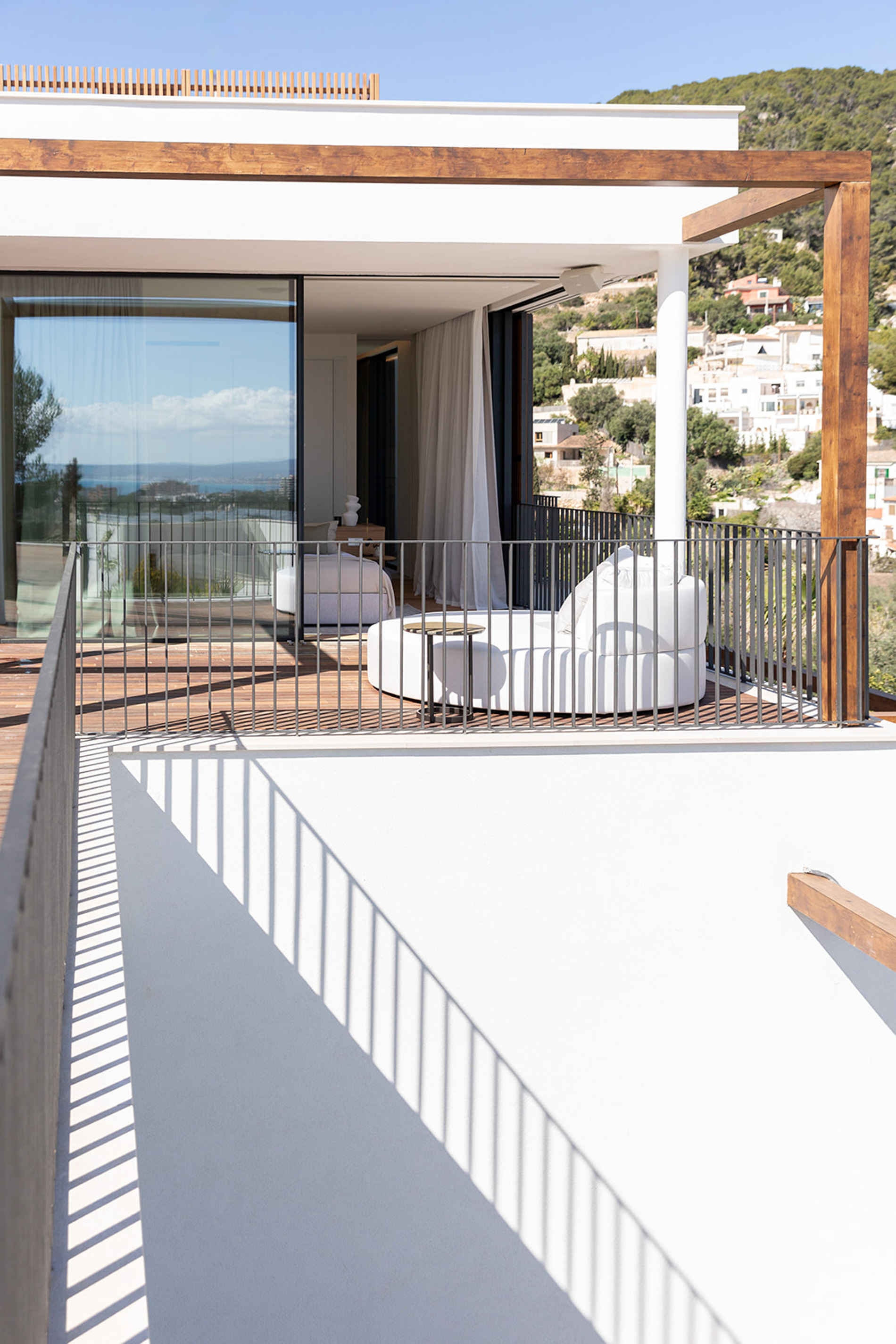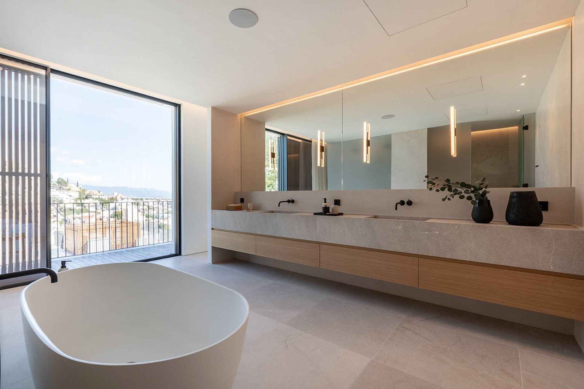 Villa contemporánea y sofisticada que difumina las líneas entre el interior y el exterior con vistas a las montañas en Genova Esta villa contemporánea cuenta con más de 418 metros cuadrados de espacio construido sofisticado que difumina las líneas entre el interior y el exterior. Los aspectos más destacados de esta propiedad excepcional incluyen dos piscinas, un atrio lleno de plantas, interiores excepcionalmente luminosos y espaciosos y estacionamiento subterráneo para tres coches. Orientada hacia las montañas en un terreno inclinado con una piscina infinita en el punto más bajo, la propiedad disfruta de vistas verdes de largo alcance, que se hacen eco del atrio interior. Tres de las cuatro habitaciones, cada una de las cuales tiene un baño en suite, conducen al atrio en la planta baja. Gran parte de este nivel es de planta abierta: una cocina, comedor y sala de estar y bien iluminados ocupan un solo espacio, con puertas de vidrio de piso a techo que se abren a generosas terrazas. Estas áreas al aire libre, algunas sombreadas por pérgolas de madera, otras abiertas al sol, aumentan enormemente el espacio vital, aprovechando al máximo el clima mediterráneo y el potencial para la vida al aire libre. Un baño de visitas y despensa / cuarto de servicio también se encuentran en la planta baja. Una escalera característica de madera conduce al primer piso, donde un suntuoso dormitorio principal y baño se abre directamente a una terraza aislada y una segunda piscina. Los propietarios pueden disfrutar de una privacidad absoluta y vistas de 360 grados desde aquí. MallorcaSite, su agencia inmobiliaria en Mallorca, recomienda esta propiedad por sus vistas, su ubicación y sus calidades.