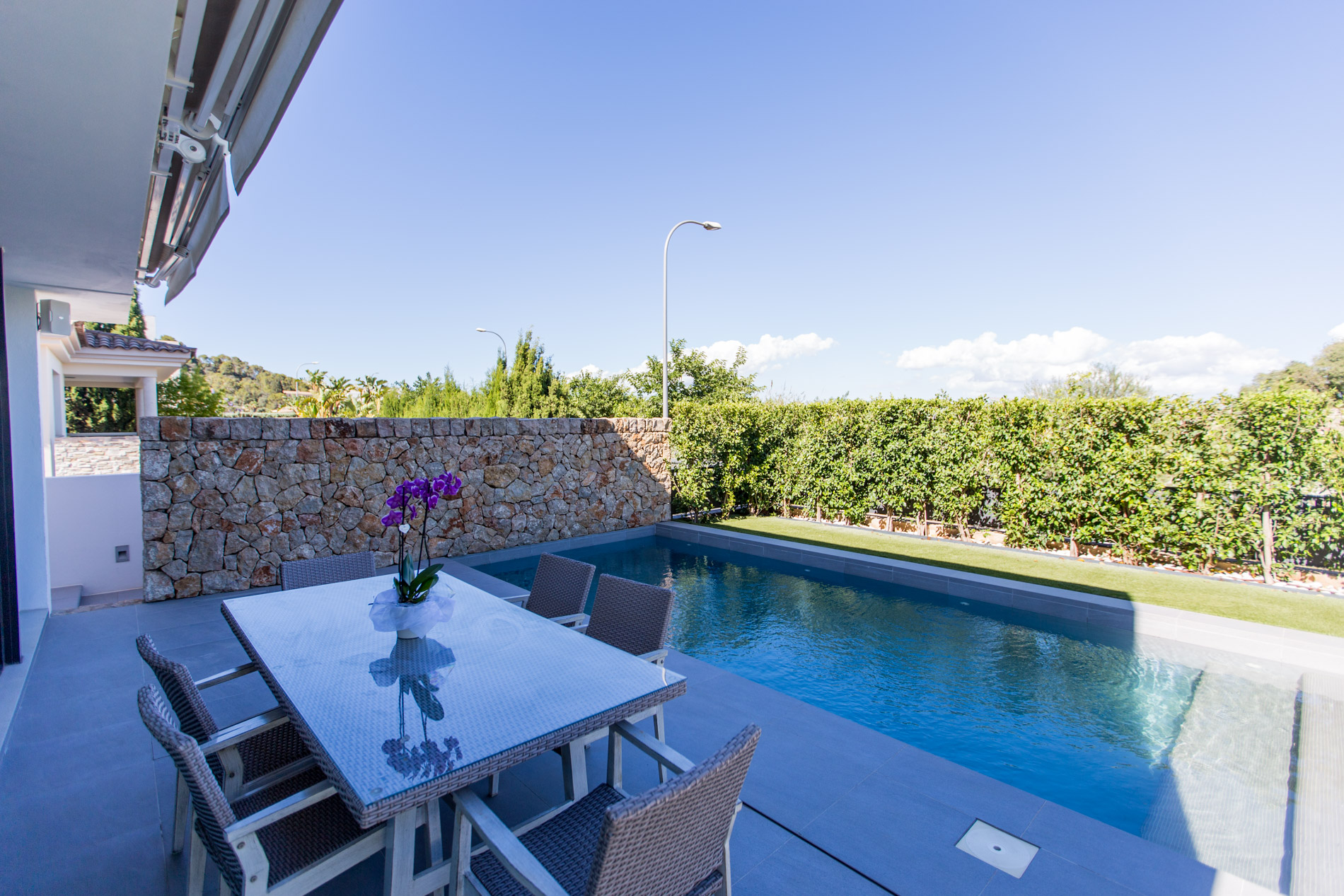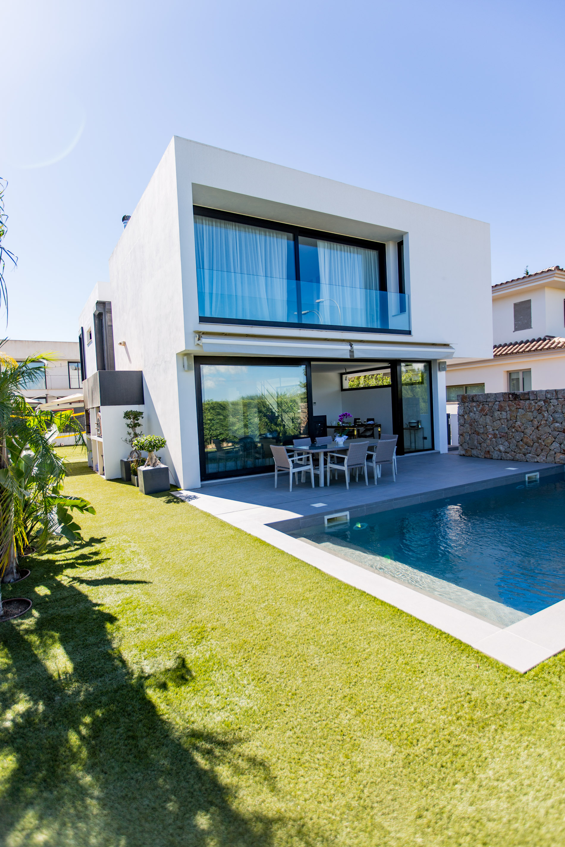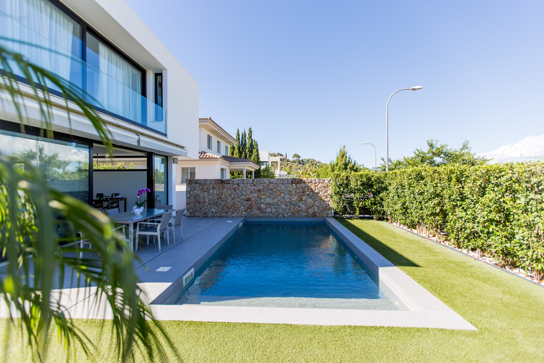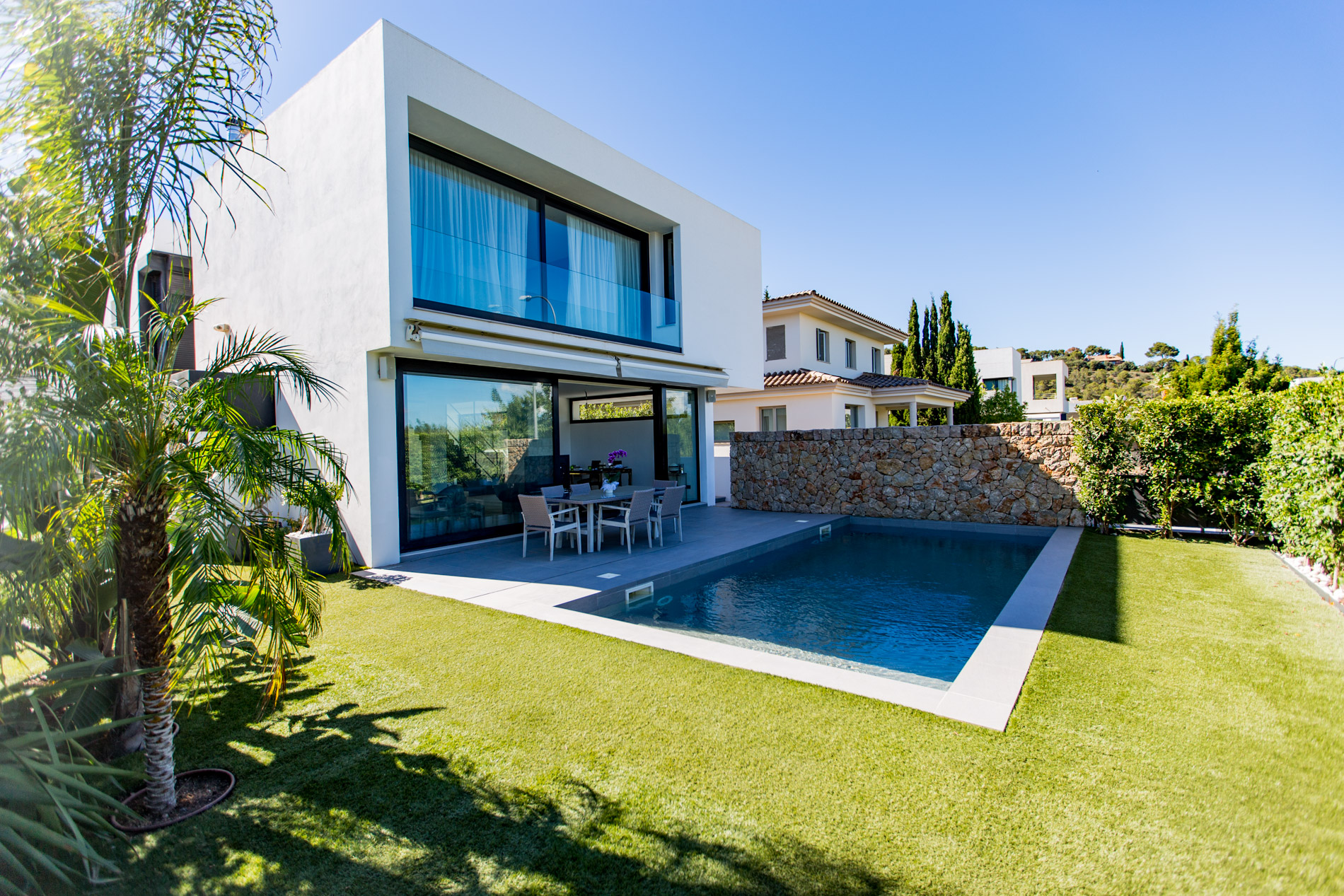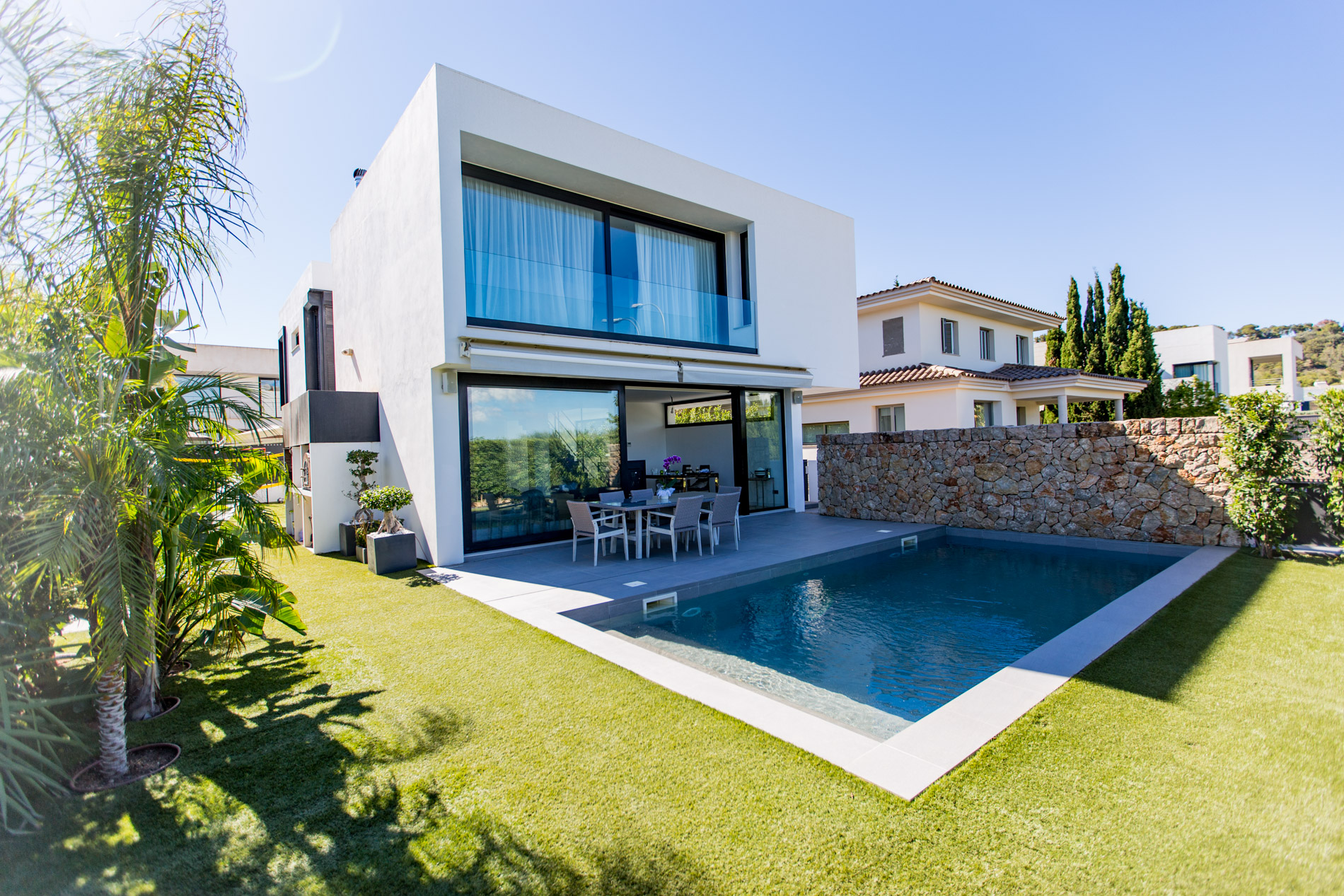 Villa moderna situada en una zona tranquila y exclusiva a las afueras de Palma, a tan solo unos minutos de los prestigiosos campos de golf de Son Vida. Esta propiedad ha sido construida con materiales de la más alta calidad y presenta un diseño contemporáneo que se caracteriza por sus grandes ventanales, los cuales permiten una abundante entrada de luz natural, creando un ambiente luminoso y acogedor en toda la vivienda.
