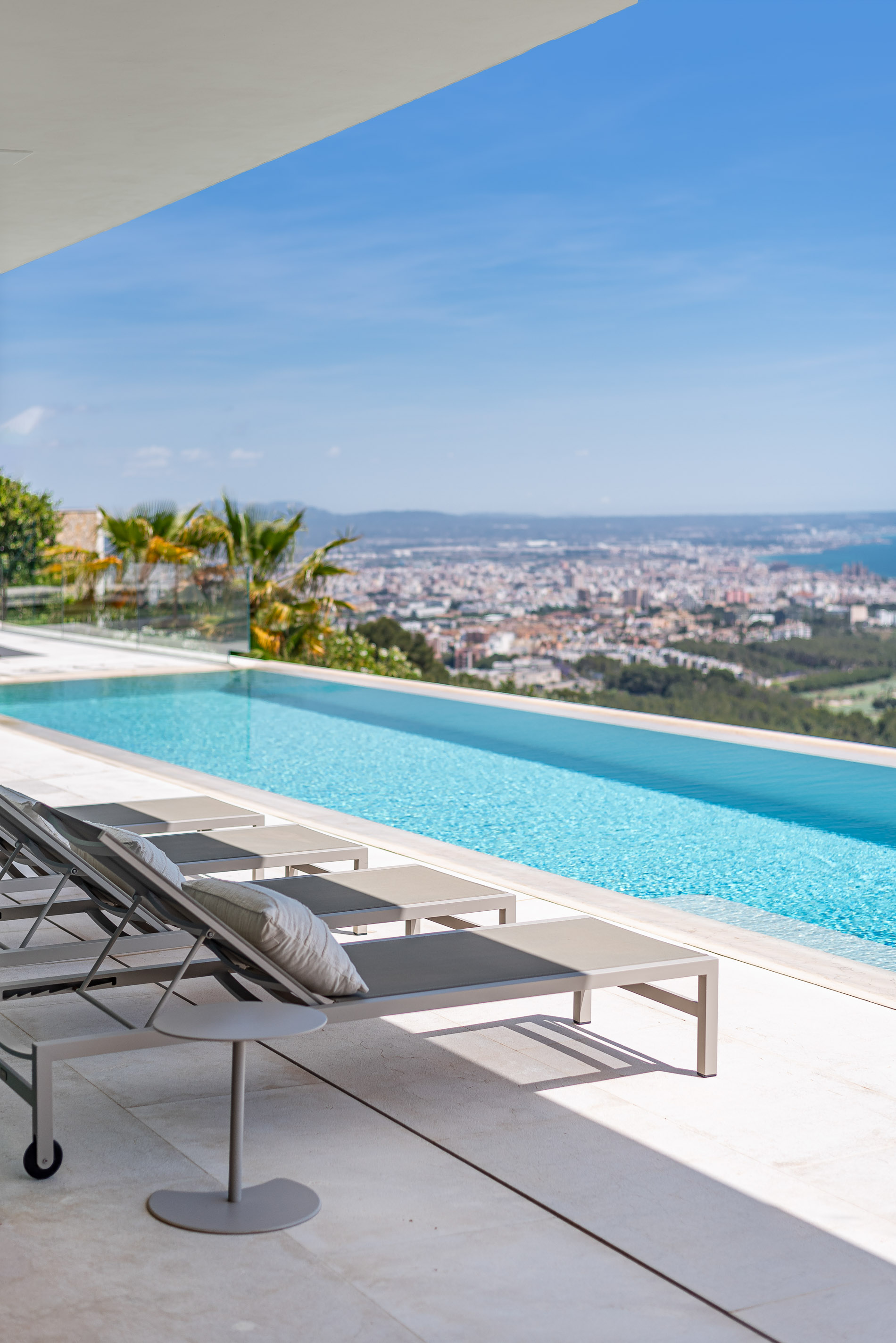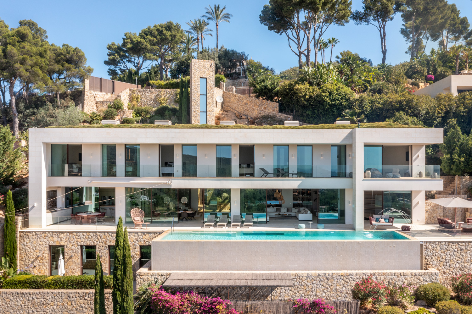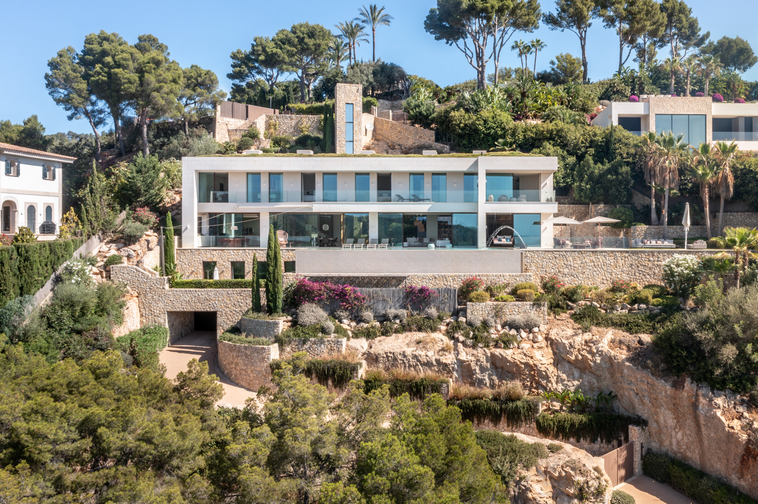 Esta villa nueva de lujo es una combinación perfecta entre tamaño, ubicación y planificación, combinado con el encanto del Mediterráneo y la orientación al sur, hacen de esta villa un verdadero punto culminante. Desde el parking de invitados se accede la casa por un ascensor de cristal, el cual llega a un patio con un gran olivo y una cascada relajante que cae a través de la roca natural. En esta planta baja nos encontramos con un gran salón con chimenea y una bonita bodega de cristal, un despacho/biblioteca, aseo de invitados y una gran cocina con isla y zona de "dirty kitchen", además ofrece una terraza parcialmente cubierta con una cocina de verano con barbacoa y una piscina volada de 17 metros de largo con impresionantes vistas sobre la Bahía de Palma. En la segunda planta nos encontramos con 4 dormitorios, cada uno con su baño en suite, vestidor y acceso a la terraza exterior. La suite principal destaca por su baño, la amplia zona de vestidor y una terraza completamente privada con ducha tropical al aire libre. Además cuenta con un segundo dormitorio con baño que puede ser usado tanto como parte del dormitorio principal como un dormitorio independiente. En la planta baja se encuentra la amplia zona del Spa con una piscina interior y una sauna de cristal. Desde esta sala hay una claraboya grande de 4 m2, situada en la parte inferior de la piscina exterior, dándole un tono de luz espectacular al interior del spa. En esa misma planta hay un dormitorio enorme con su baño en suite que podría convertirse también en un apartamento. En el sótano hay un garaje hay aparcamiento cómodo para cuatro vehículos. Un segundo ascensor conecta todos los niveles a la perfección. La ubicación, el estilo único, la excelente calidad de construcción y los elementos de relieve individuales garantizan la adquisición de una verdadera pieza única en la isla de Mallorca. MallorcaSite, su agencia inmobiliaria en Mallorca, le recomienda esta propiedad por su diseño, por la calidad de su construcción, por las vistas, por su amplitud, por su comodidad.
