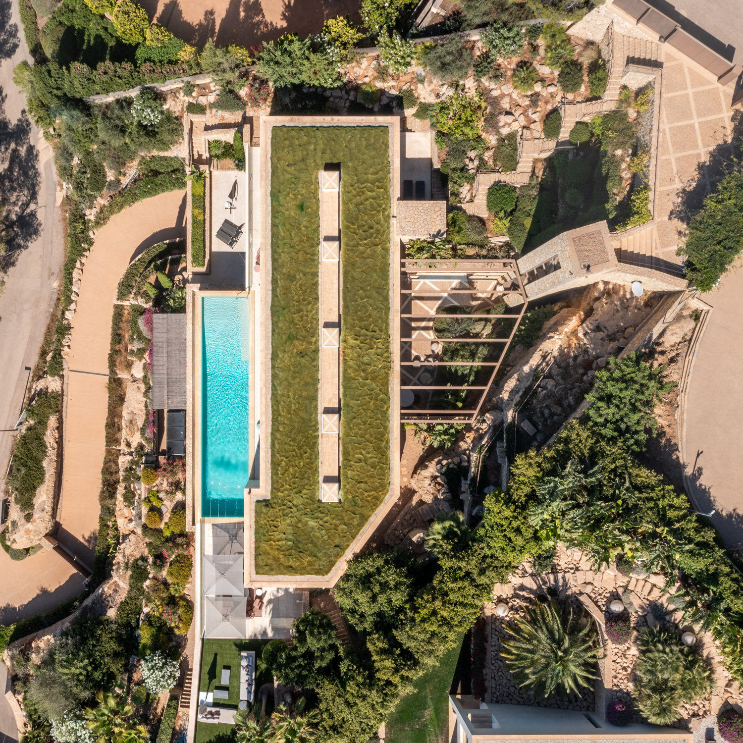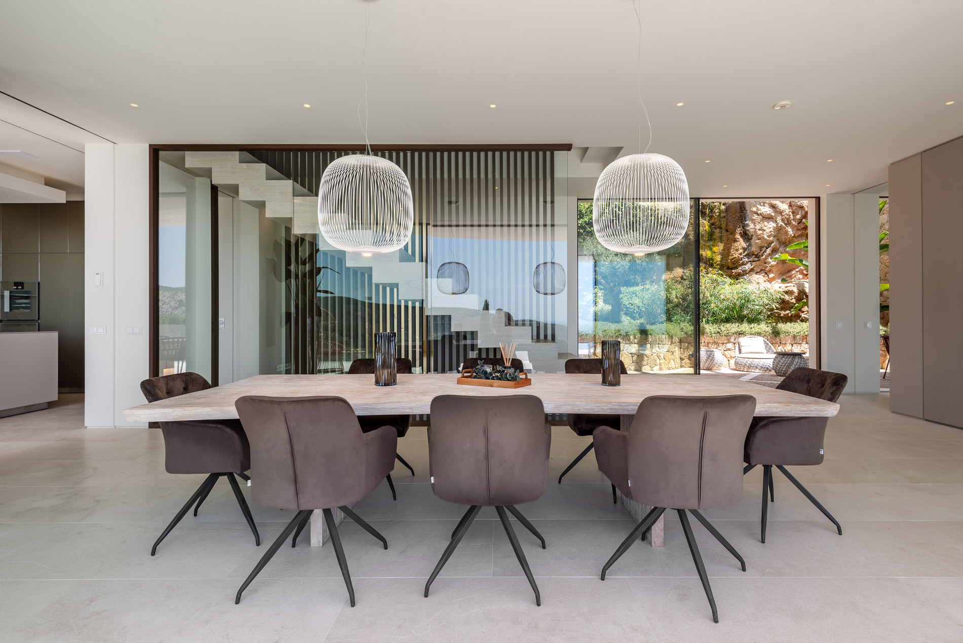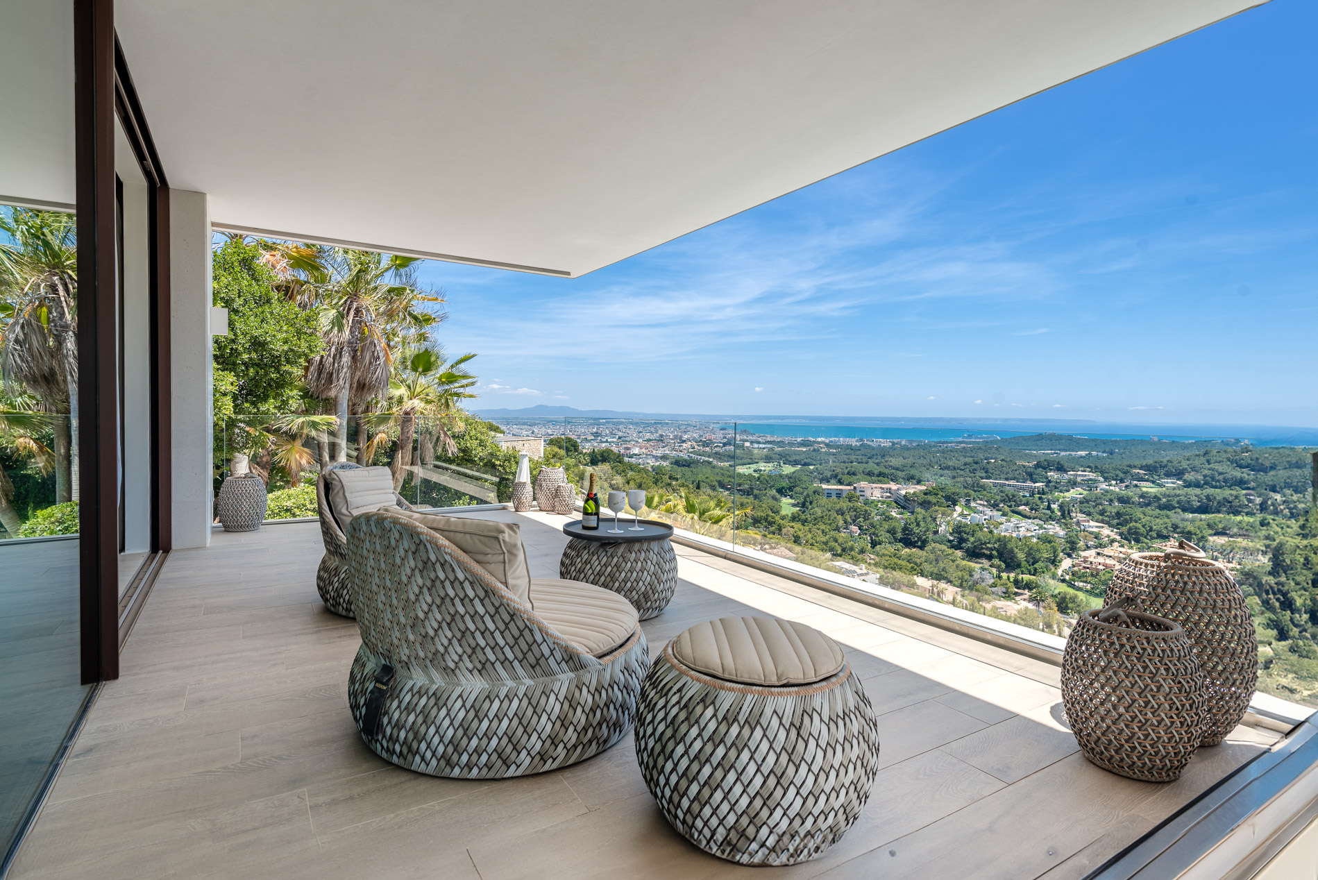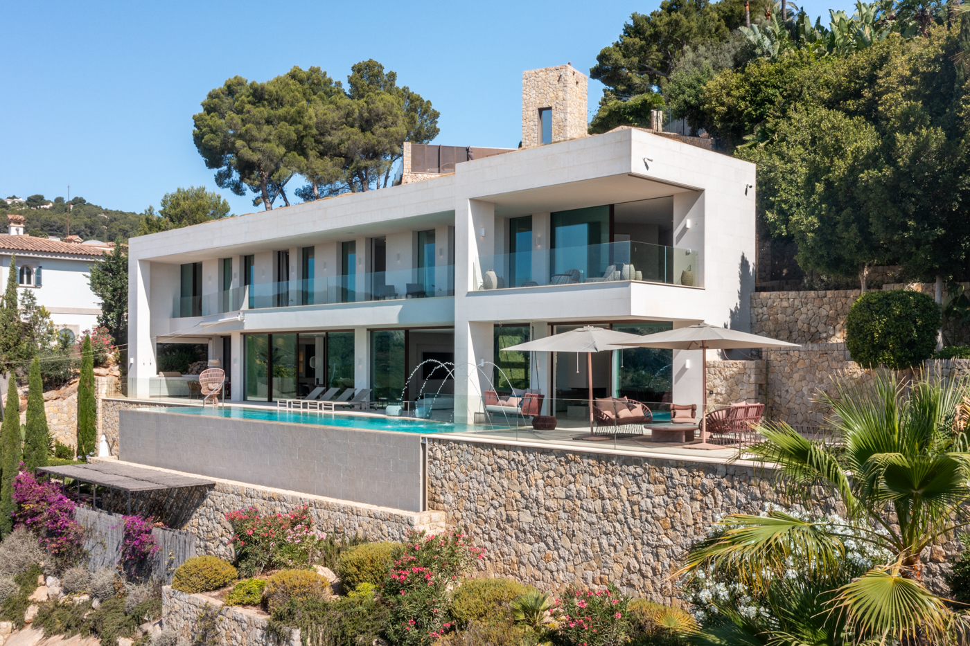 Esta villa nueva de lujo es una combinación perfecta entre tamaño, ubicación y planificación, combinado con el encanto del Mediterráneo y la orientación al sur, hacen de esta villa un verdadero punto culminante. Desde el parking de invitados se accede la casa por un ascensor de cristal, el cual llega a un patio con un gran olivo y una cascada relajante que cae a través de la roca natural. En esta planta baja nos encontramos con un gran salón con chimenea y una bonita bodega de cristal, un despacho/biblioteca, aseo de invitados y una gran cocina con isla y zona de "dirty kitchen", además ofrece una terraza parcialmente cubierta con una cocina de verano con barbacoa y una piscina volada de 17 metros de largo con impresionantes vistas sobre la Bahía de Palma. En la segunda planta nos encontramos con 4 dormitorios, cada uno con su baño en suite, vestidor y acceso a la terraza exterior. La suite principal destaca por su baño, la amplia zona de vestidor y una terraza completamente privada con ducha tropical al aire libre. Además cuenta con un segundo dormitorio con baño que puede ser usado tanto como parte del dormitorio principal como un dormitorio independiente. En la planta baja se encuentra la amplia zona del Spa con una piscina interior y una sauna de cristal. Desde esta sala hay una claraboya grande de 4 m2, situada en la parte inferior de la piscina exterior, dándole un tono de luz espectacular al interior del spa. En esa misma planta hay un dormitorio enorme con su baño en suite que podría convertirse también en un apartamento. En el sótano hay un garaje hay aparcamiento cómodo para cuatro vehículos. Un segundo ascensor conecta todos los niveles a la perfección. La ubicación, el estilo único, la excelente calidad de construcción y los elementos de relieve individuales garantizan la adquisición de una verdadera pieza única en la isla de Mallorca. MallorcaSite, su agencia inmobiliaria en Mallorca, le recomienda esta propiedad por su diseño, por la calidad de su construcción, por las vistas, por su amplitud, por su comodidad.