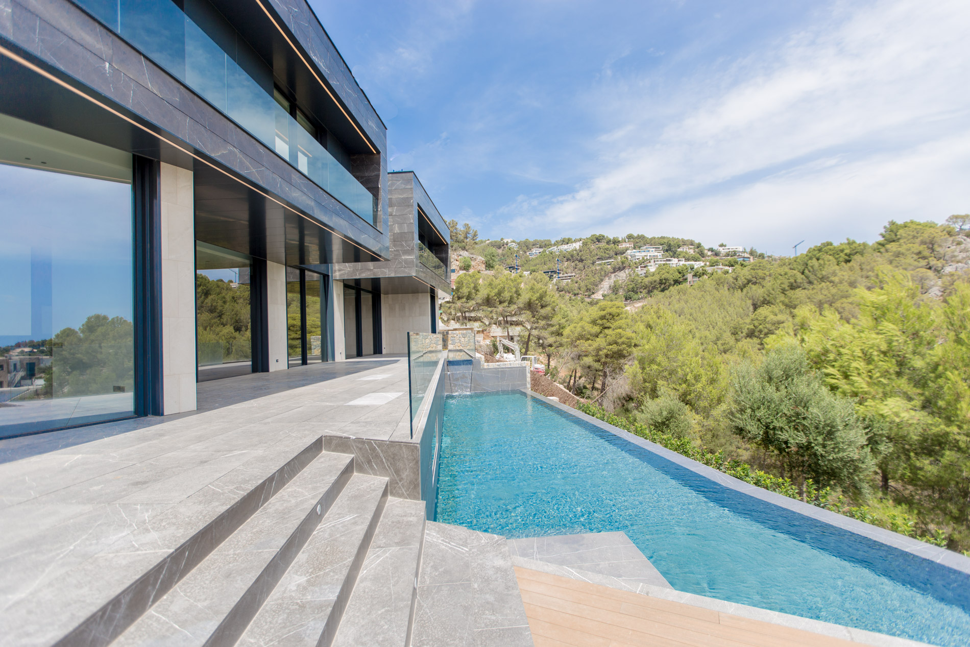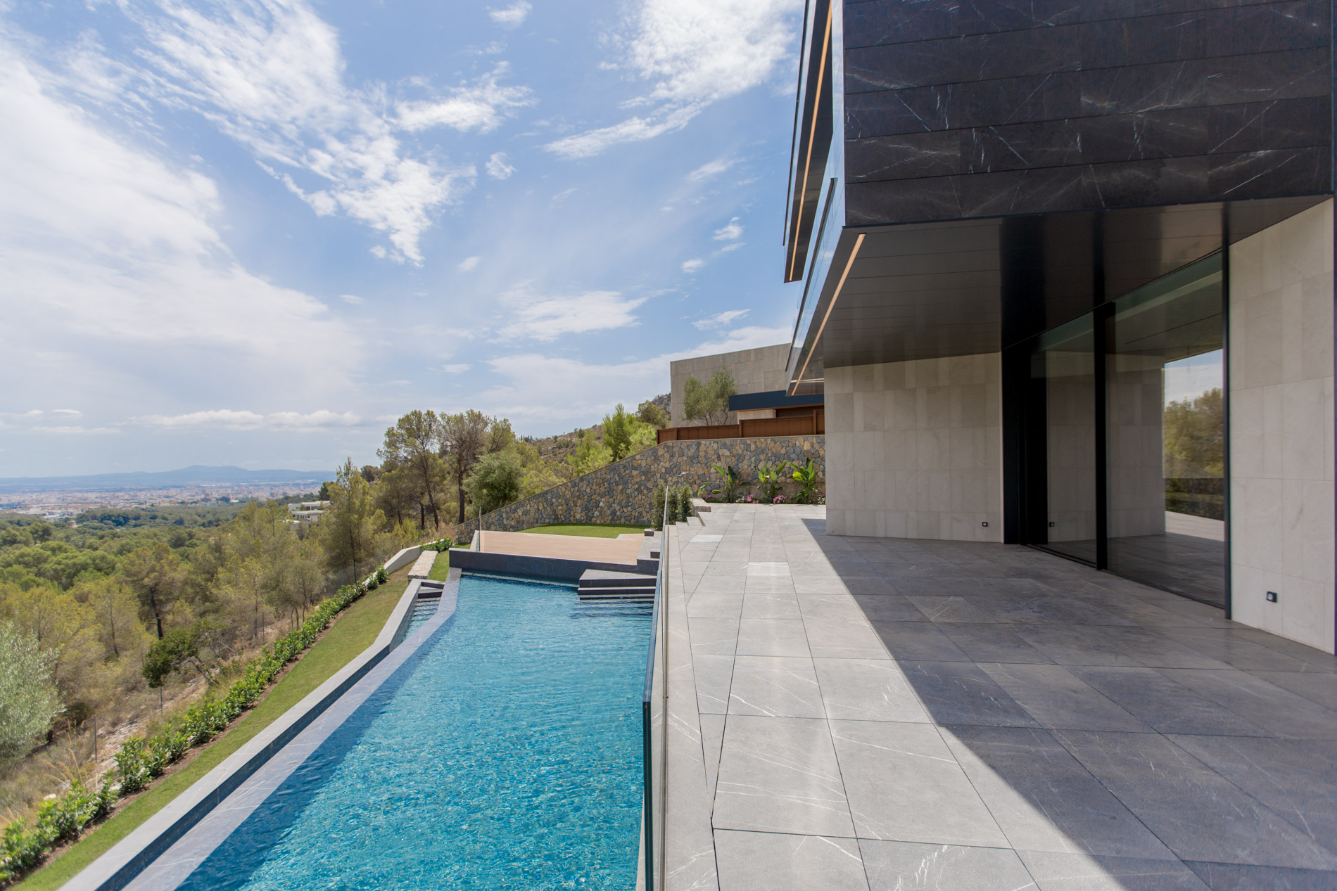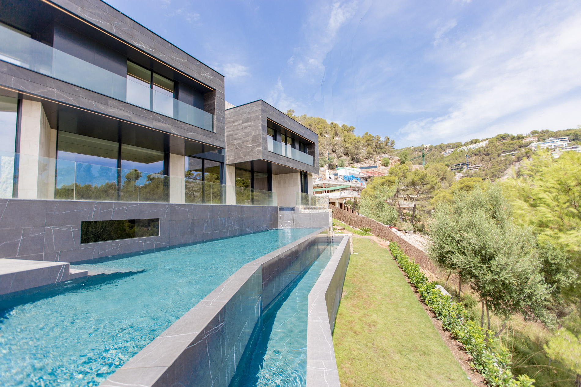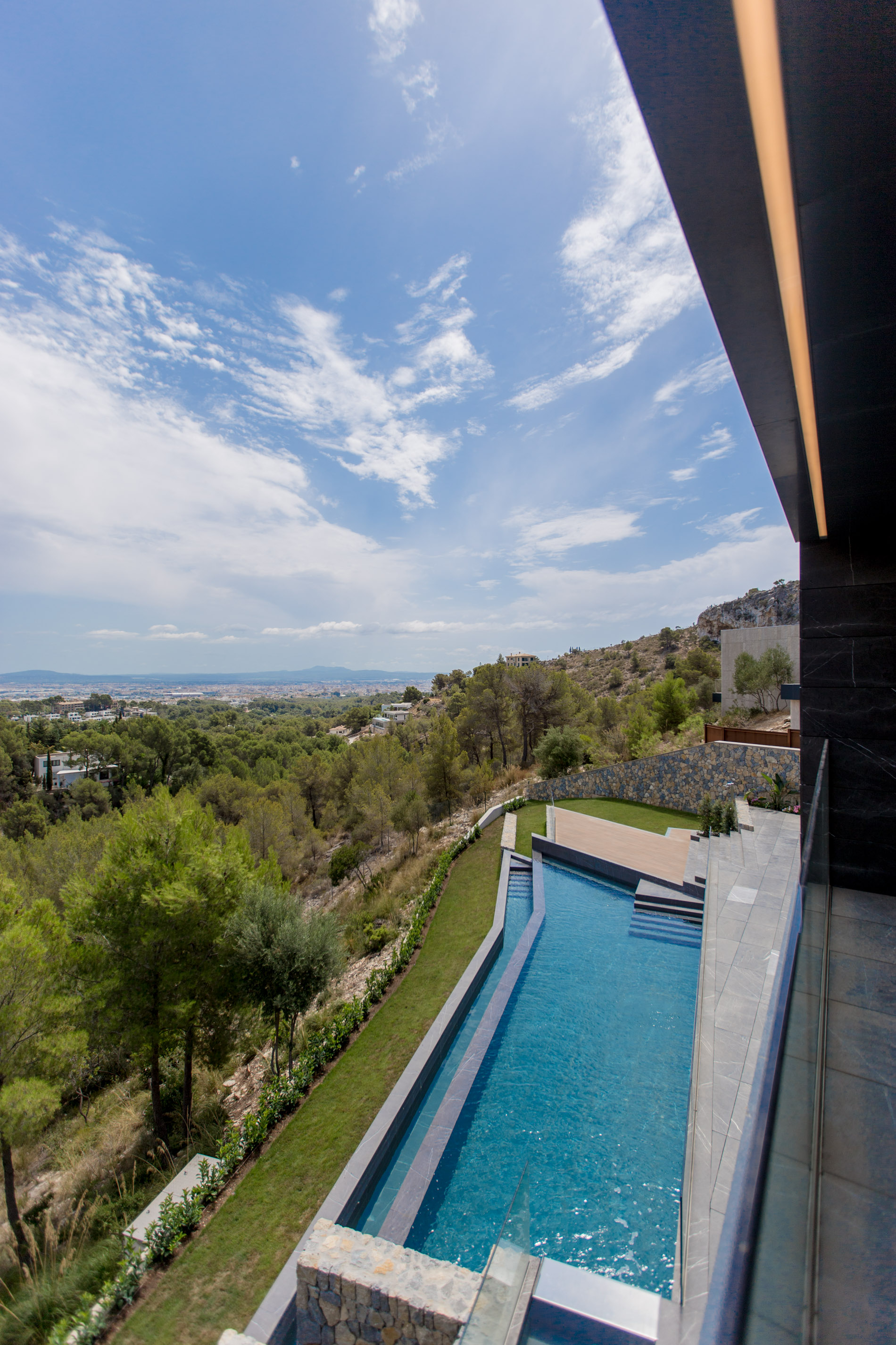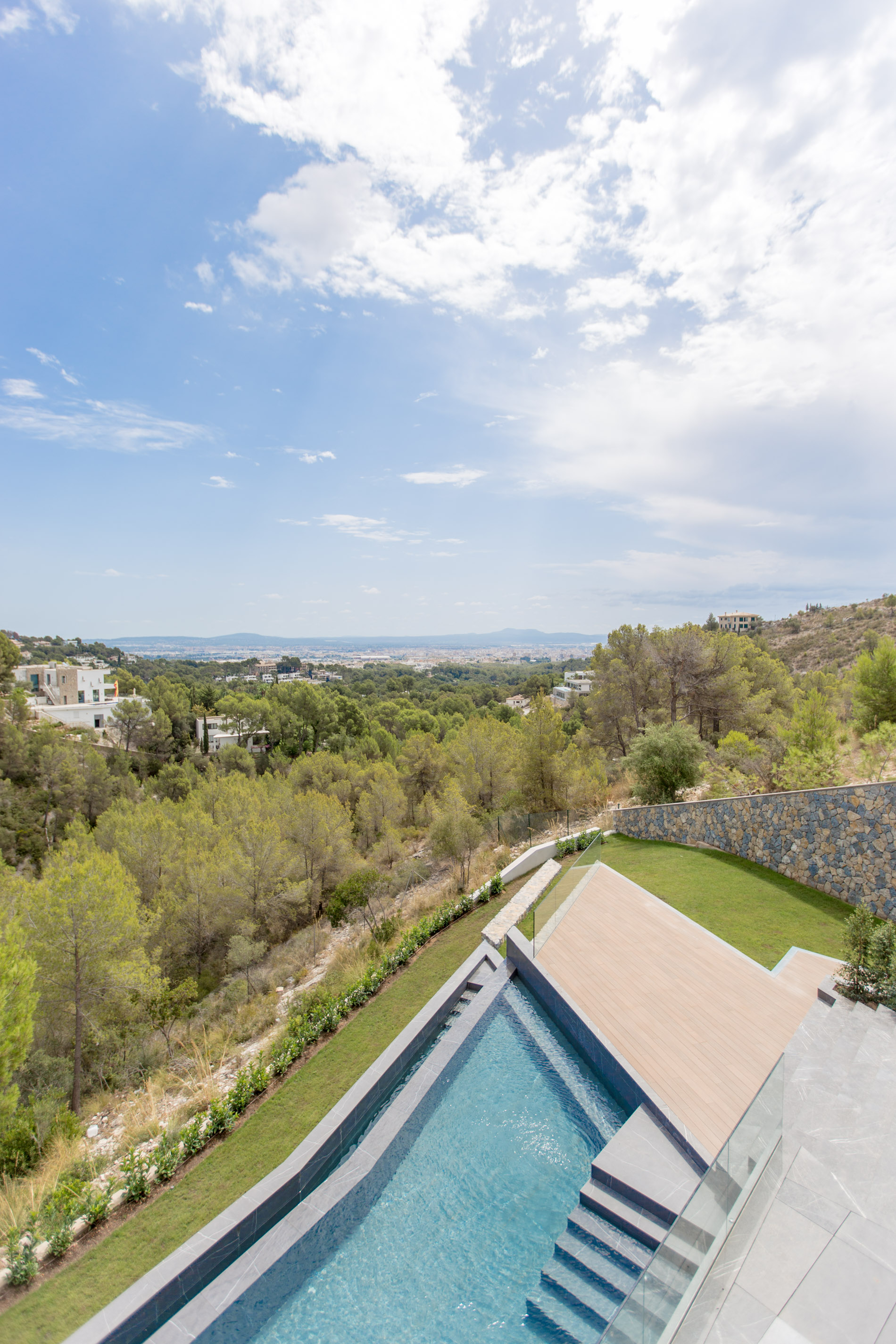 Diseño con alma - villa de nueva construcción en las colinas de Son Vida, Palma, en una de las mejores ubicaciones, orientada al este y con impresionantes vistas a la ciudad de Palma. La villa se asienta sobre una parcela de 2000 m2 y tiene una superficie construida de 600 m2 distribuidos en dos plantas con 5 dormitorios y 6 baños, cinco de los cuales son en suite. Es una vivienda moderna con techos altos y grandes ventanales para disfrutar al máximo de las vistas, y con una gran piscina desbordante con la mejor orientación. También dispone de una zona independiente para invitados o personal de la casa. MallorcaSite, su agencia inmobiliaria en Mallorca, recomienda esta propiedad por su excelente ubicación, sus calidades y su amplitud.