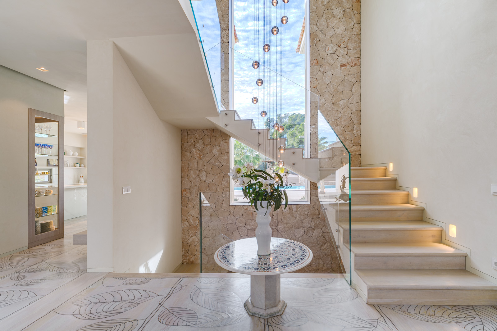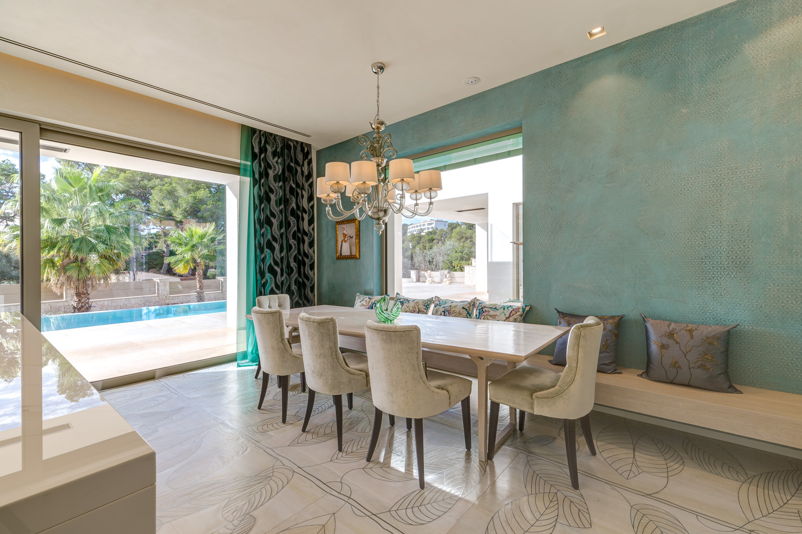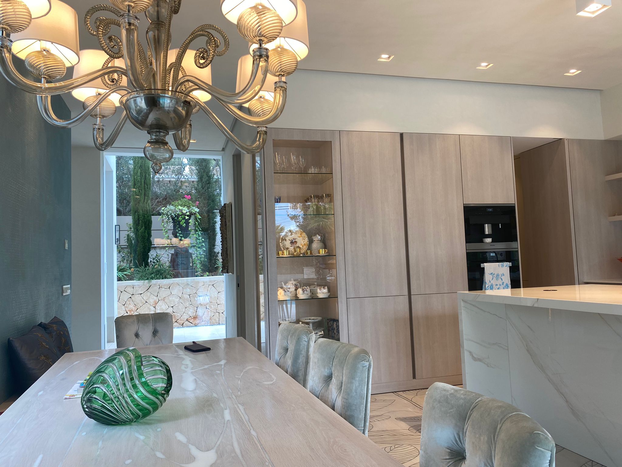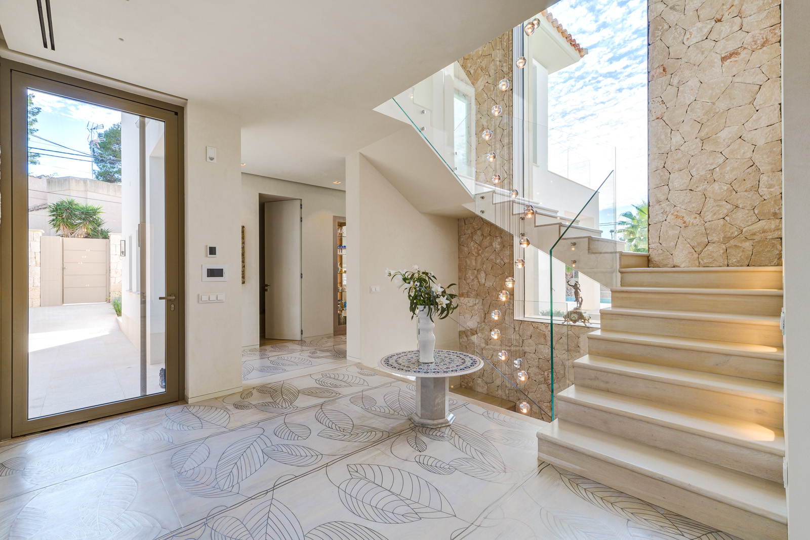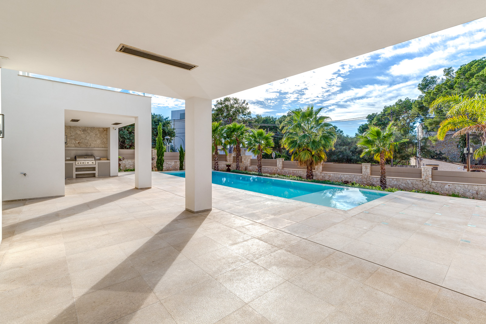 Villa orientada al Sur, construida en 2020 a poca distancia de la playa de Portals Nous de arquitectura mediterránea construida con materiales de gran calidad como piedra natural en el exterior, suelos de parquet Vassaletti, cocina Birgit Müller Esta villa de aproximadamente 520m2 de superficie cuenta con tres plantas. En el sótano con acceso directo a la casa se encuentra el garaje subterráneo con espacio para 4 coches. En la planta principal hay la cocina, comedor, sala de estar independiente, un aseo de invitados y grandes ventanales que conducen al porche y ofrecen bellas vistas al jardín y a la piscina de 12x4 , en esta planta se encuentra un dormitorio de invitados independiente con baño en suite. En la primera planta se encuentran el dormitorio principal y dos dormitorios de invitados, que comparten un baño. Características de esta villa mediterránea son: Suelos de piedra natural, parquet , calefacción por suelo radiante, aire acondicionado frío/calor, chimenea de gas, sistema domótico, sistema de alarma, lavadero, despensa. MallorcaSite, su agencia inmobiliaria en Mallorca, le recomienda esta villa por su calidad, por su jardín y por estar en una de las zonas más demandadas de Mallorca