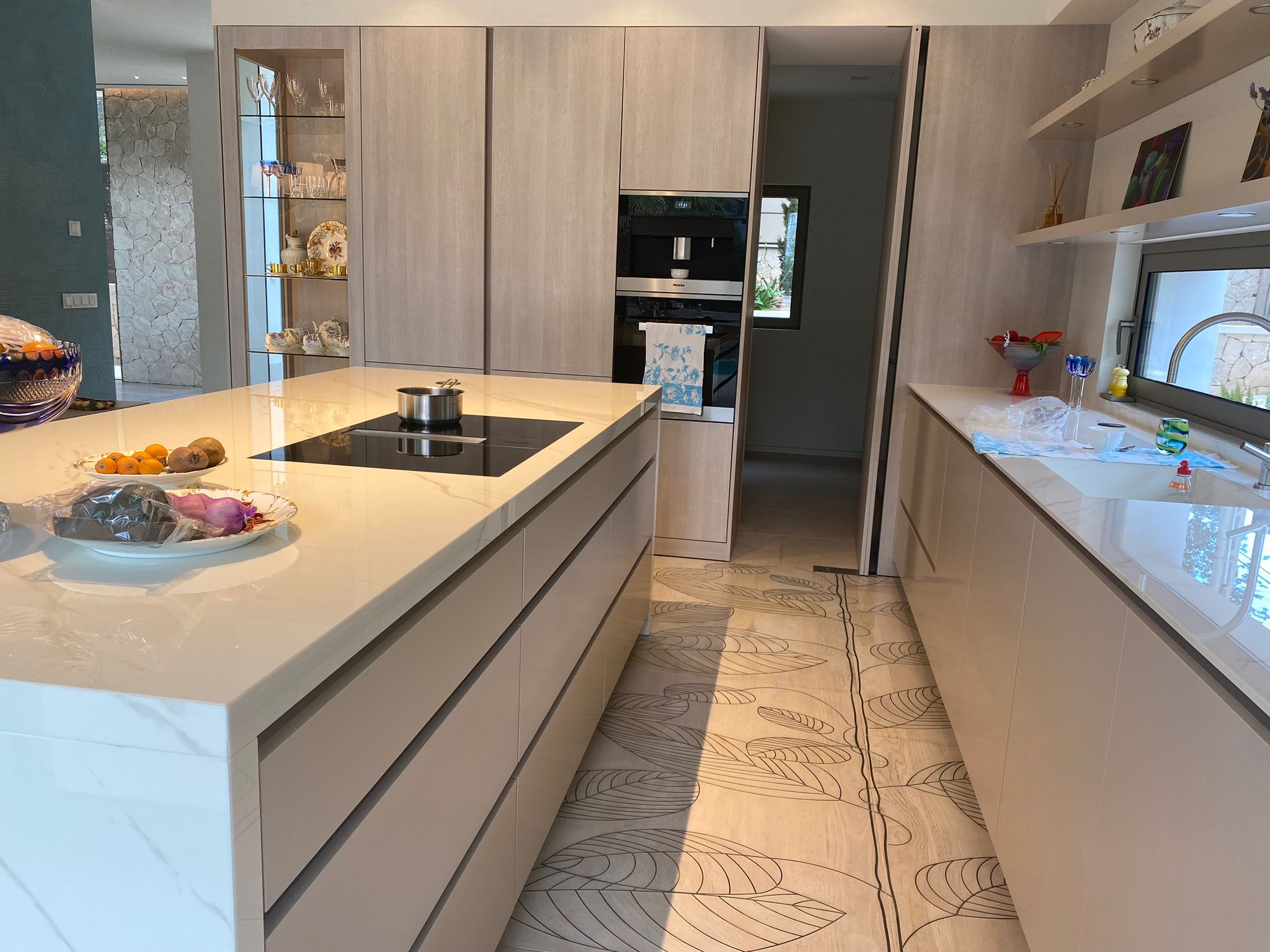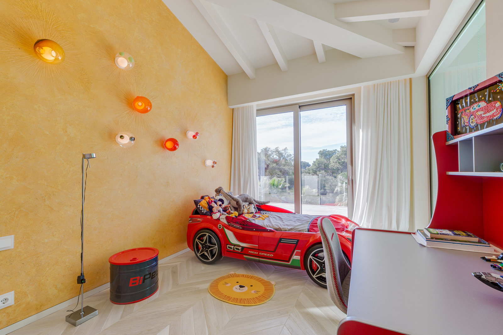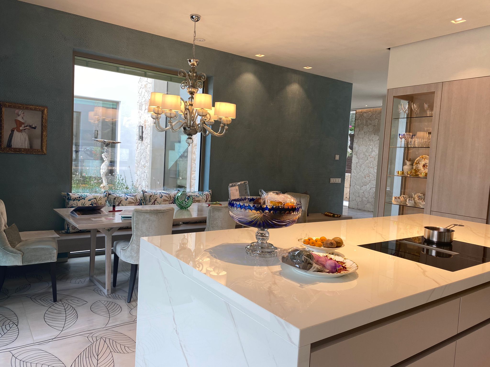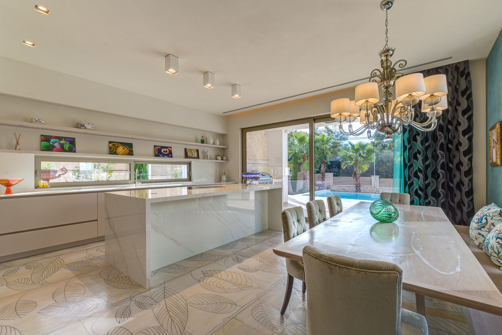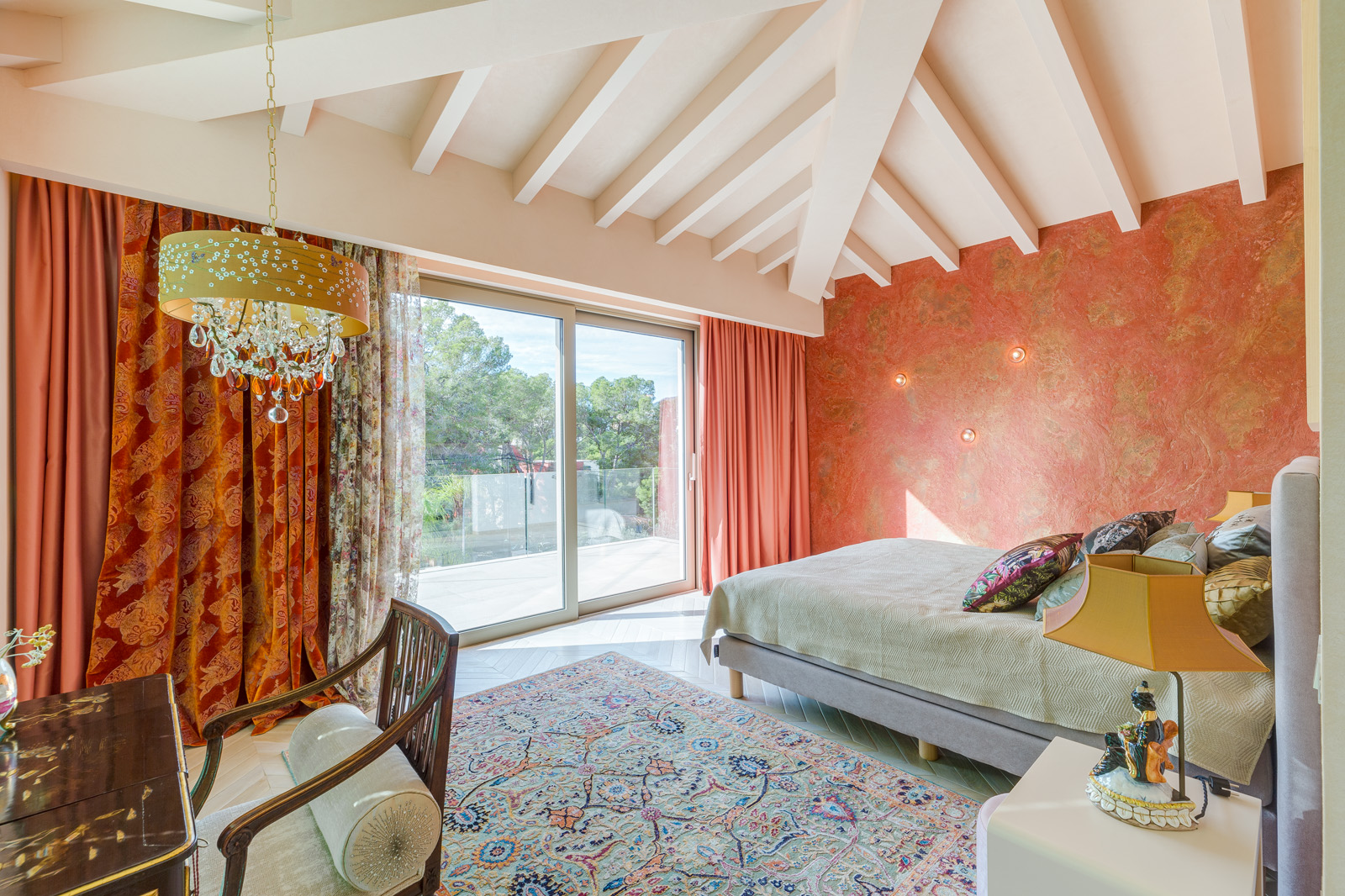 Villa orientada al Sur, construida en 2020 a poca distancia de la playa de Portals Nous de arquitectura mediterránea construida con materiales de gran calidad como piedra natural en el exterior, suelos de parquet Vassaletti, cocina Birgit Müller Esta villa de aproximadamente 520m2 de superficie cuenta con tres plantas. En el sótano con acceso directo a la casa se encuentra el garaje subterráneo con espacio para 4 coches. En la planta principal hay la cocina, comedor, sala de estar independiente, un aseo de invitados y grandes ventanales que conducen al porche y ofrecen bellas vistas al jardín y a la piscina de 12x4 , en esta planta se encuentra un dormitorio de invitados independiente con baño en suite. En la primera planta se encuentran el dormitorio principal y dos dormitorios de invitados, que comparten un baño. Características de esta villa mediterránea son: Suelos de piedra natural, parquet , calefacción por suelo radiante, aire acondicionado frío/calor, chimenea de gas, sistema domótico, sistema de alarma, lavadero, despensa. MallorcaSite, su agencia inmobiliaria en Mallorca, le recomienda esta villa por su calidad, por su jardín y por estar en una de las zonas más demandadas de Mallorca