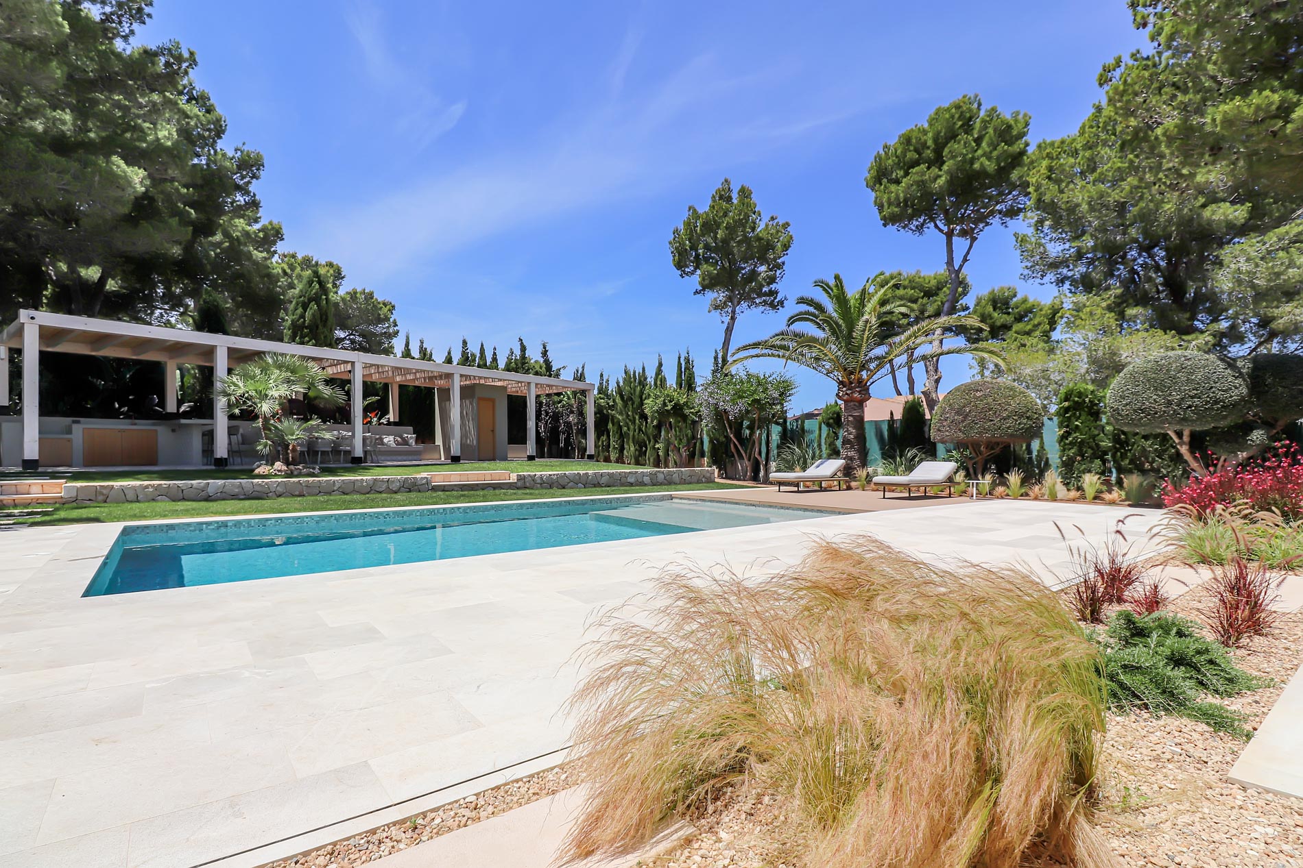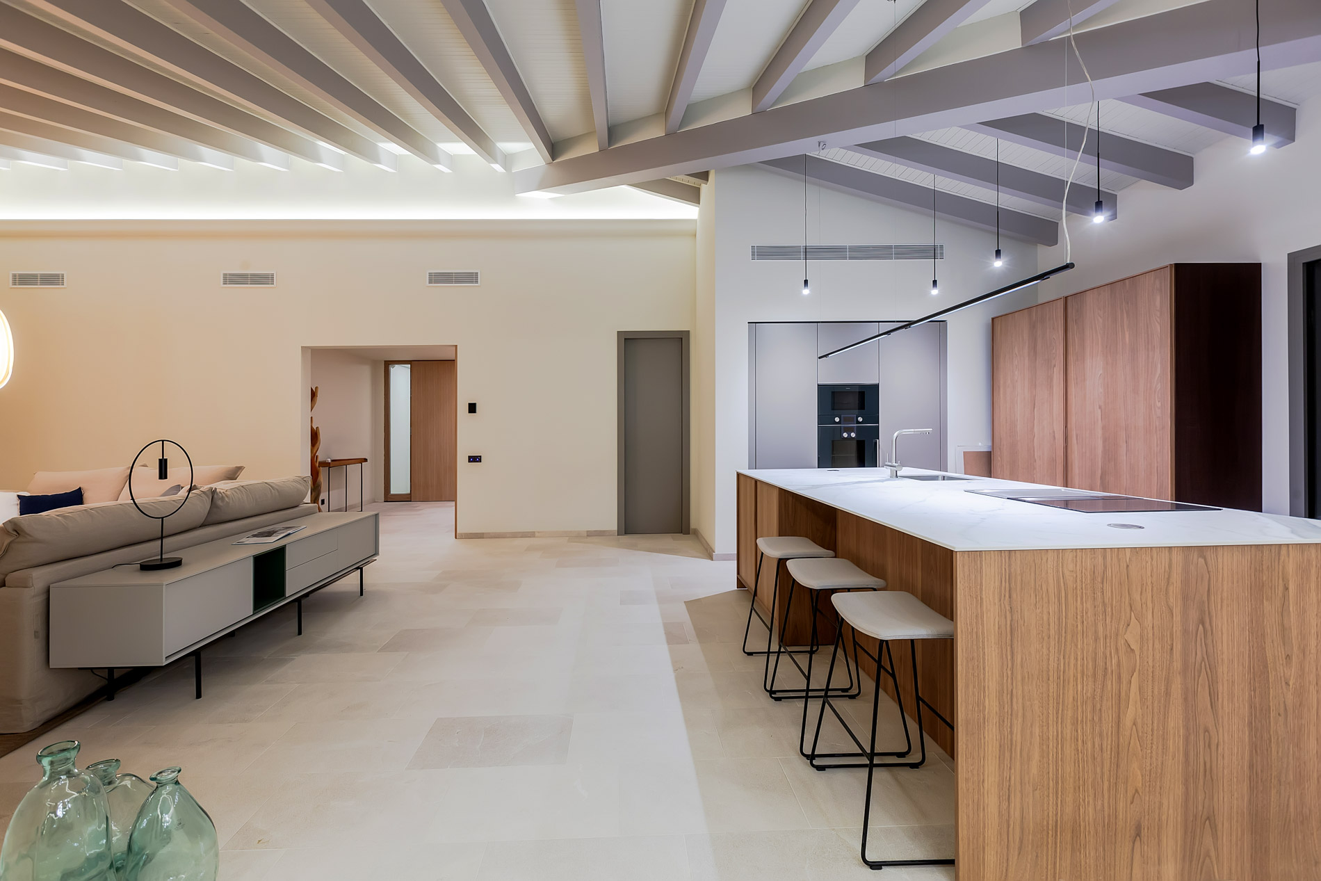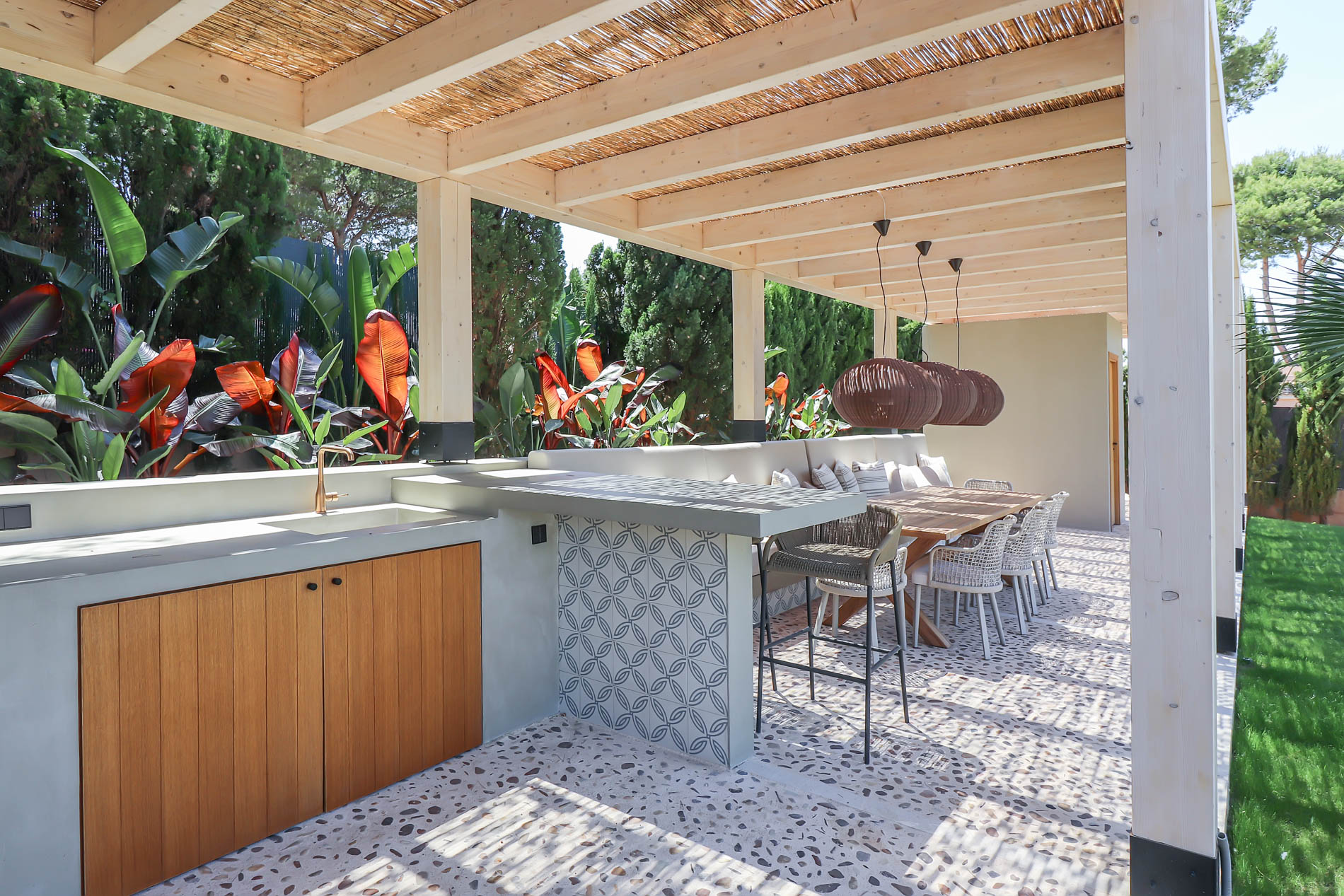 Esta villa es la casa de verano perfecta para cualquier persona que busca una casa de lujo atemporal y contemporánea en Mallorca, y que valora la individualidad. Es estilísticamente la combinación perfecta de una finca mediterránea y una villa moderna. El promotor ha creado el concepto de una generosa villa en una sola planta, sin escaleras, para un concepto de vida orientado a la familia. La sala de estar tiene una construcción de vigas visibles con techos altos. A destacar la cocina abierta con acceso a comedor/salón club de playa privado o "Chiringuito". Esta área, que está justo al lado de la piscina, ofrece todo lo que necesita en los calurosos días de verano ... una pequeña cocina al aire libre con bar donde puede preparar tapas o cócteles, un acogedor salón con una rústica mesa de comedor de madera para el almuerzo informal o Barbacoa con amigos. Relájese y disfrute el día junto a la piscina bajo una pérgola con sombra, beba bebidas frías y vea a los niños jugar en la piscina. Este "Chiringuito" garantiza una verdadera calidad de vida y está en días calurosos, sin duda el centro de la casa. Aparte de la piscina en sí, por supuesto.El jardín mediterráneo está bellamente iluminado por la noche y también ofrece áreas de césped donde los niños pueden jugar de manera segura. MallorcaSite, su agencia inmobiliaria en Mallorca, le recomienda esa propiedad por sus excelentes acabados, por su zona y por ser ideal para familias.