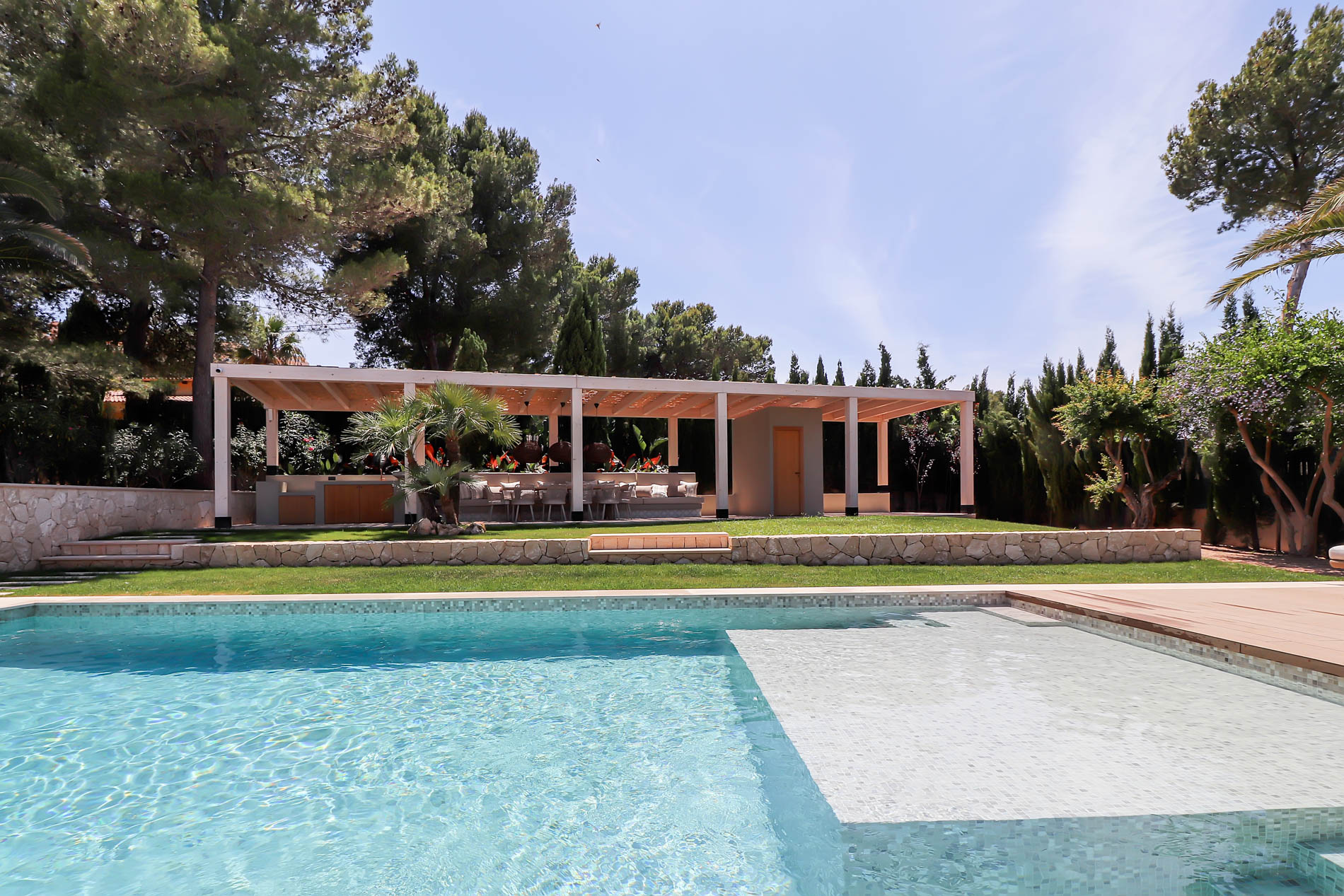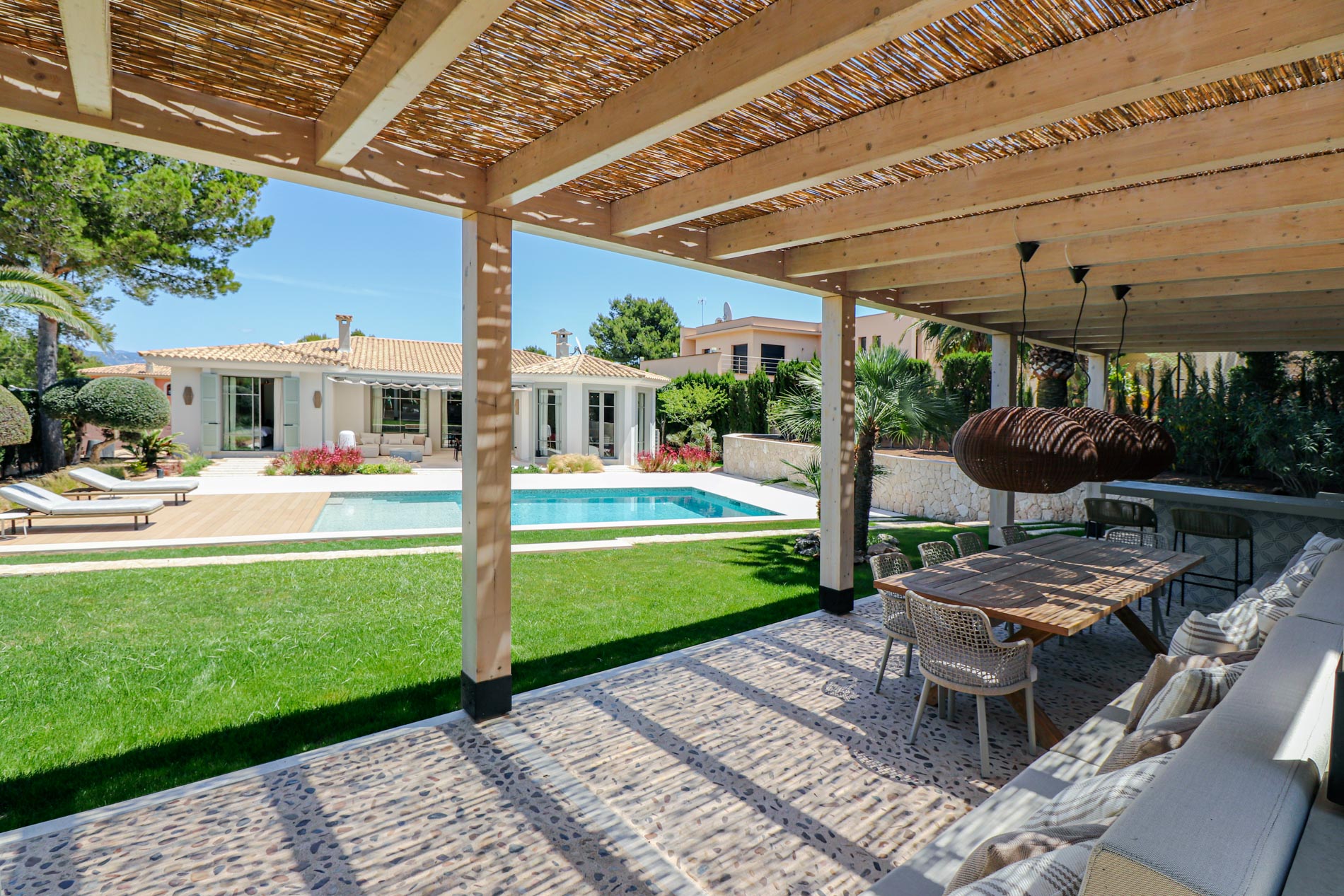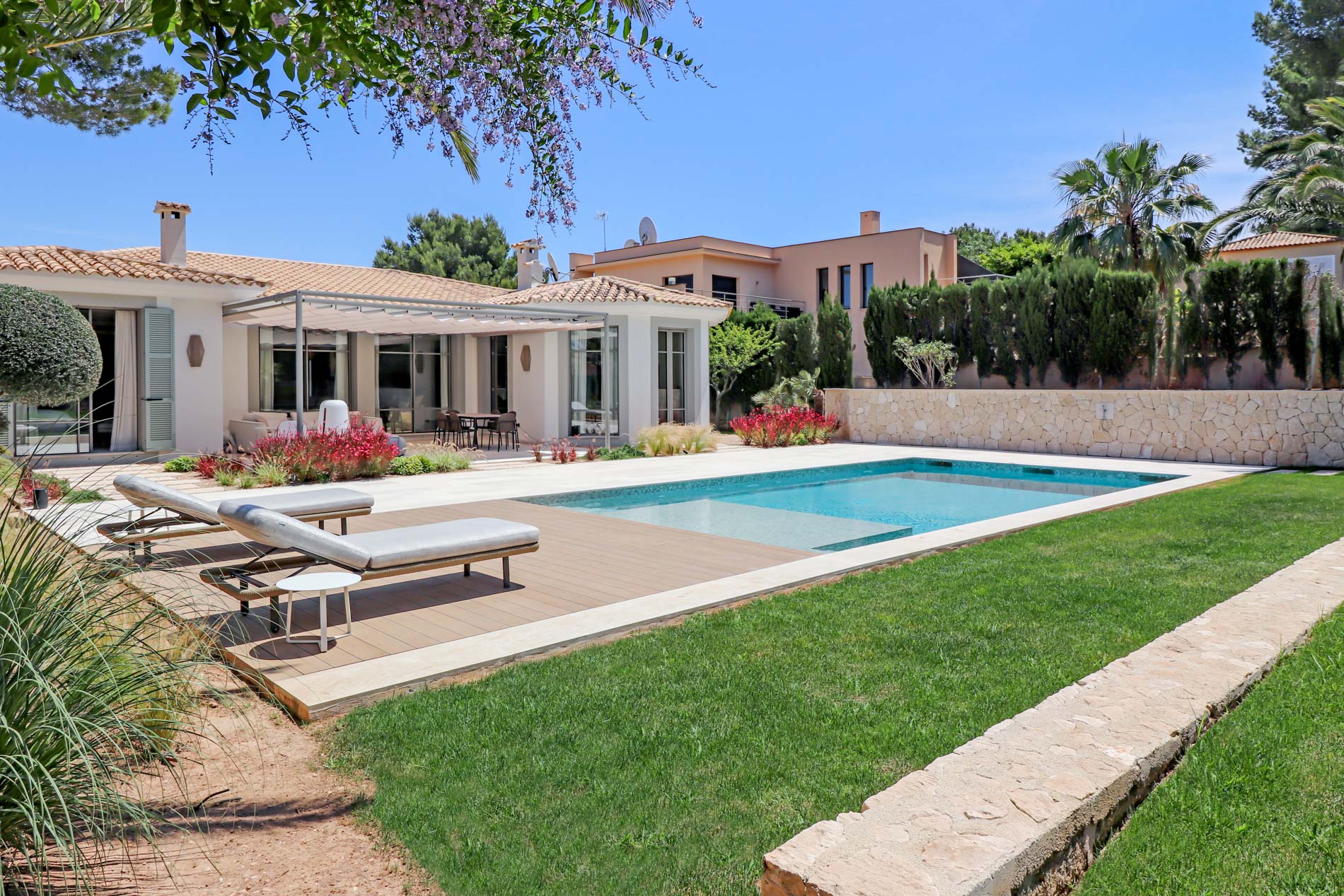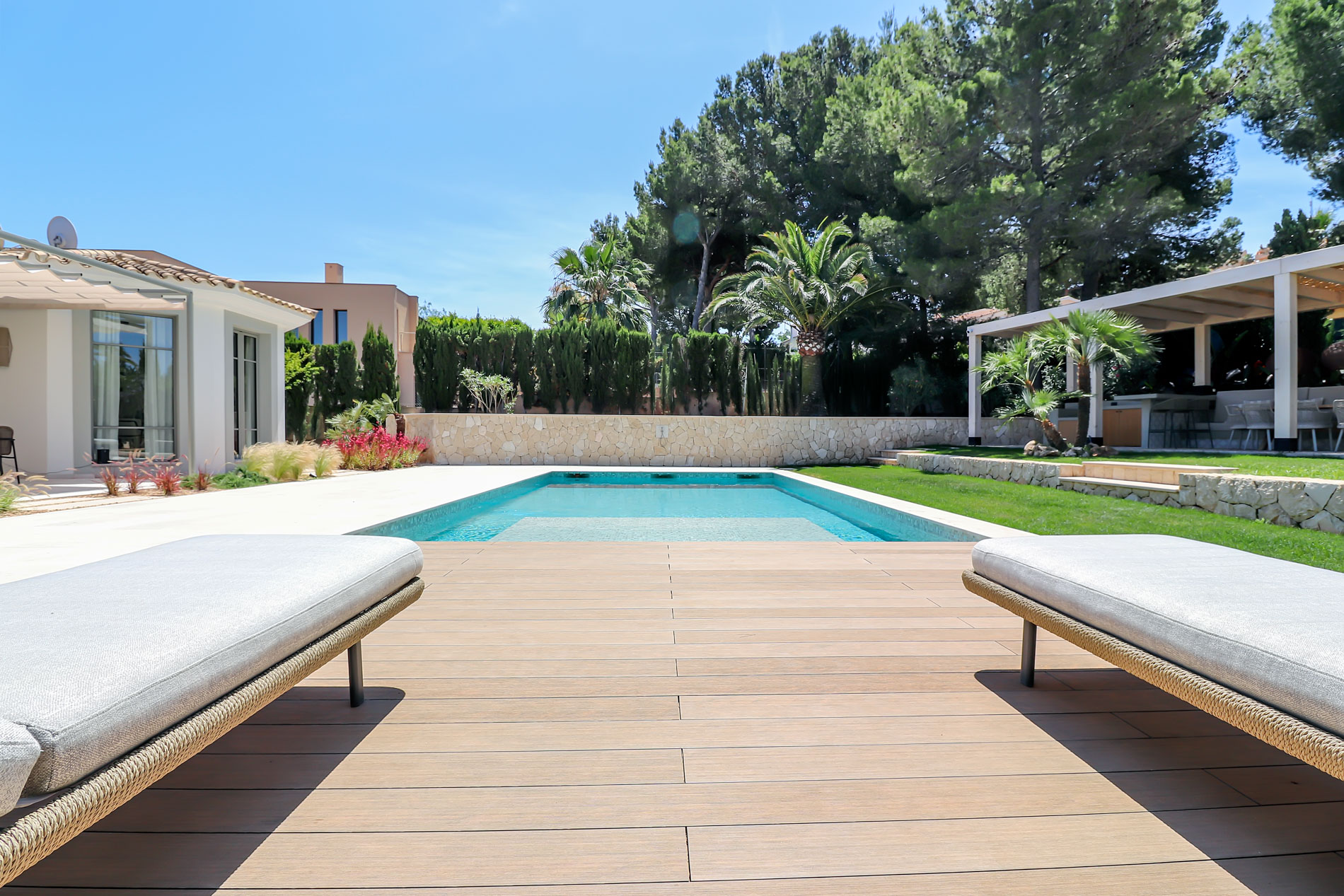 Esta villa es la casa de verano perfecta para cualquier persona que busca una casa de lujo atemporal y contemporánea en Mallorca, y que valora la individualidad. Es estilísticamente la combinación perfecta de una finca mediterránea y una villa moderna. El promotor ha creado el concepto de una generosa villa en una sola planta, sin escaleras, para un concepto de vida orientado a la familia. La sala de estar tiene una construcción de vigas visibles con techos altos. A destacar la cocina abierta con acceso a comedor/salón club de playa privado o "Chiringuito". Esta área, que está justo al lado de la piscina, ofrece todo lo que necesita en los calurosos días de verano ... una pequeña cocina al aire libre con bar donde puede preparar tapas o cócteles, un acogedor salón con una rústica mesa de comedor de madera para el almuerzo informal o Barbacoa con amigos. Relájese y disfrute el día junto a la piscina bajo una pérgola con sombra, beba bebidas frías y vea a los niños jugar en la piscina. Este "Chiringuito" garantiza una verdadera calidad de vida y está en días calurosos, sin duda el centro de la casa. Aparte de la piscina en sí, por supuesto.El jardín mediterráneo está bellamente iluminado por la noche y también ofrece áreas de césped donde los niños pueden jugar de manera segura. MallorcaSite, su agencia inmobiliaria en Mallorca, le recomienda esa propiedad por sus excelentes acabados, por su zona y por ser ideal para familias.